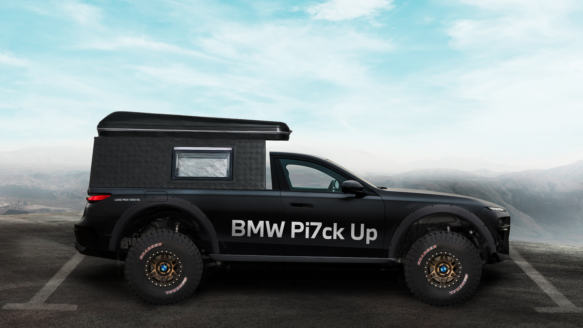 April Fools’ Day was nearly a week ago, but it’s only now we’ve discovered the prank BMW Slovakia tried to pull on us. The pompously called “Pi7ck Up Adventure Glamping Expedition Version” is a digital (and purely hypothetical) interpretation of the i7 Sedan as an electric pickup truck. It boasts chunky plastic body cladding around the wheel arches, which host meaty off-road tires for go-anywhere capabilities.