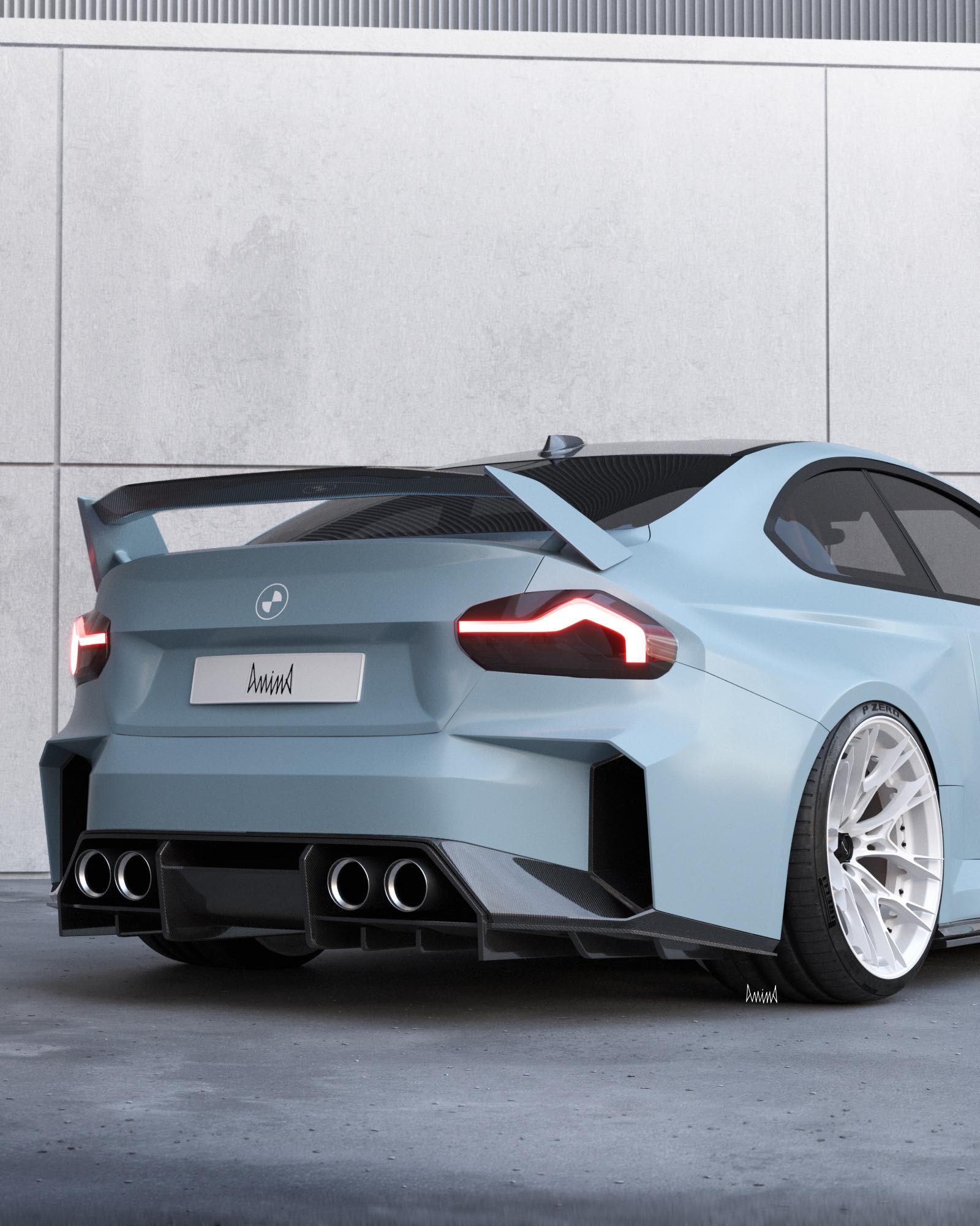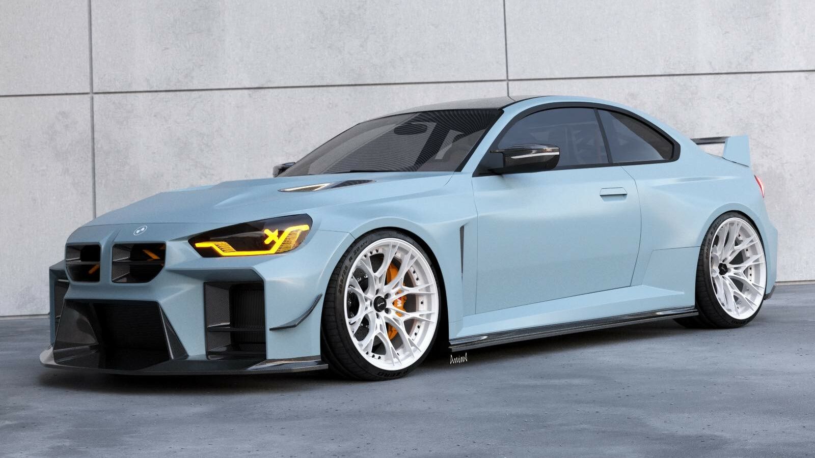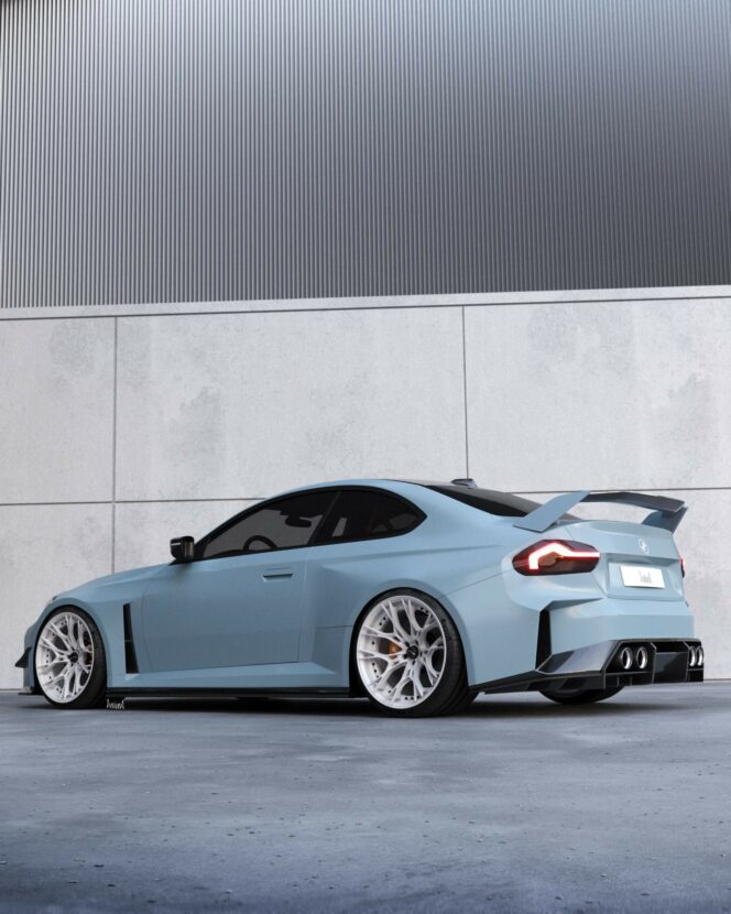 The hypothetical track-focused build has been envisioned as a two-seater slammed to the road on aftermarket three-piece Dillinger forged white wheels wrapped around in Pirelli P Zero tires. The artist decided to go with a light blue shade reminiscent of BMW’s own Zandvoort Blue, a paint currently exclusive to the new M2.