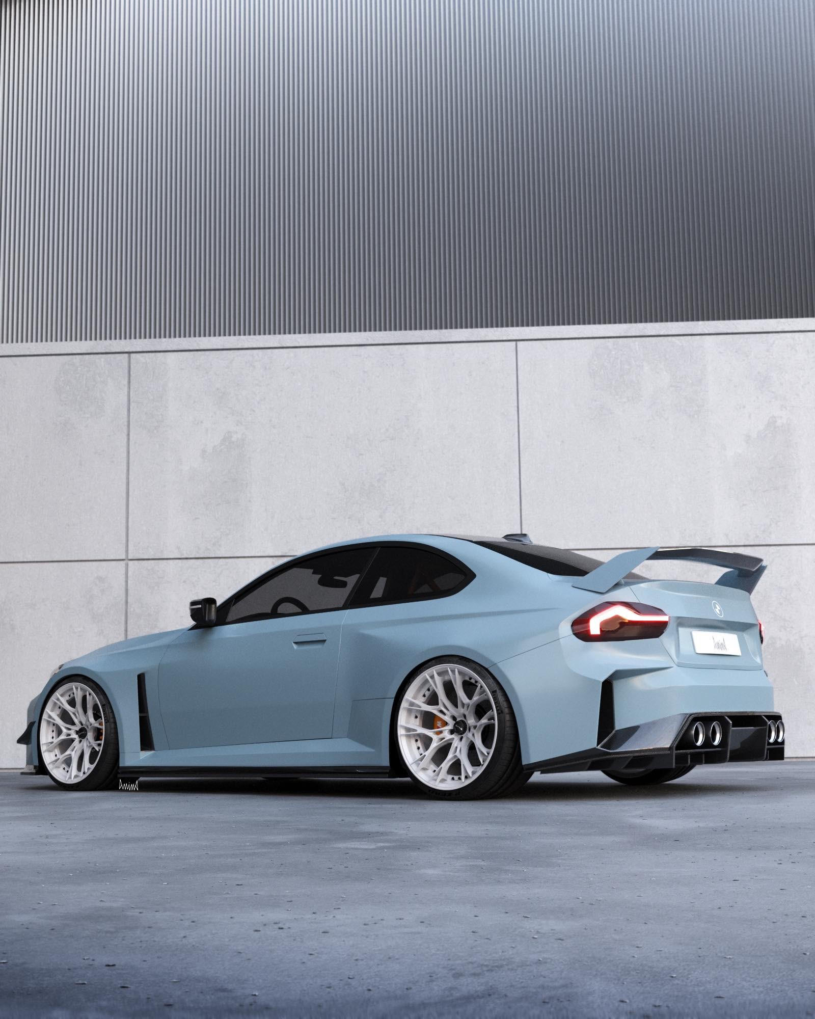 The hypothetical track-focused build has been envisioned as a two-seater slammed to the road on aftermarket three-piece Dillinger forged white wheels wrapped around in Pirelli P Zero tires. The artist decided to go with a light blue shade reminiscent of BMW’s own Zandvoort Blue, a paint currently exclusive to the new M2.