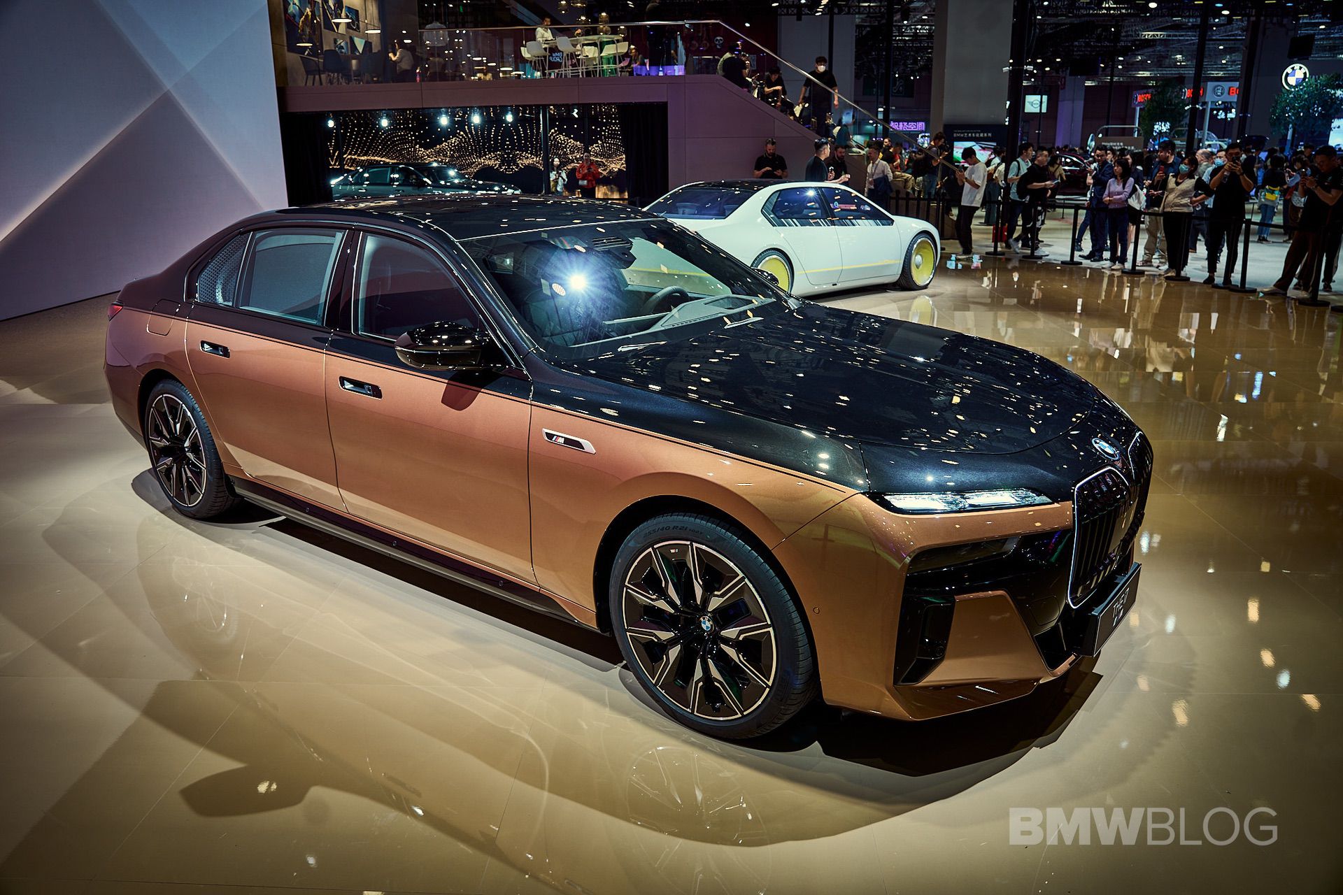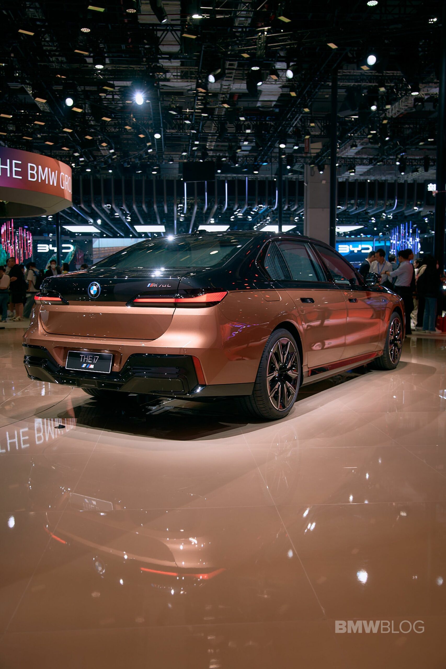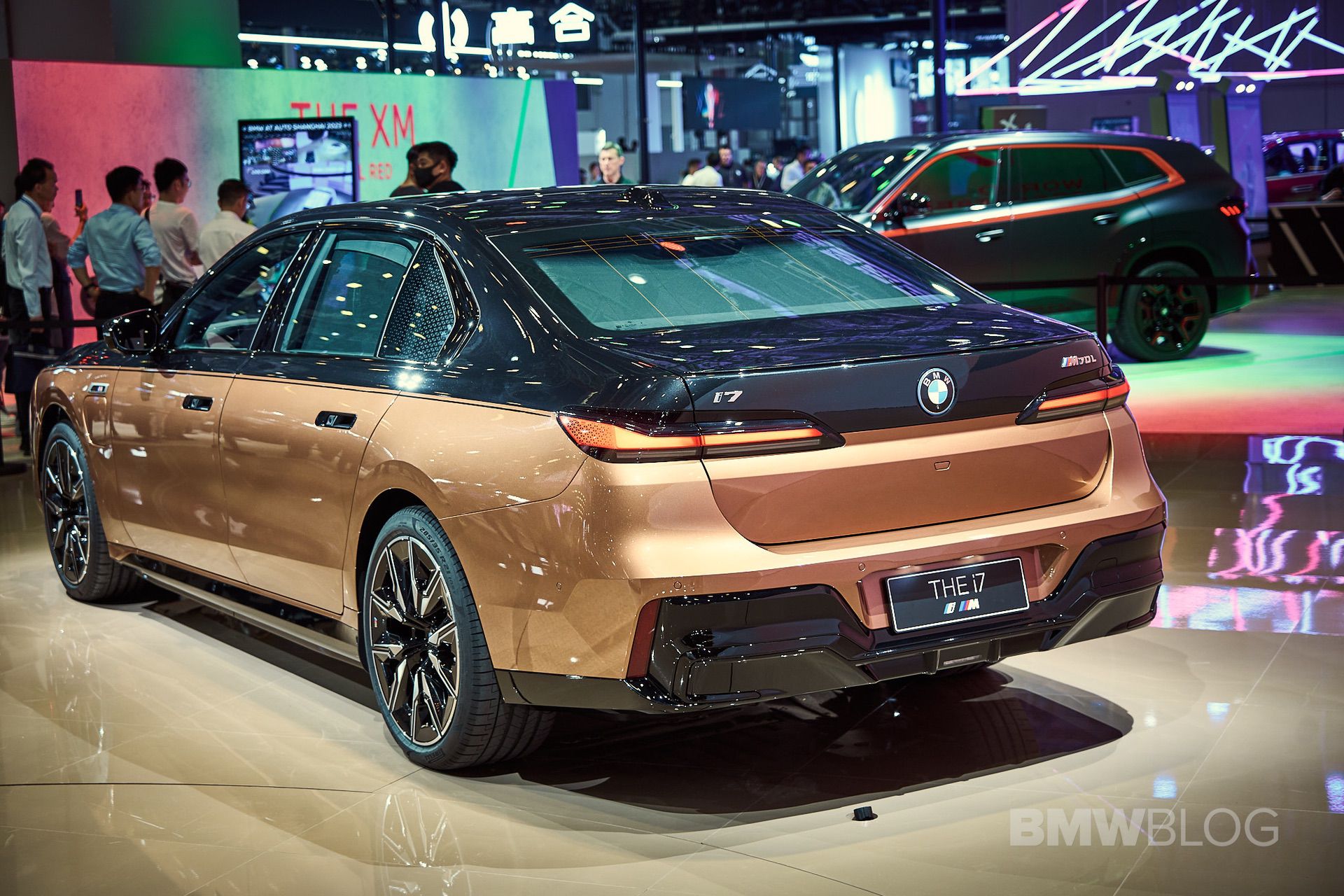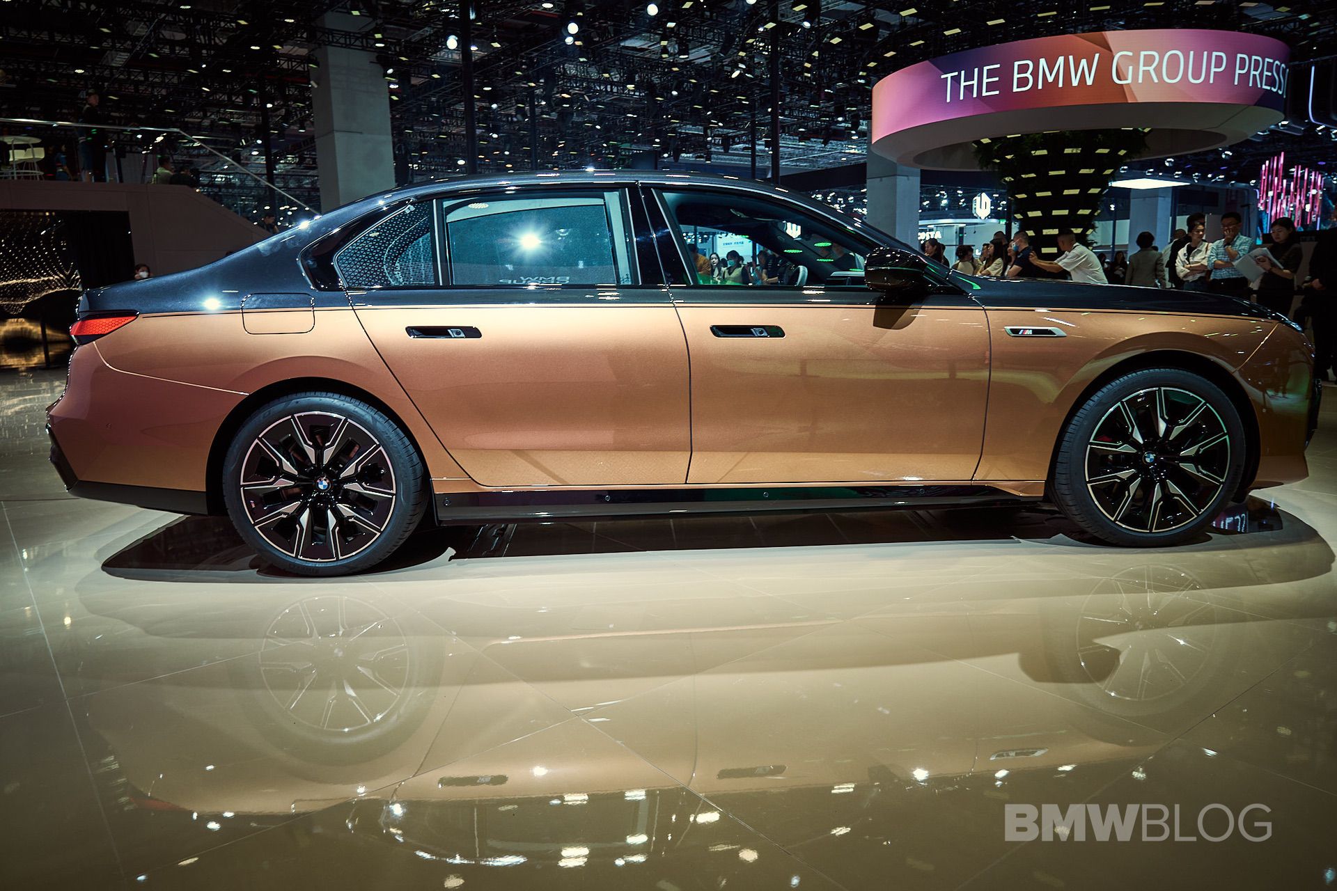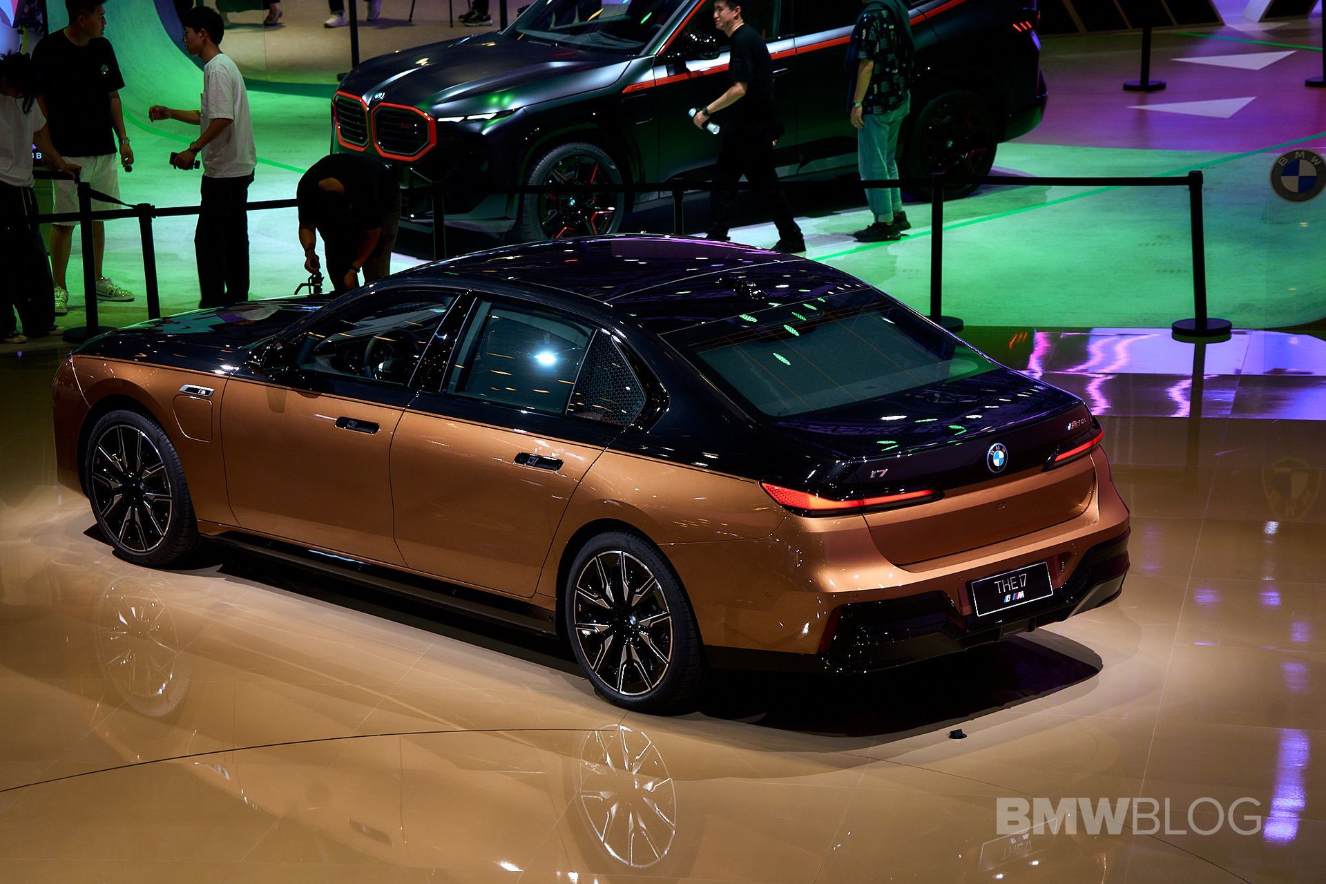 We spent some quality time with the 650-horsepower silent luxobarge and its new Liquid Copper and Black Sapphire color combo. Since the M850i was facelifted last year, BMW has been putting M badges on the grilles of M Performance models, and this i7 M70 is no exception. A massive vehicle deserves a large illuminated kidney grille, and it now has a glossy black surround for the first time on the i7. The showcar from Shanghai has 21-inch wheels with a two-tone look and metallic inserts, with black M Sport brake calipers lurking from behind.