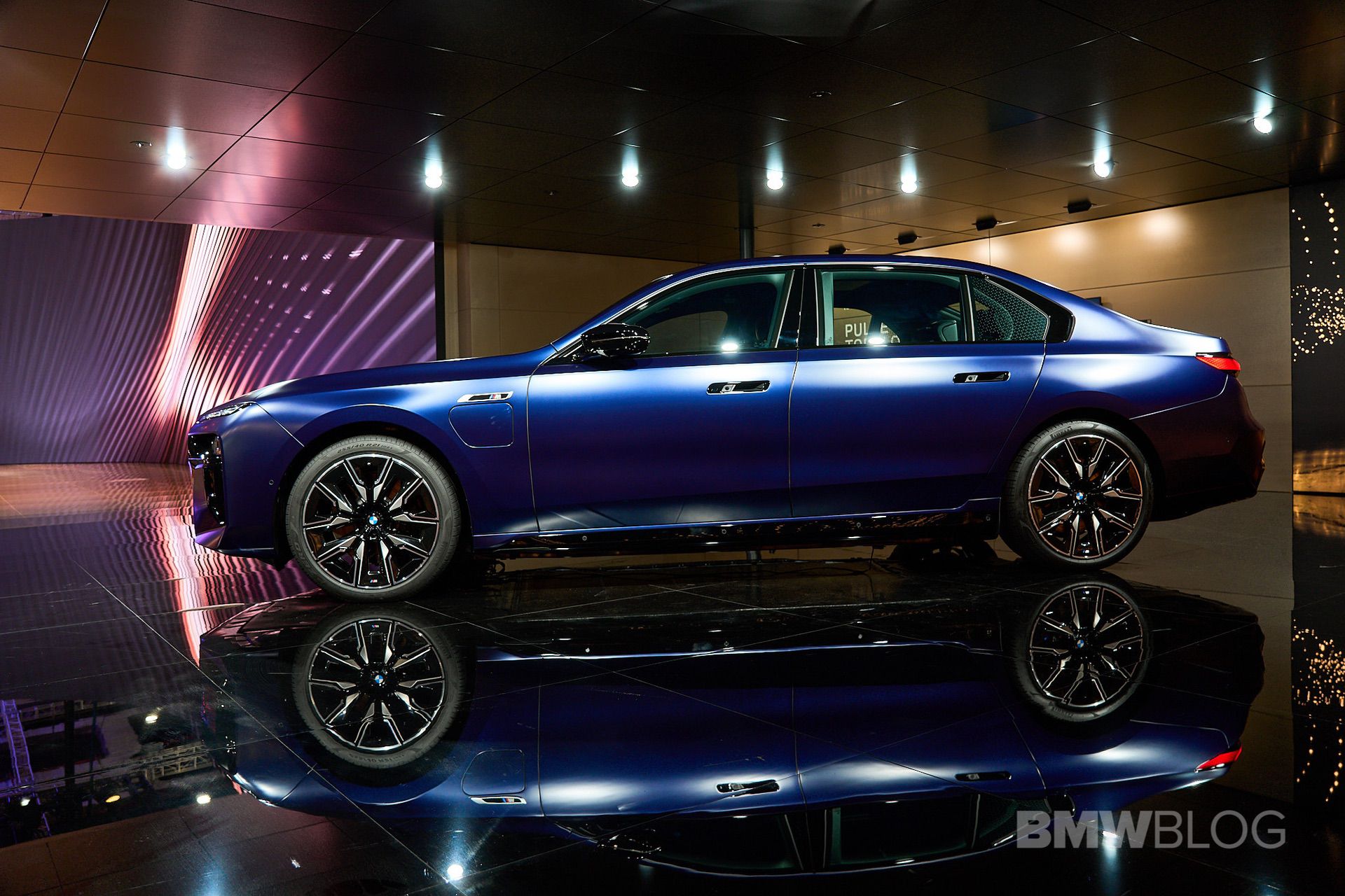 Frozen Tanzanite Blue was added to the 7 Series’s color palette at the beginning of the year, so this is our first opportunity to see the G70 with its attractive matte paint. BMW mentions these Frozen paints are chemically identical to equivalents using fossil raw materials and are in no way inferior in terms of quality compared to other paints. The German luxury brand points out that CO2 emissions associated with the production, transport, and processing of crude oil are eliminated by using renewable raw materials instead.