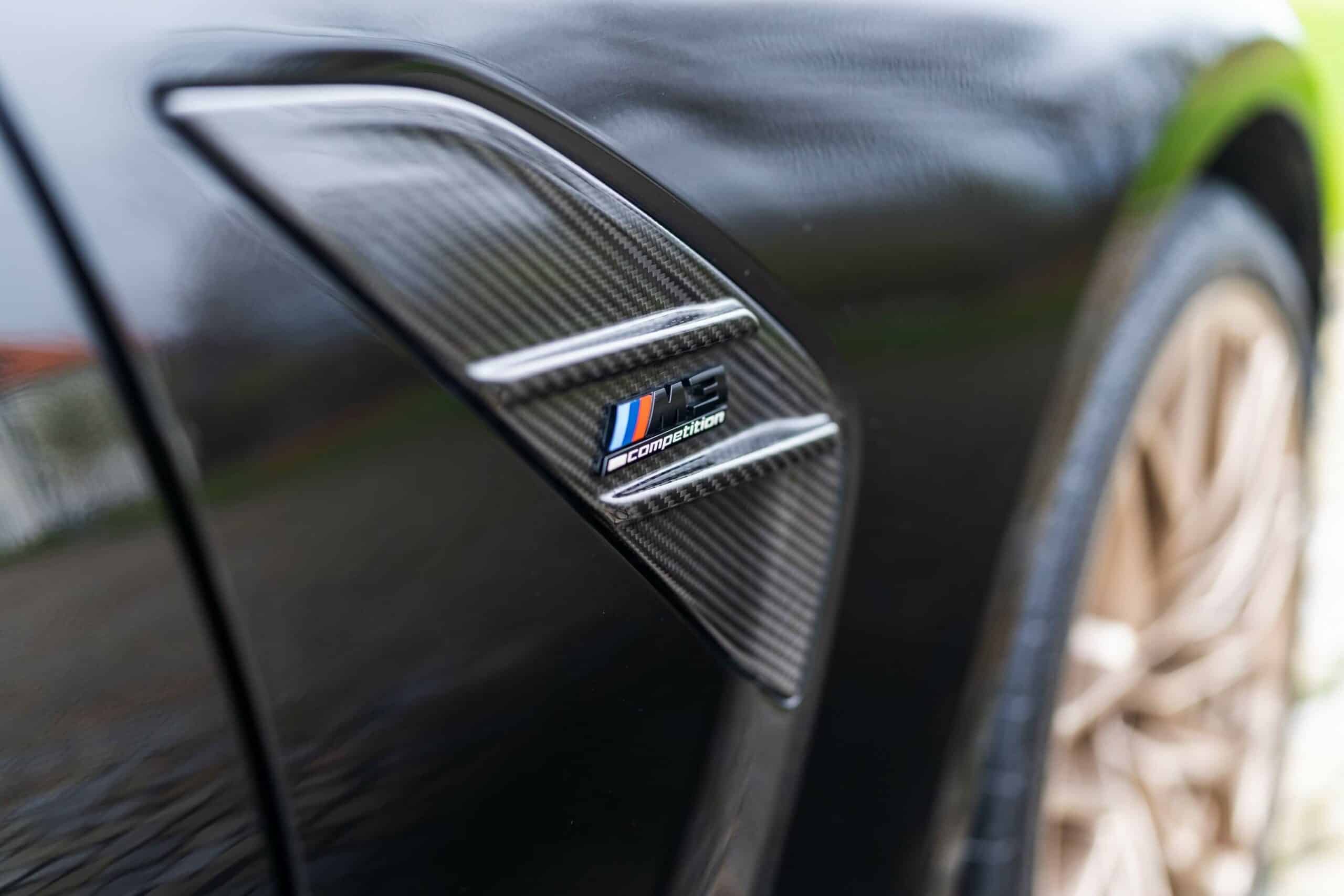 We’re always saying canards on a road-going car are overkill, and it’s especially true here on a station wagon. The prominent front splitter and chunky side skirts lend the first-ever M3 estate a more muscular appearance, while the rear diffuser has also been bathed in carbon fiber. This high-specification build has the Shadowline headlights and proudly wears the 50 years of M anniversary emblems at the front and rear.