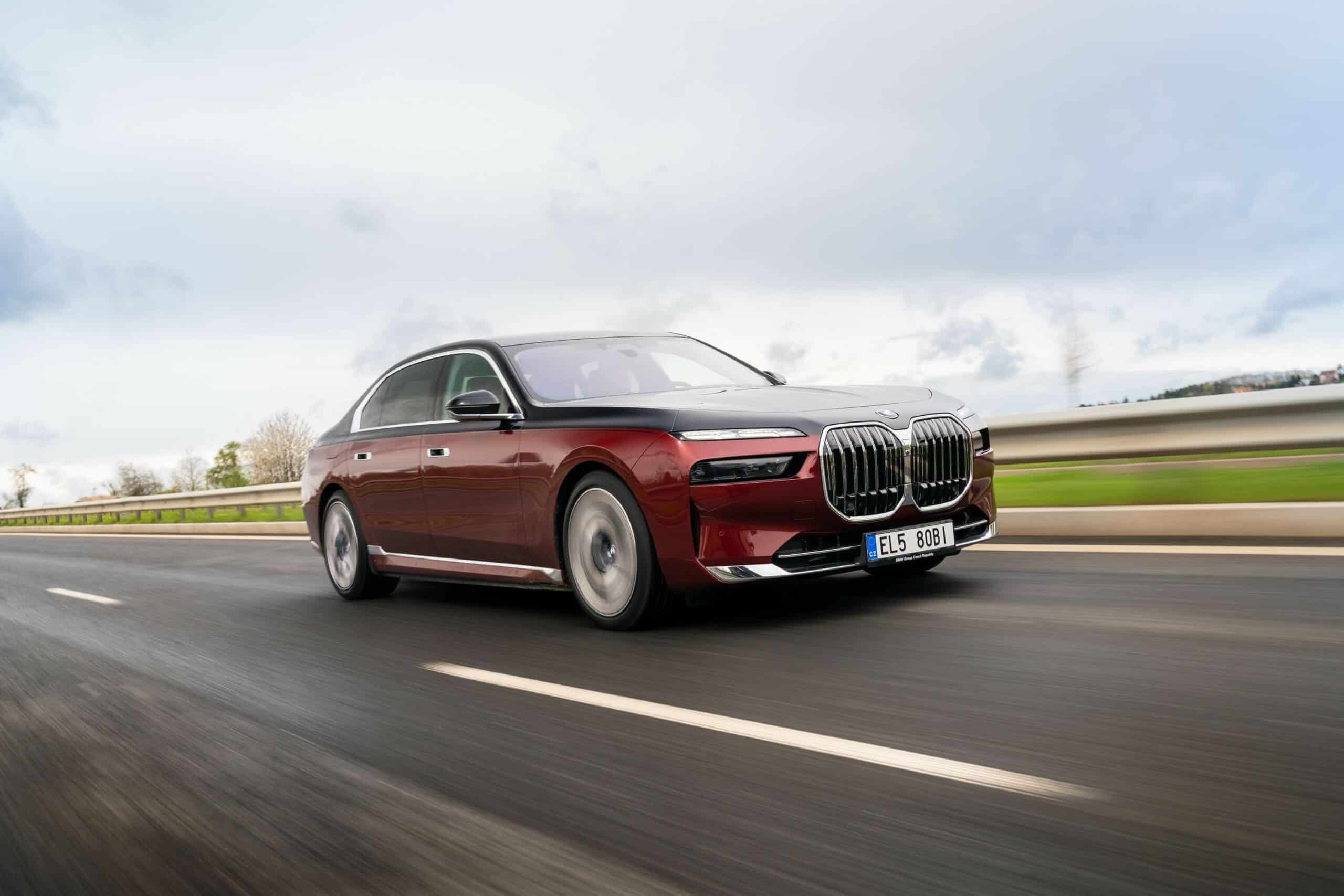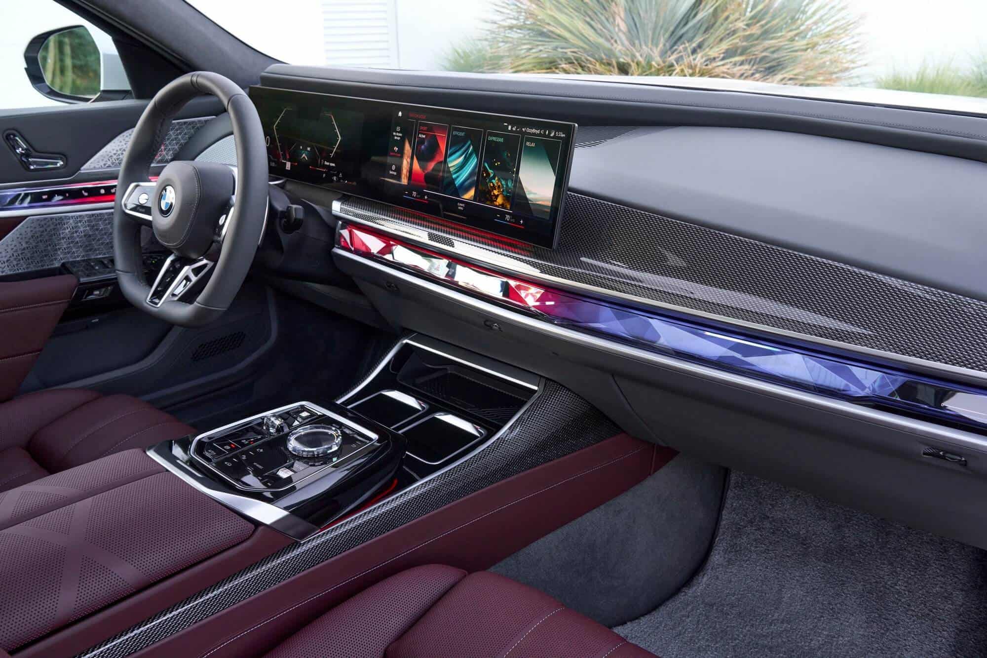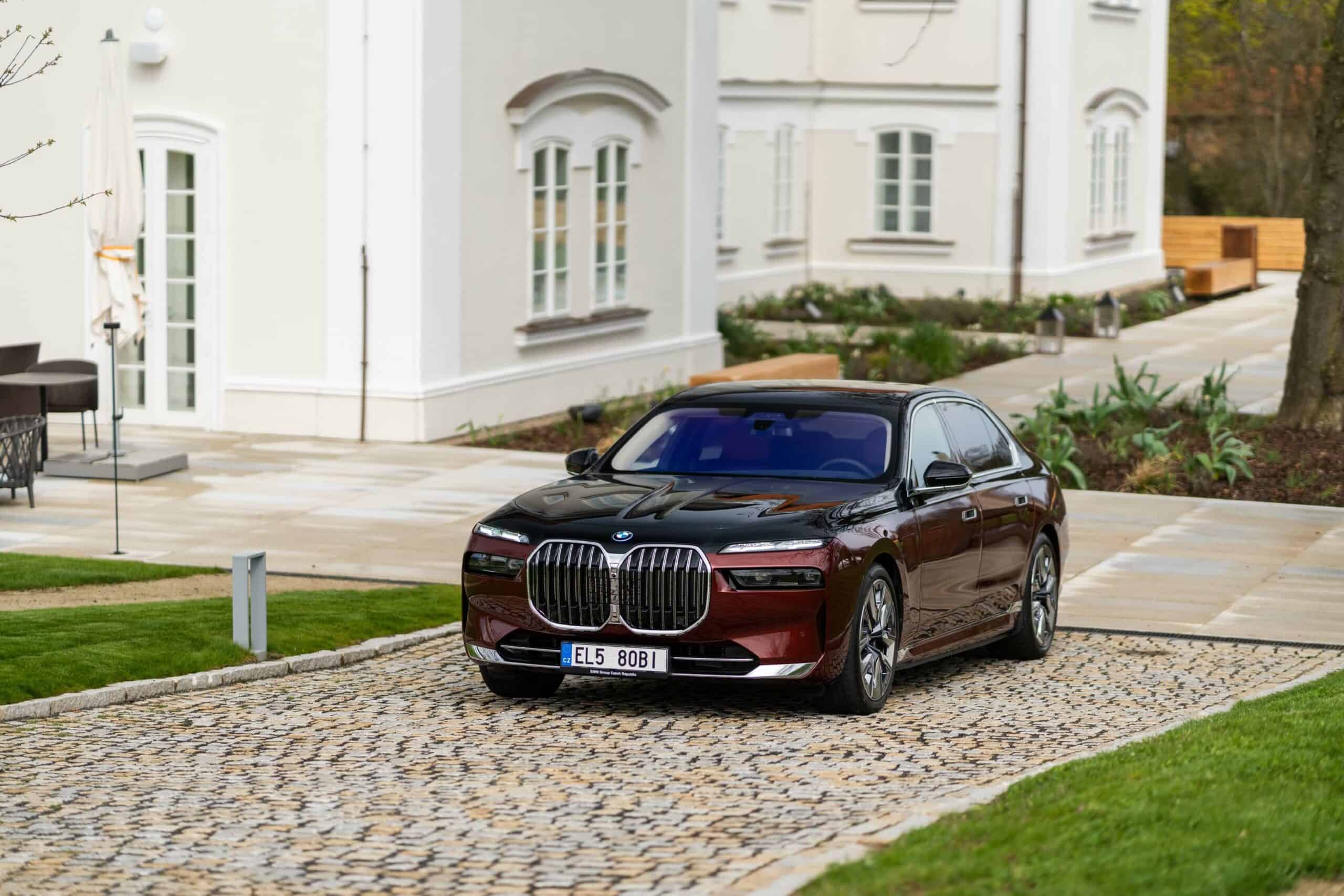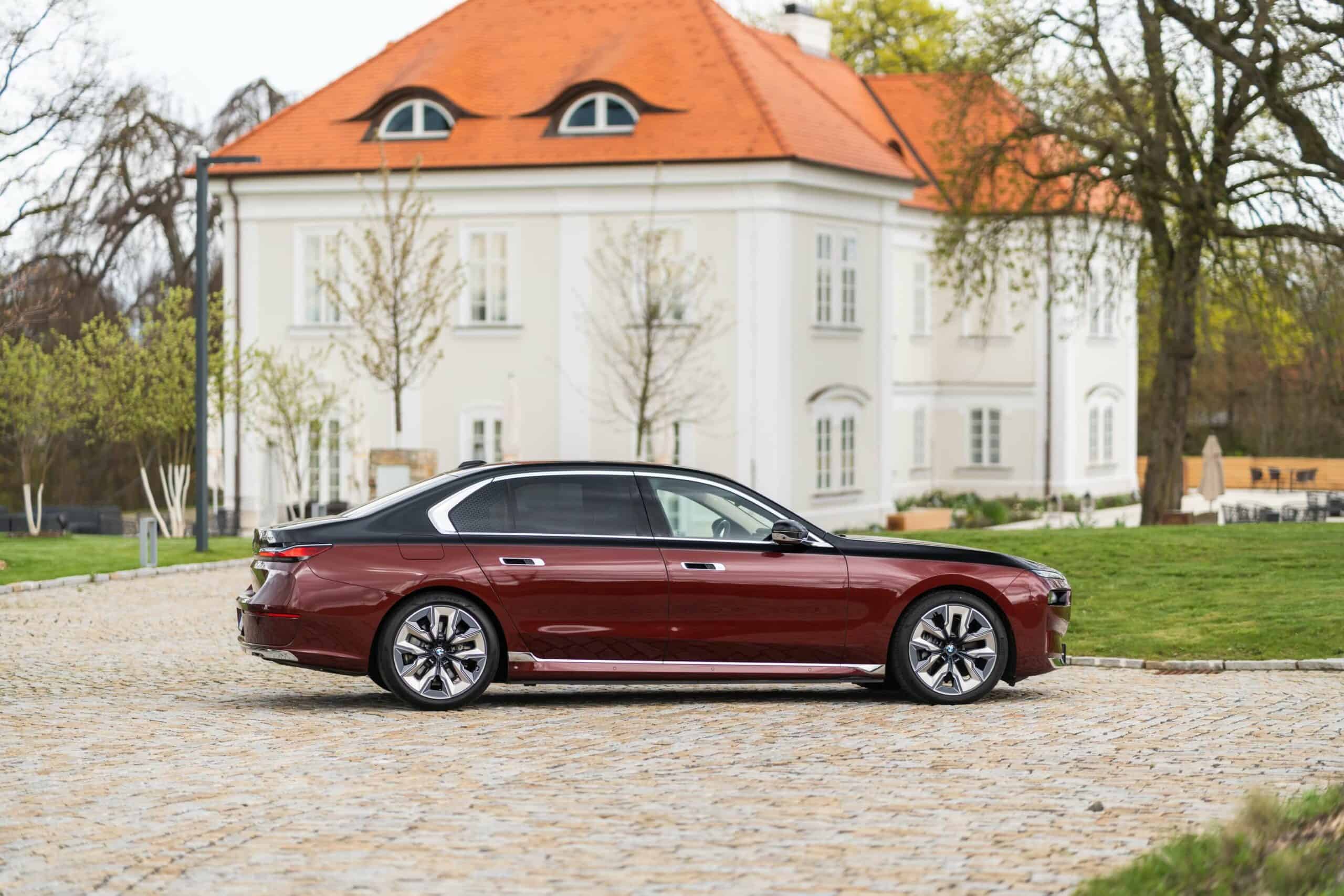 As you can probably tell by the chrome accents, it does away with the M Sport Package (or the M Sport Package Pro) and sticks to the base Design Pure Excellence trim. The Mercedes S-Class rival is wearing a two-tone paint by combining Aventurine Red Metallic for the bottom half of the body with Sapphire Black for the upper section. It rides on the larger 21-inch wheels featuring a bi-color finish.