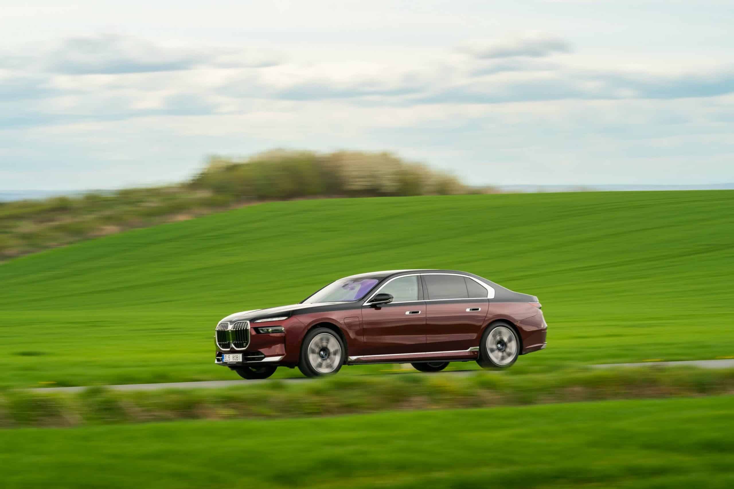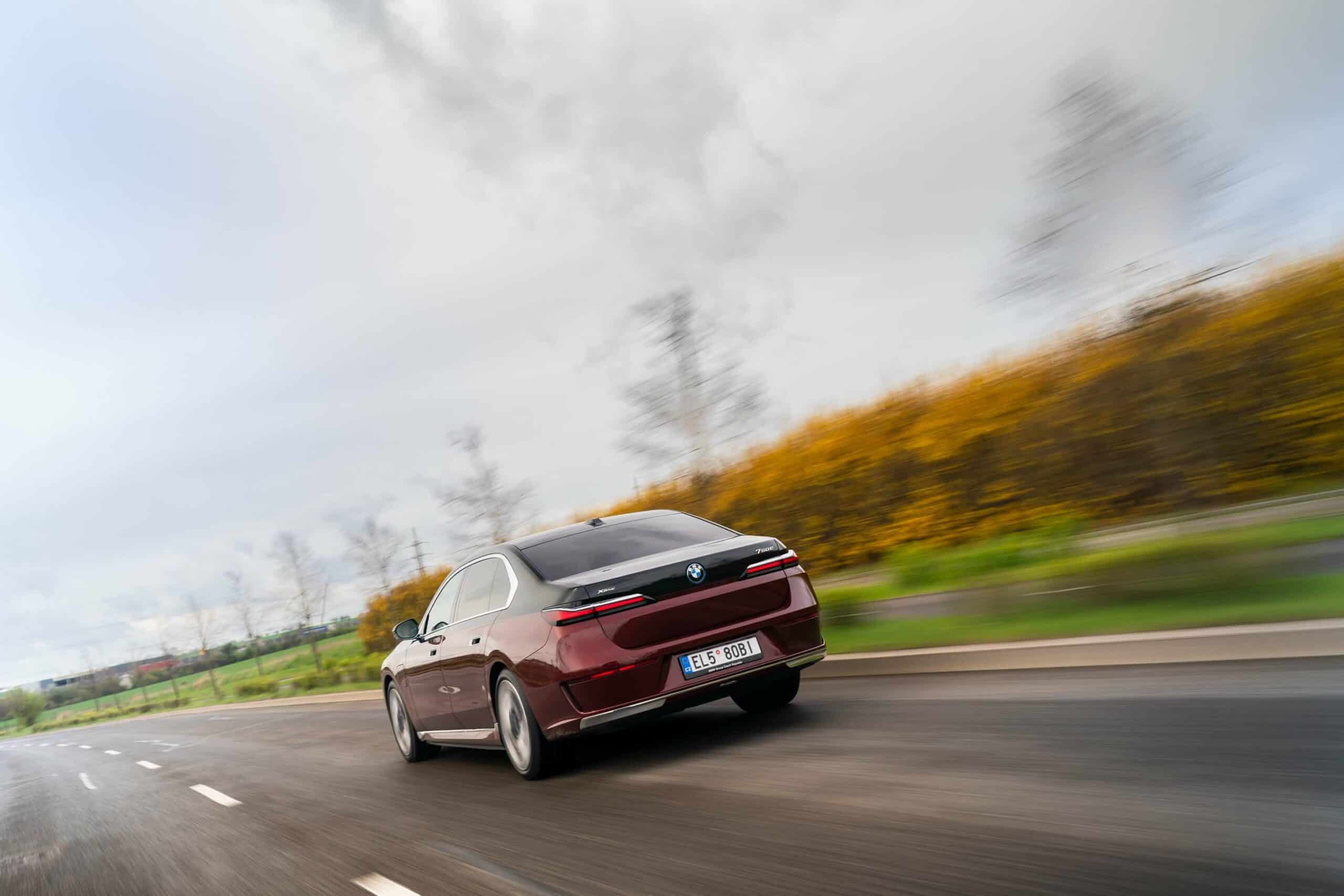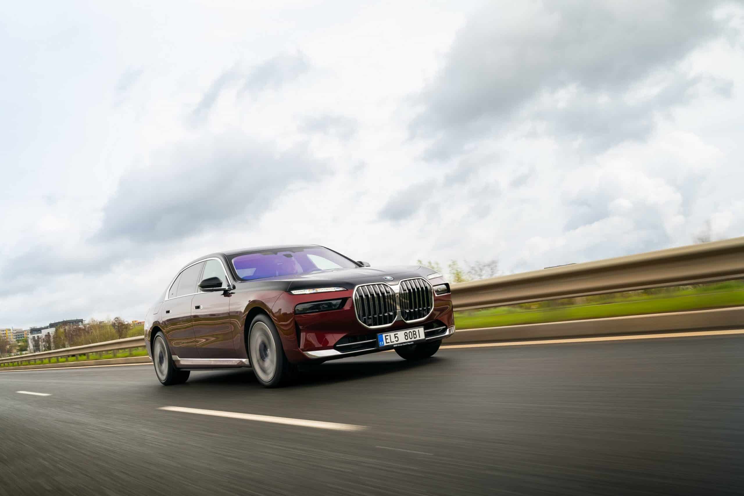 As you can probably tell by the chrome accents, it does away with the M Sport Package (or the M Sport Package Pro) and sticks to the base Design Pure Excellence trim. The Mercedes S-Class rival is wearing a two-tone paint by combining Aventurine Red Metallic for the bottom half of the body with Sapphire Black for the upper section. It rides on the larger 21-inch wheels featuring a bi-color finish.