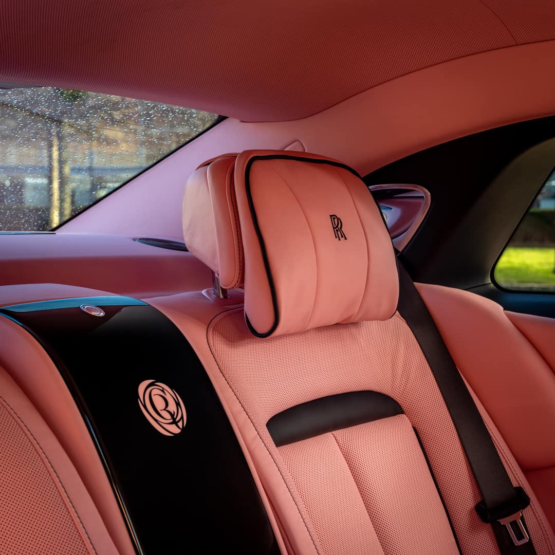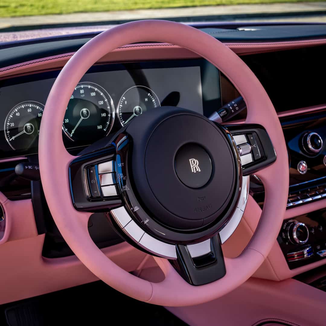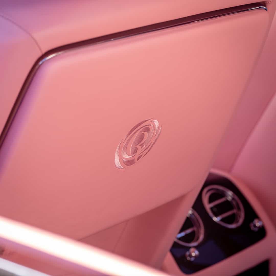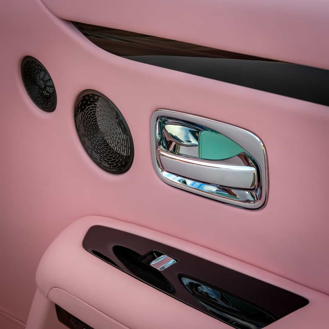 The client shared almost 100 different pink color swatches, as part of a mood board, with Rolls-Royce in Goodwood. After analyzing her mood board, the team at Rolls came up with 30 different paint colors and Champagne Rose, with a Crystal finish, was the one chosen by the client. That metallic pink is contrasted by chrome trim and black wheels, the latter of which have body color-matched rings round the “RR” logos. It’s a delicious looking color that makes me crave fancy pink macarons. And in case any passersby want to know the color’s name when they see this Roller on the streets of Miami, the rear quarter panel reads “Champagne Rose.”
