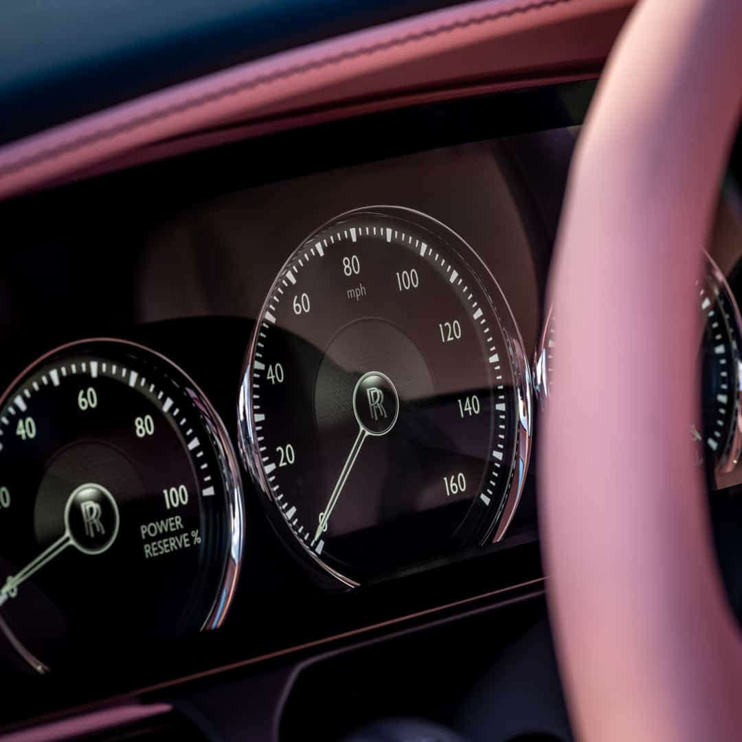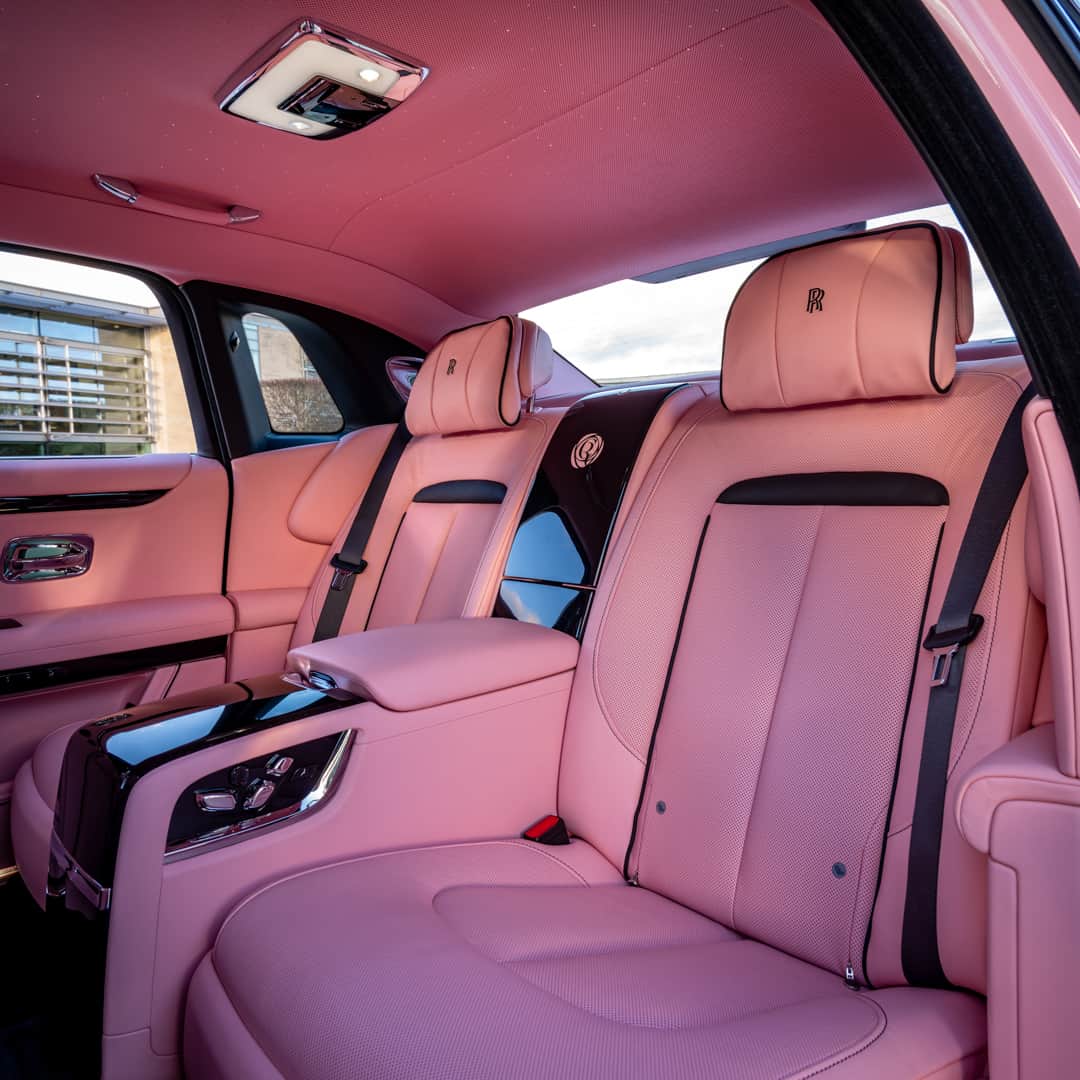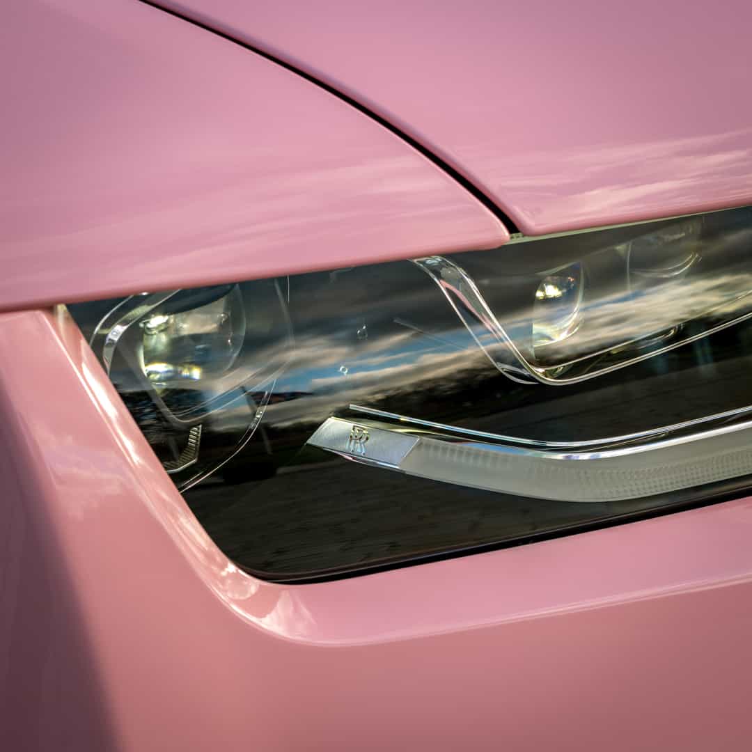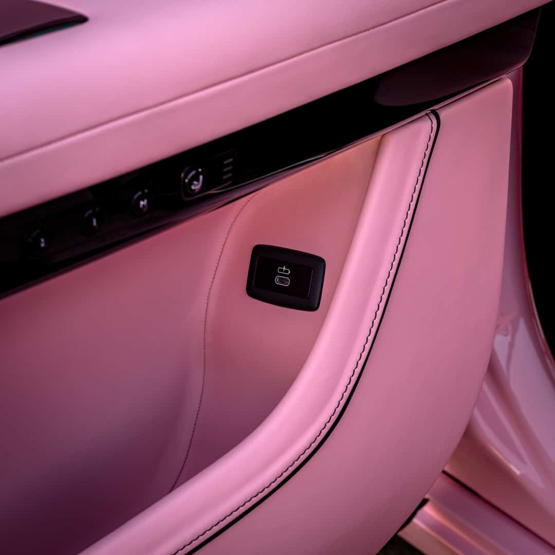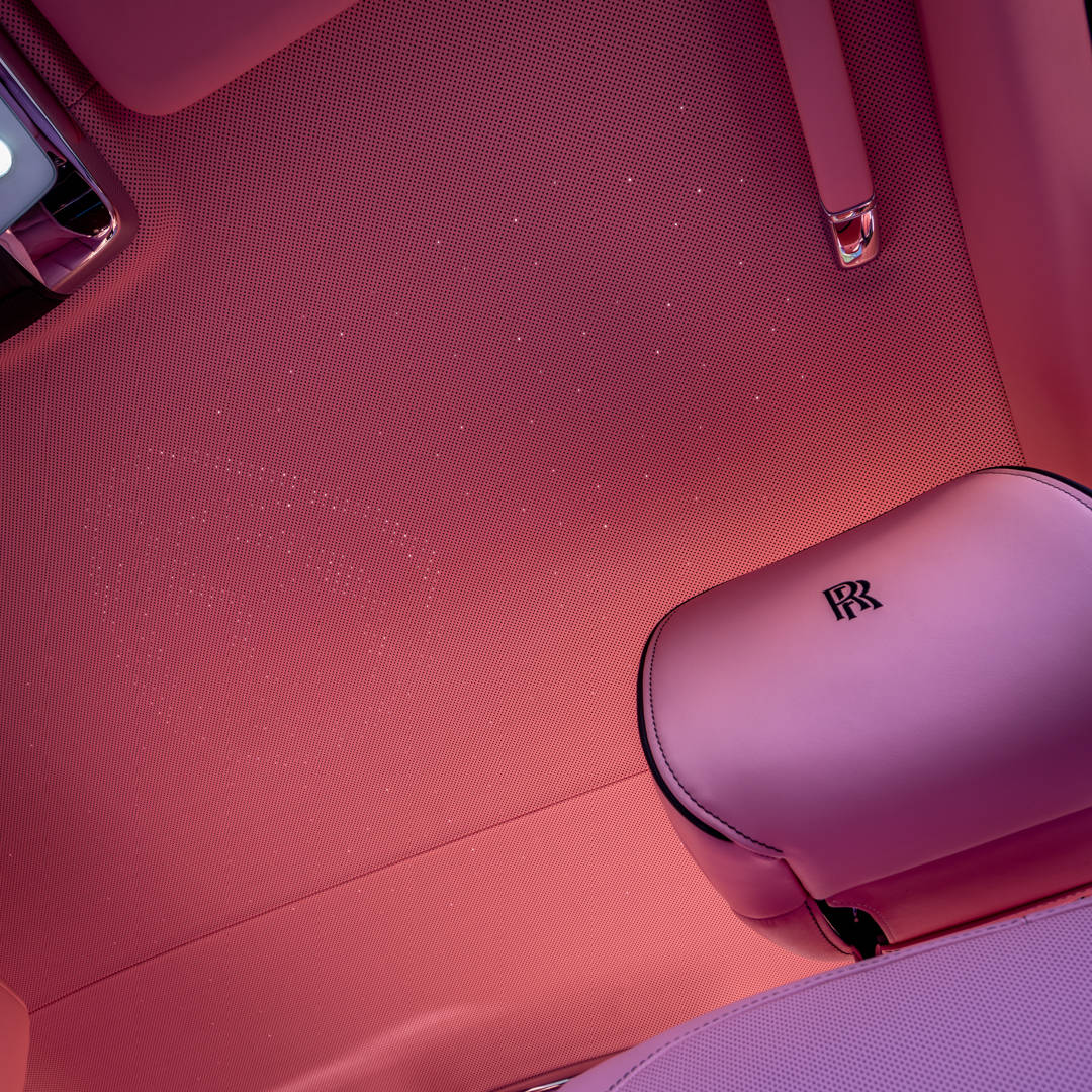 The client shared almost 100 different pink color swatches, as part of a mood board, with Rolls-Royce in Goodwood. After analyzing her mood board, the team at Rolls came up with 30 different paint colors and Champagne Rose, with a Crystal finish, was the one chosen by the client. That metallic pink is contrasted by chrome trim and black wheels, the latter of which have body color-matched rings round the “RR” logos. It’s a delicious looking color that makes me crave fancy pink macarons. And in case any passersby want to know the color’s name when they see this Roller on the streets of Miami, the rear quarter panel reads “Champagne Rose.”