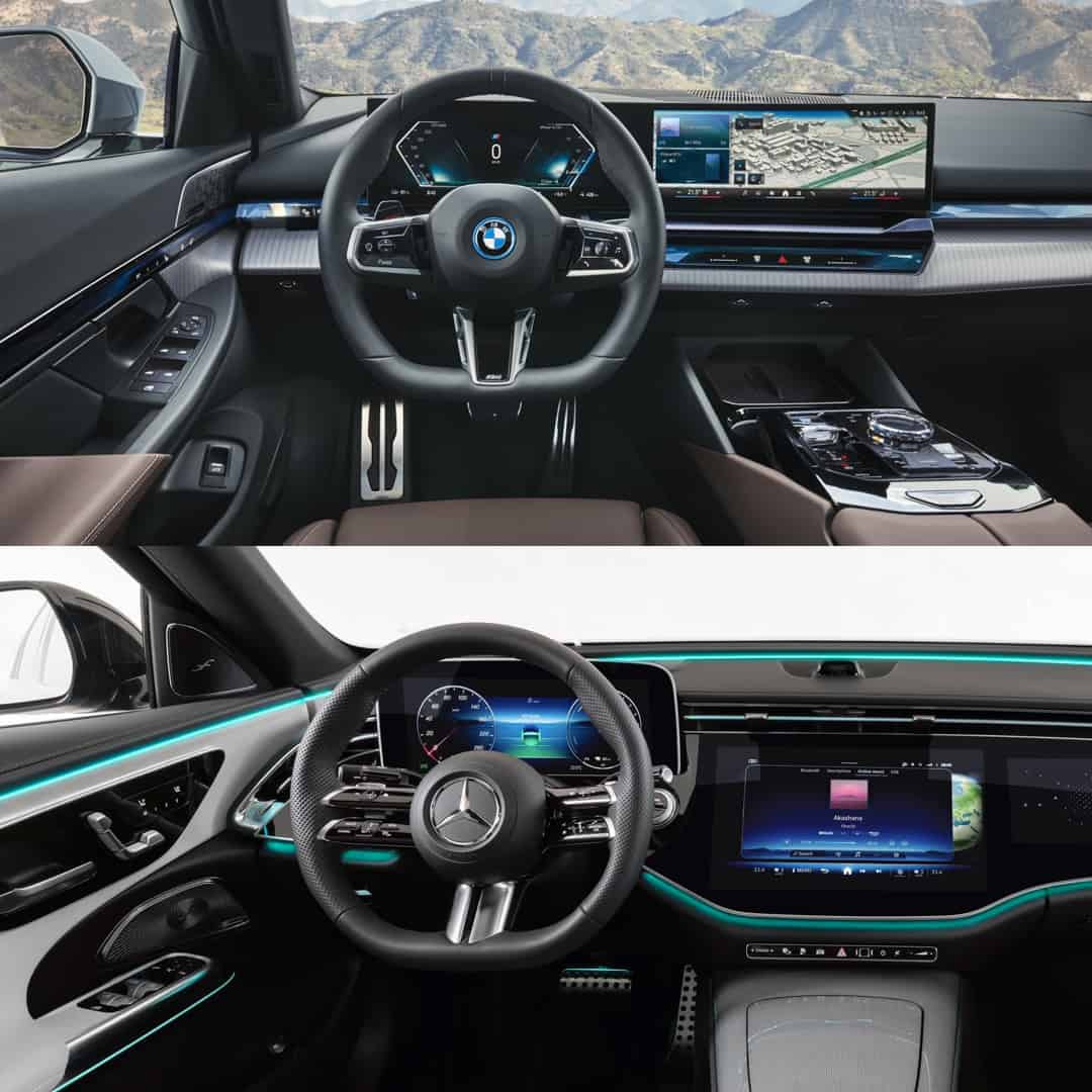BMW crushed the 7 Series interior design, so it smartly migrated that over to the 5 Series, which looks fabulous inside. It has 90 percent of the fantastic features that make the 7 Series cabin so good, just packed into a tighter, less complex version of the same design. The 5 Series has a variety of different materials, such as real wood, real leather, and real metal. While the Mercedes E-Class has nice materials, its design is domintated by its Hyperscreen, which is just code for a lot of black piano black plastic.