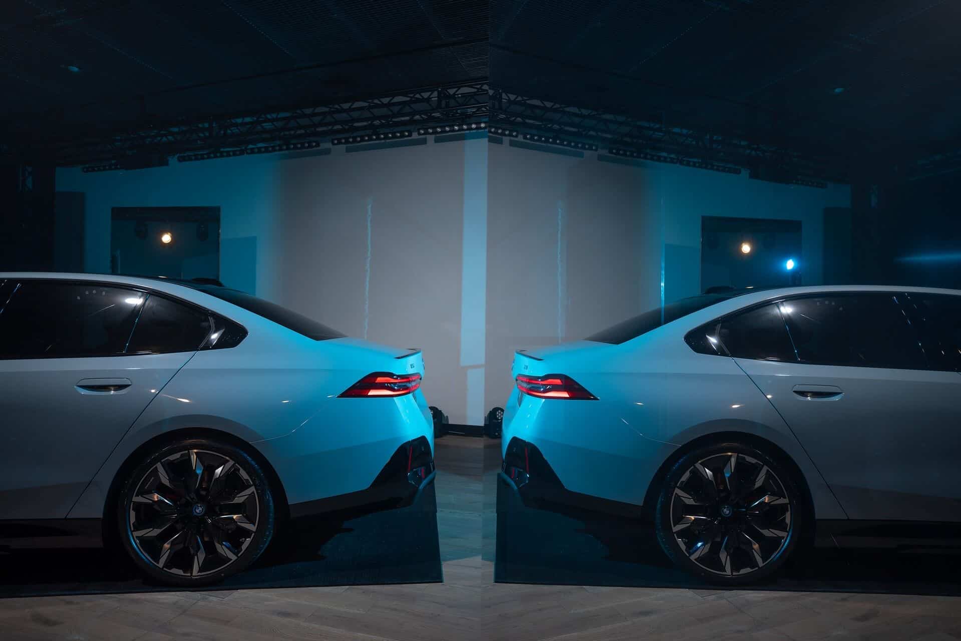 Those 21-inch wheels with a two-tone finish (954 style) are the largest available for the new 5 Series and have been combined with red calipers for the M Sport brakes. This i5 eDrive40 has blue accents in the headlights to denote we’re looking at the upgraded matrix LED setup while the black panoramic roof complements the other dark surfaces on the body.