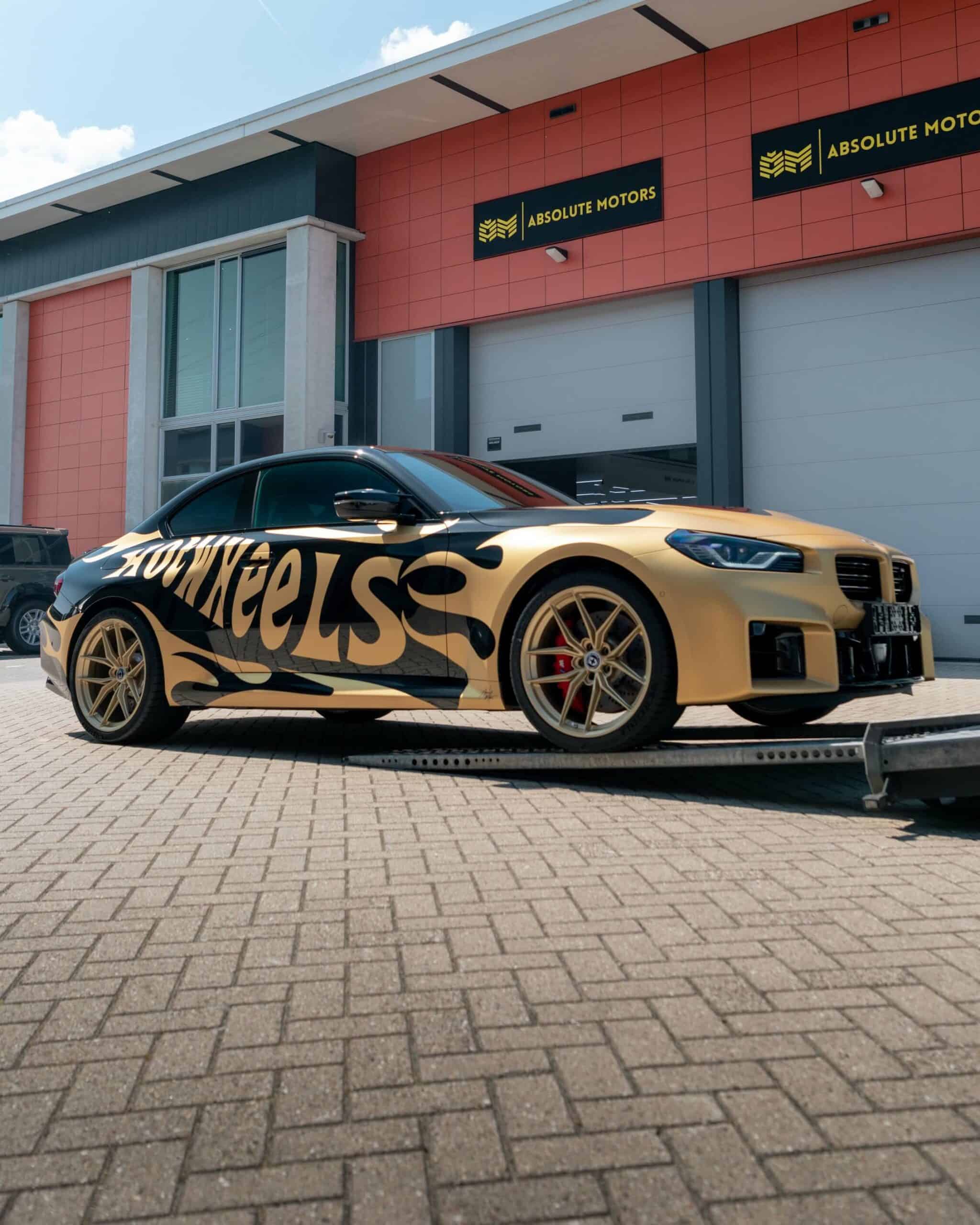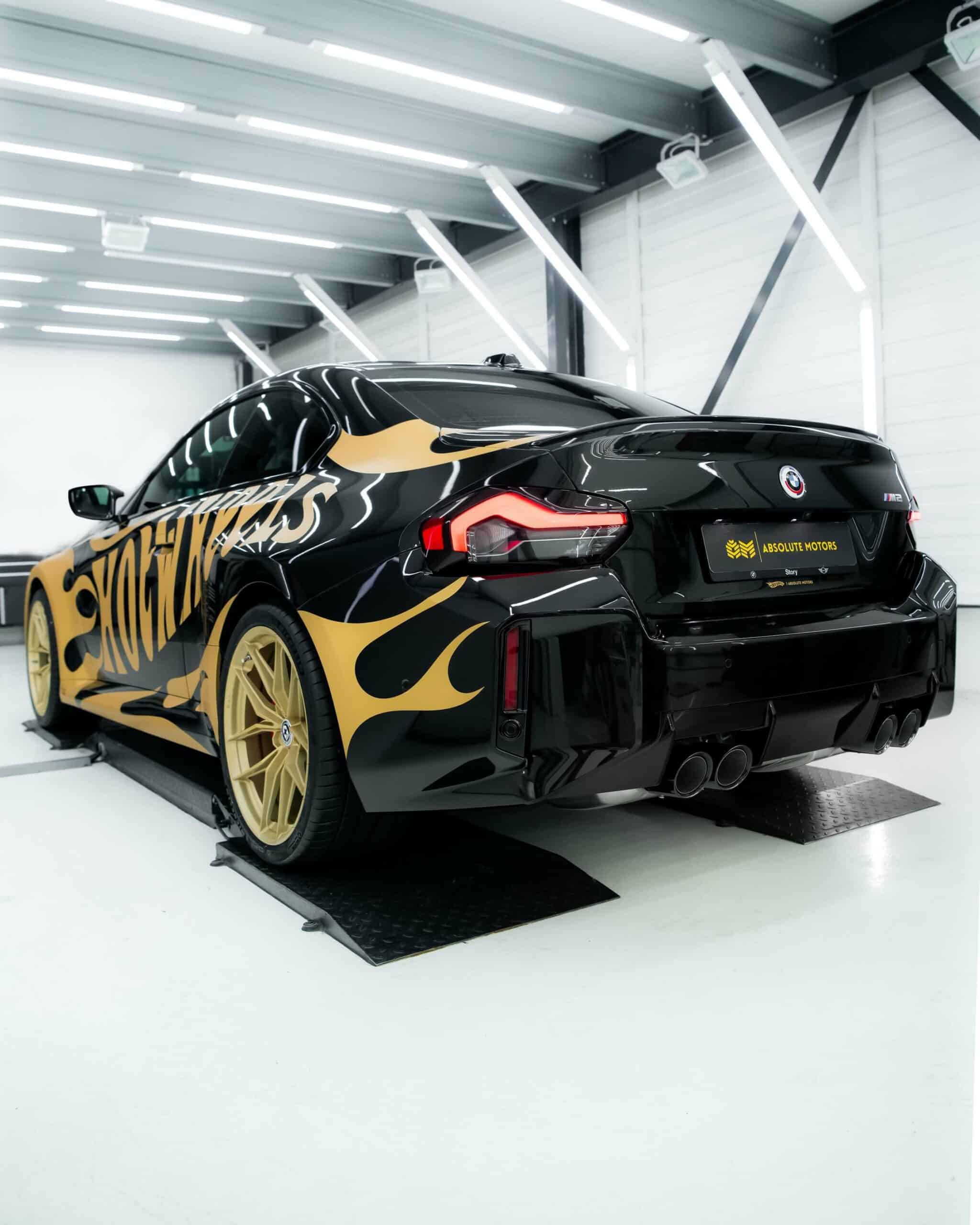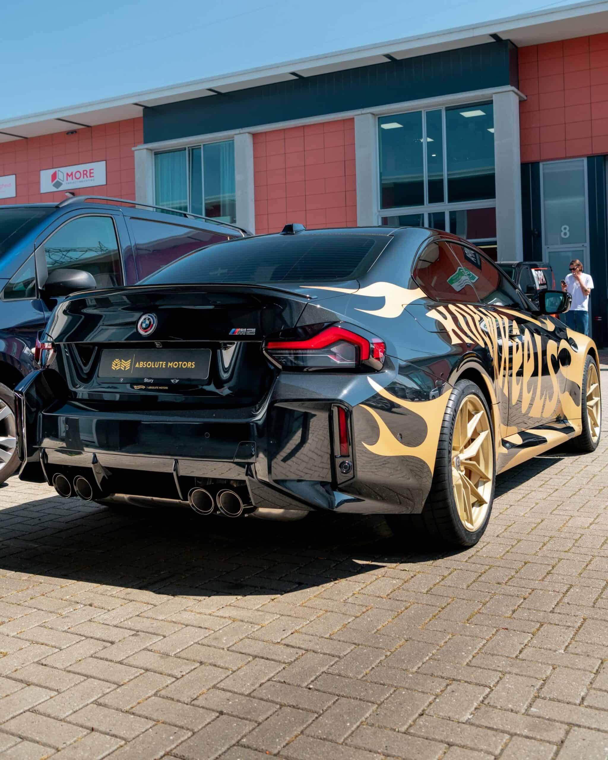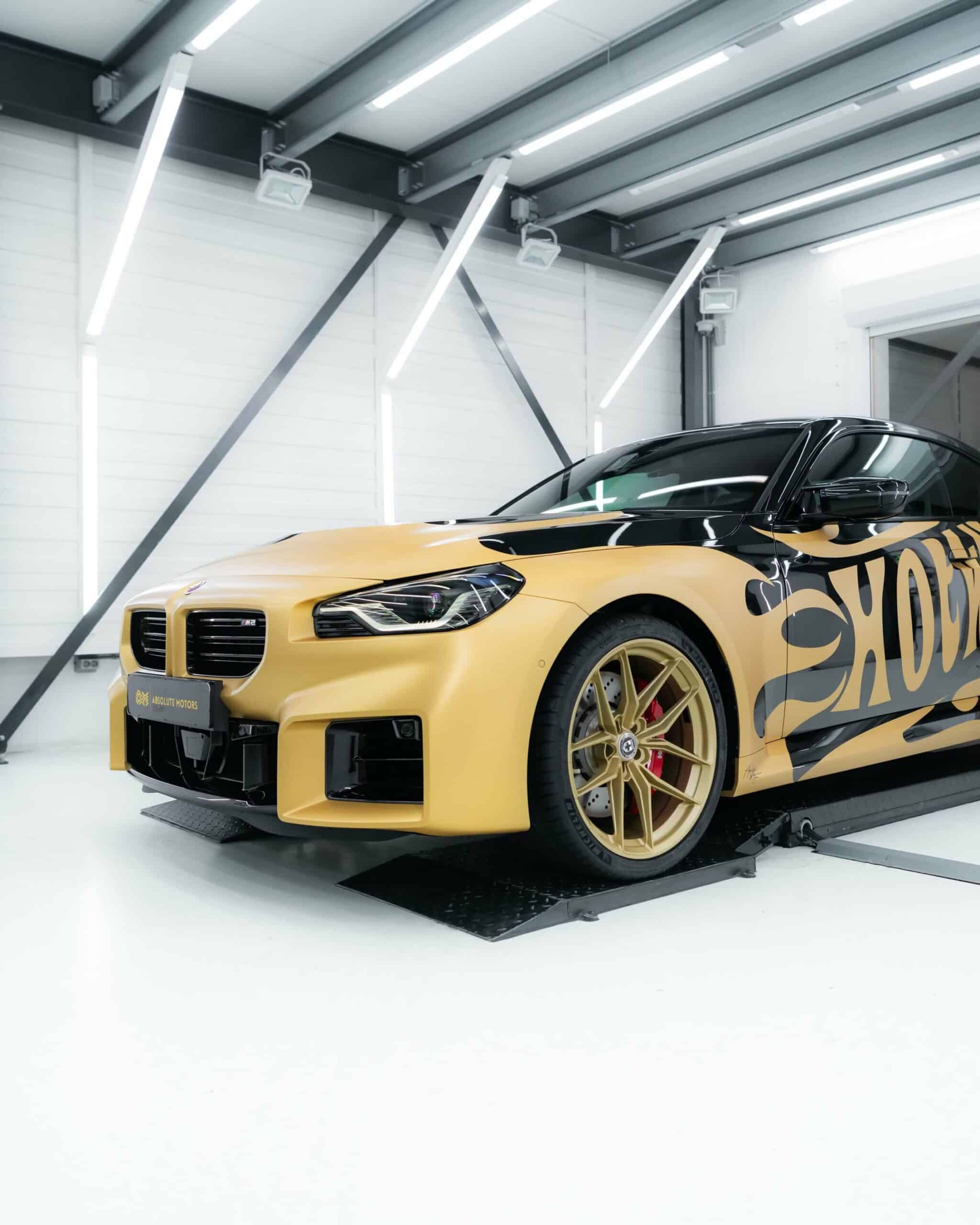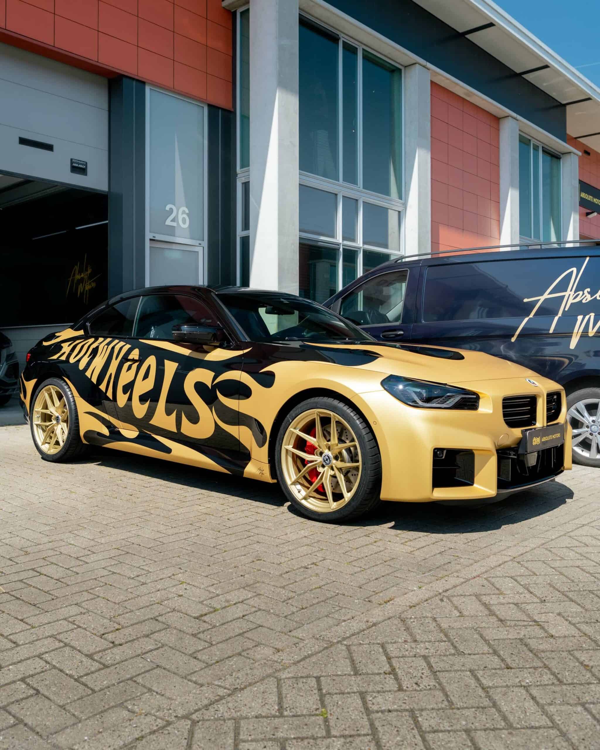 The BMW M2 G87 has officially landed in The Netherlands and one of the first cars has already been modified for the BimmerFest Europe event that took place last weekend at the Raceway Venray. Absolute Motors decided to show off the sports coupe in Sapphire Black with a partial wrap featuring a Hot Wheels livery in matte pyrite gold with matching wheels. Mind you, those are not OEM alloys as they’ve been replaced with a custom HRE FF21 set measuring 20 inches.