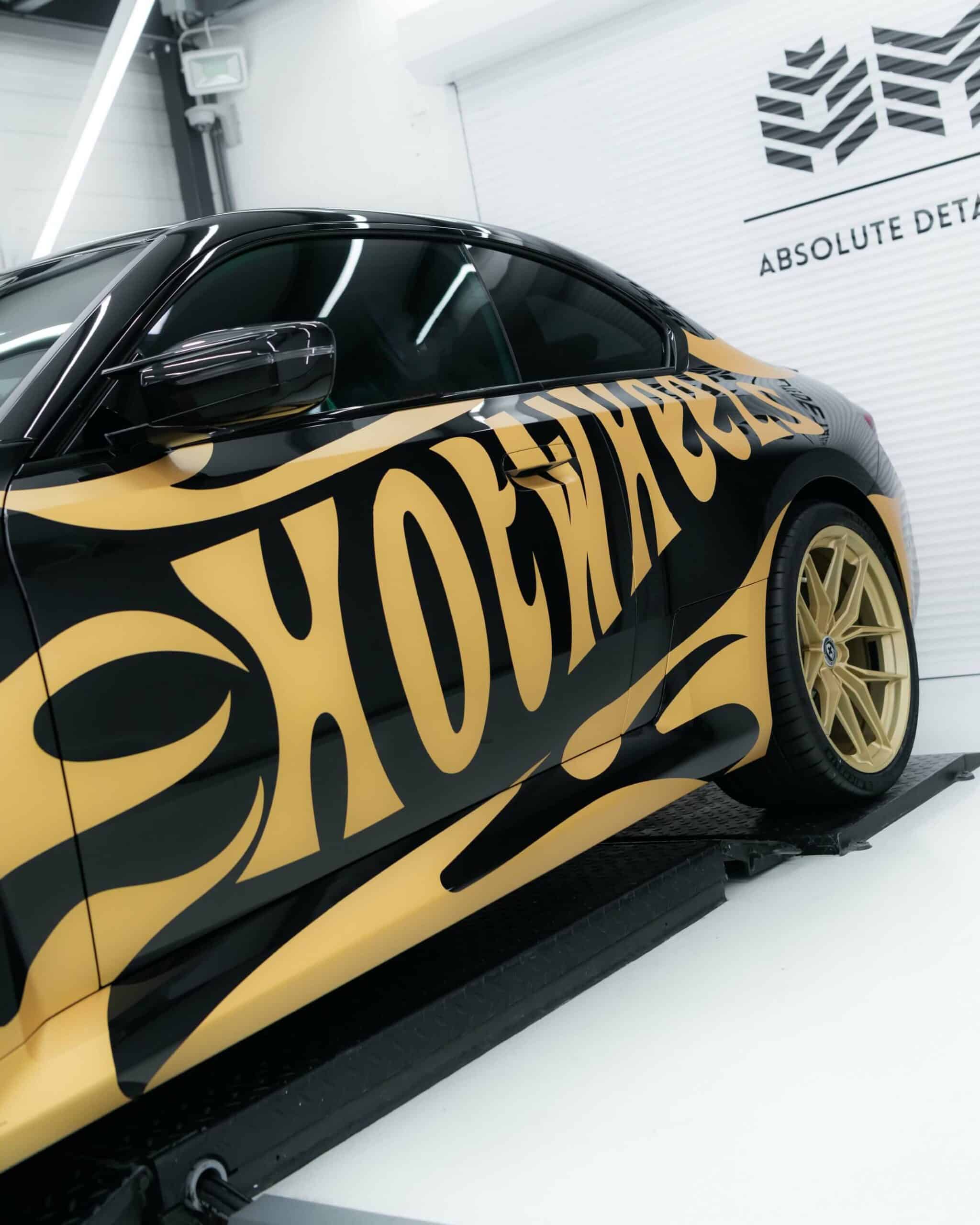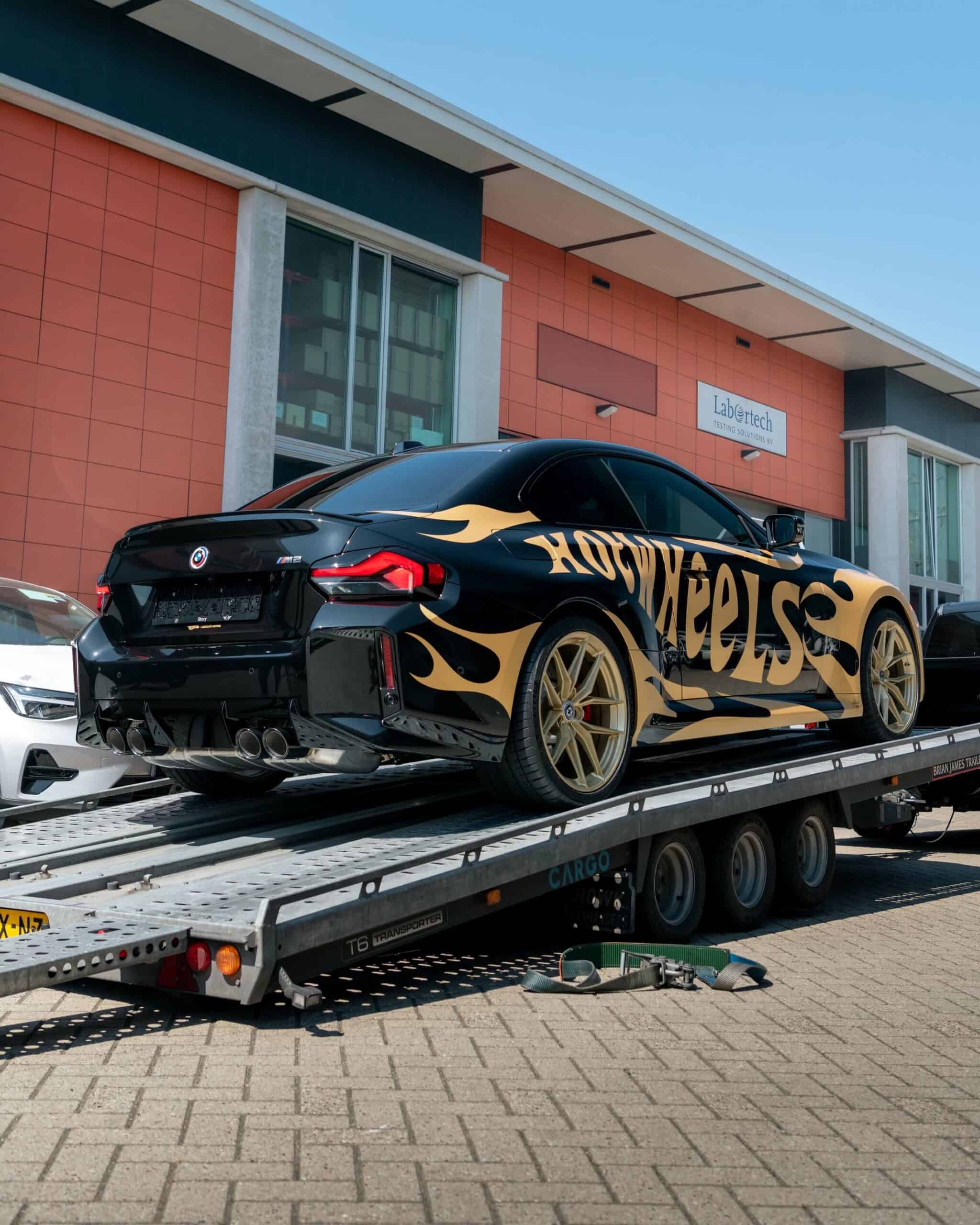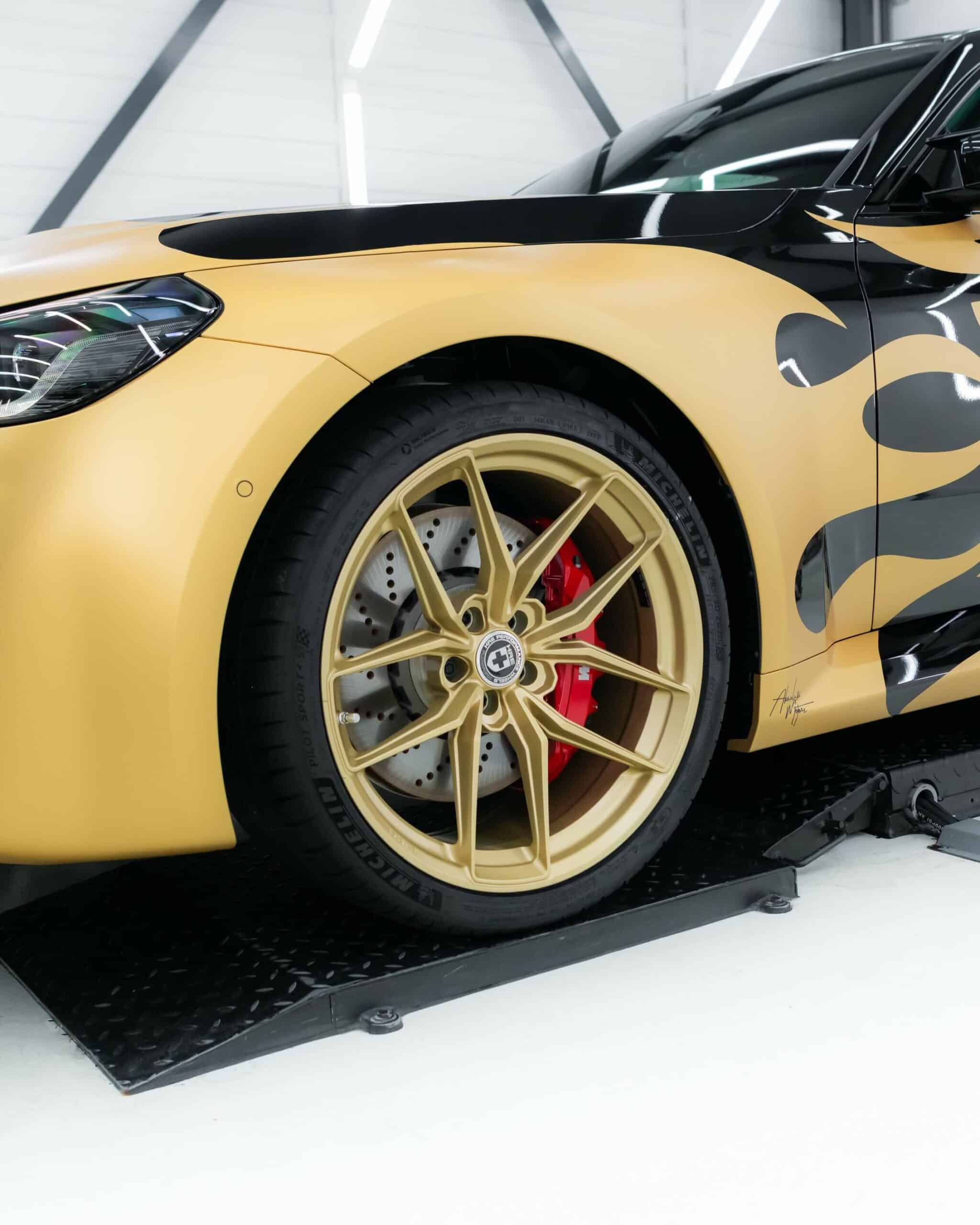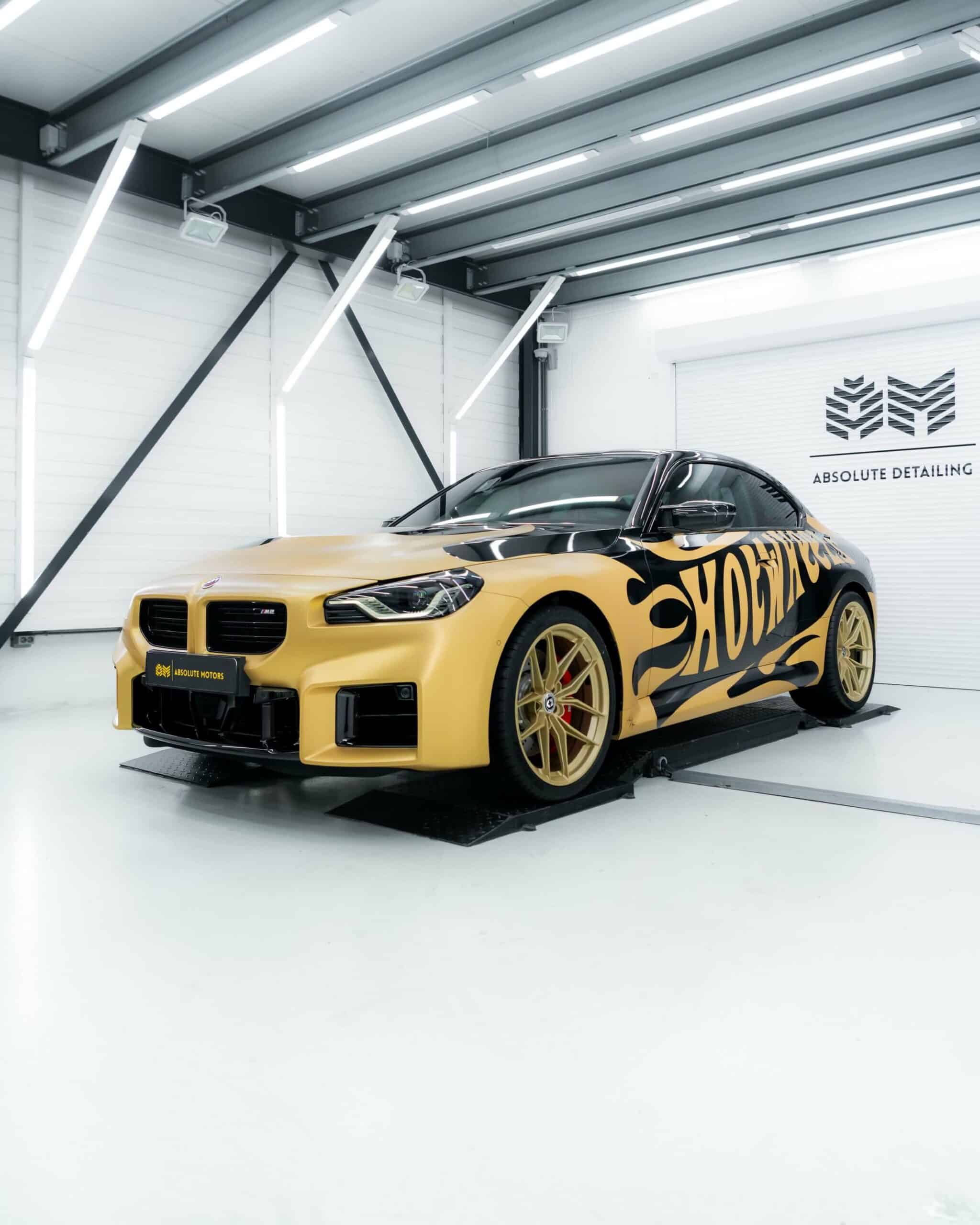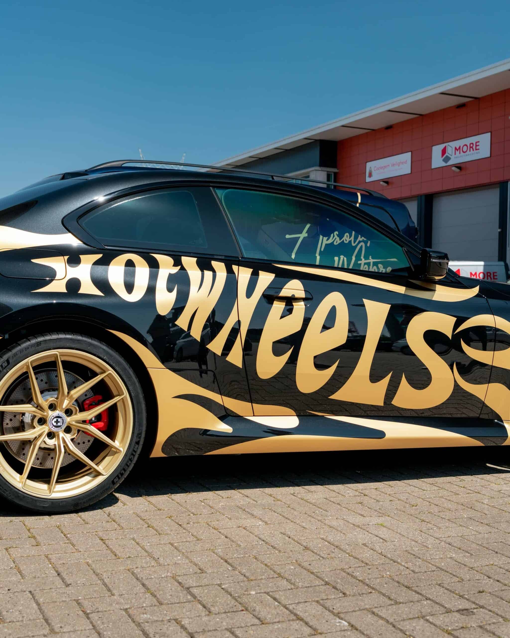 The BMW M2 G87 has officially landed in The Netherlands and one of the first cars has already been modified for the BimmerFest Europe event that took place last weekend at the Raceway Venray. Absolute Motors decided to show off the sports coupe in Sapphire Black with a partial wrap featuring a Hot Wheels livery in matte pyrite gold with matching wheels. Mind you, those are not OEM alloys as they’ve been replaced with a custom HRE FF21 set measuring 20 inches.