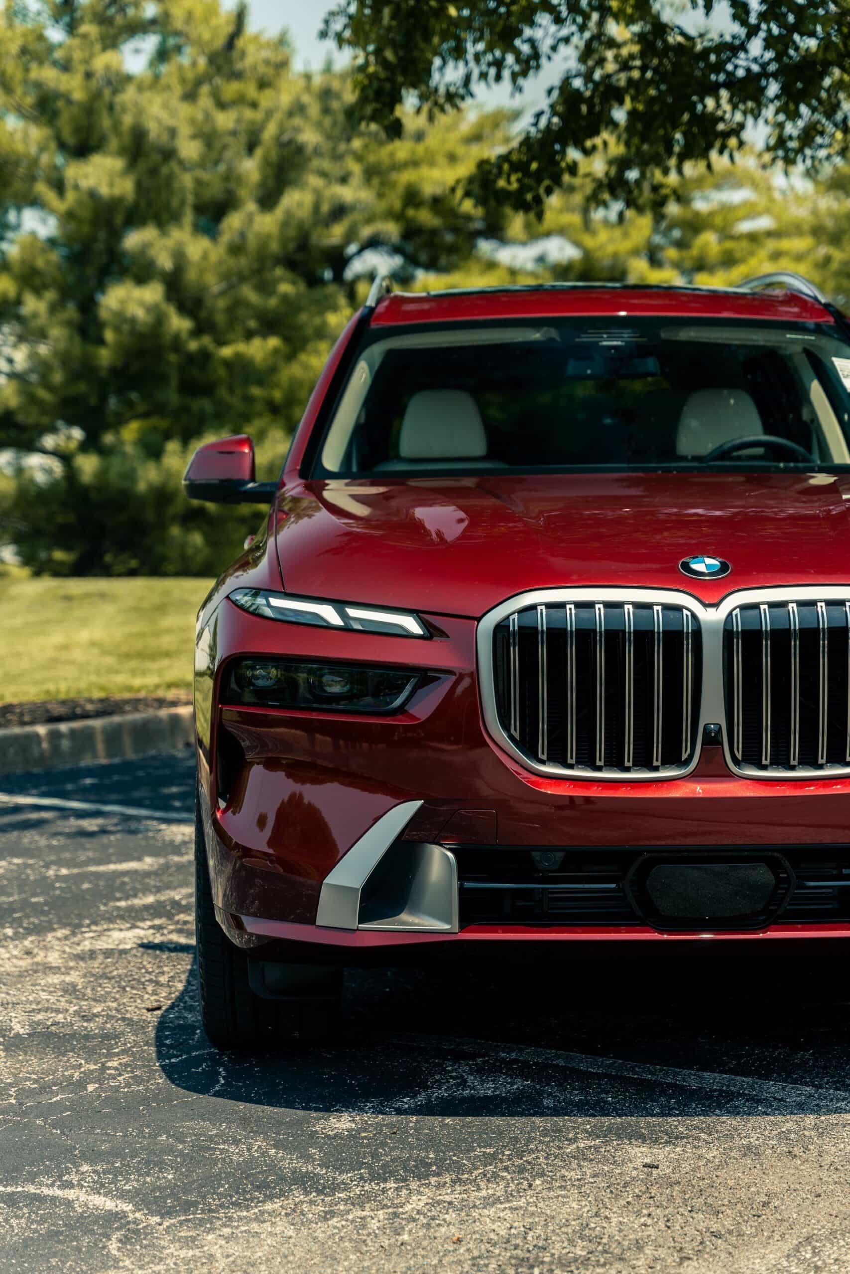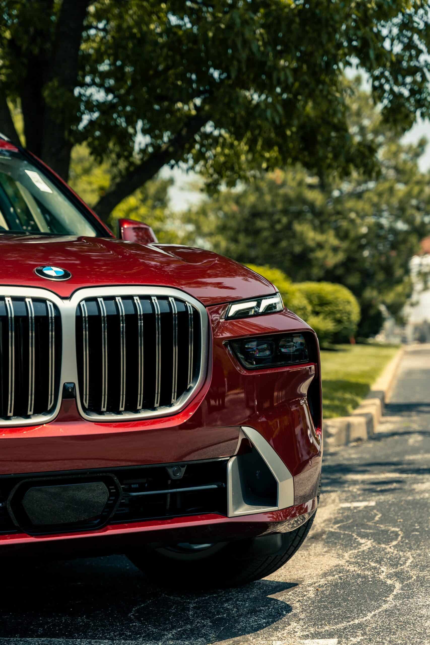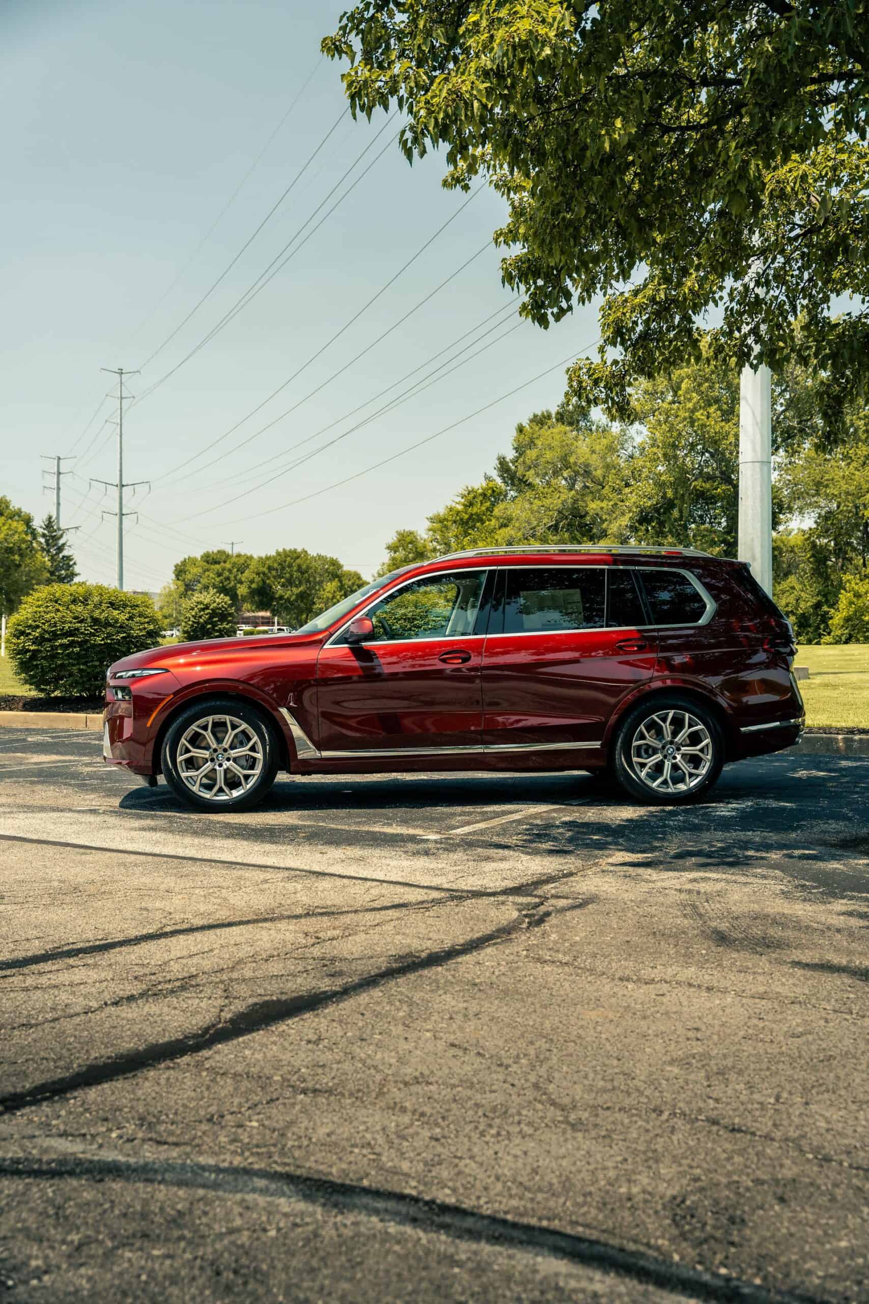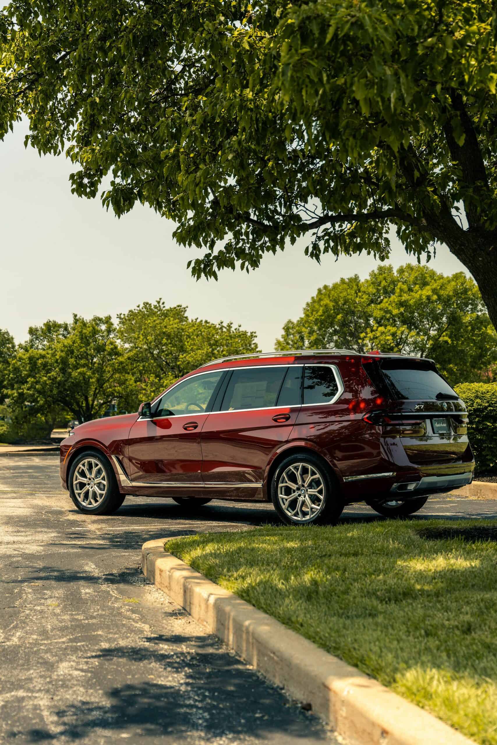 The fullsize luxury SUV showcased by Autohaus BMW St Louis is finished in Aventurin Red Metallic, an attractive no-cost paint option. The stately X7 rides on 21-inch wheels with a Y-spoke design but you can go bigger with a 22-inch set available for an extra $1,300 or a 23-inch set priced at $2,600. Since this xDrive40i doesn’t have the M Sport Package, it keeps the traditional silver and chrome exterior trim we rarely get to see these days on new BMWs.