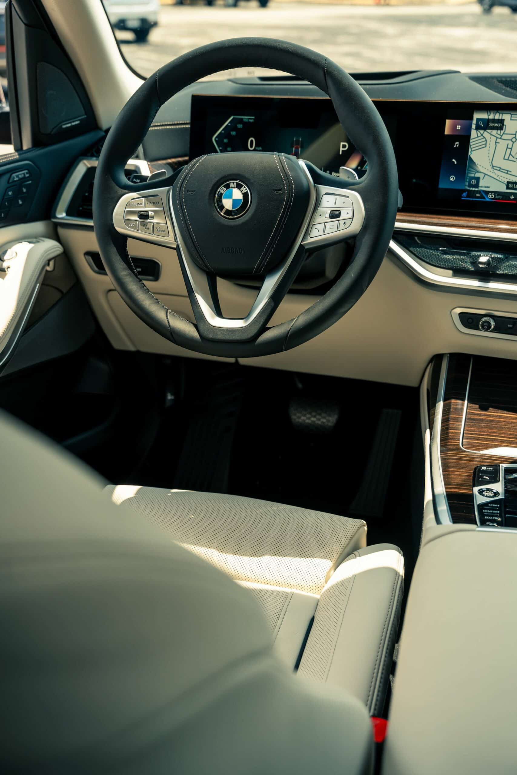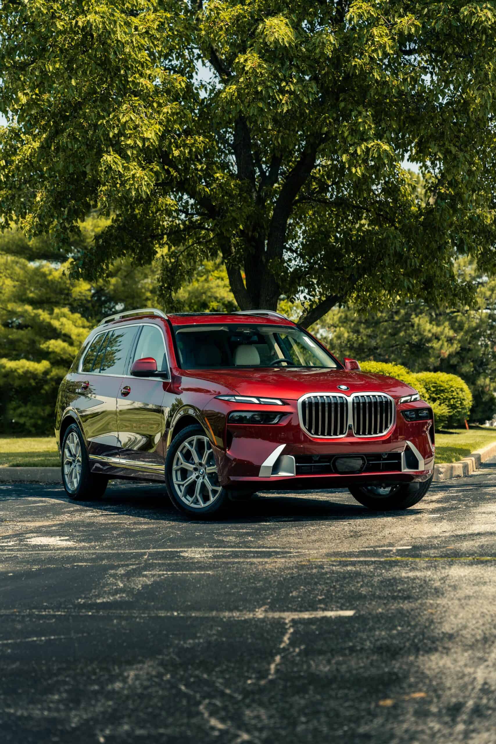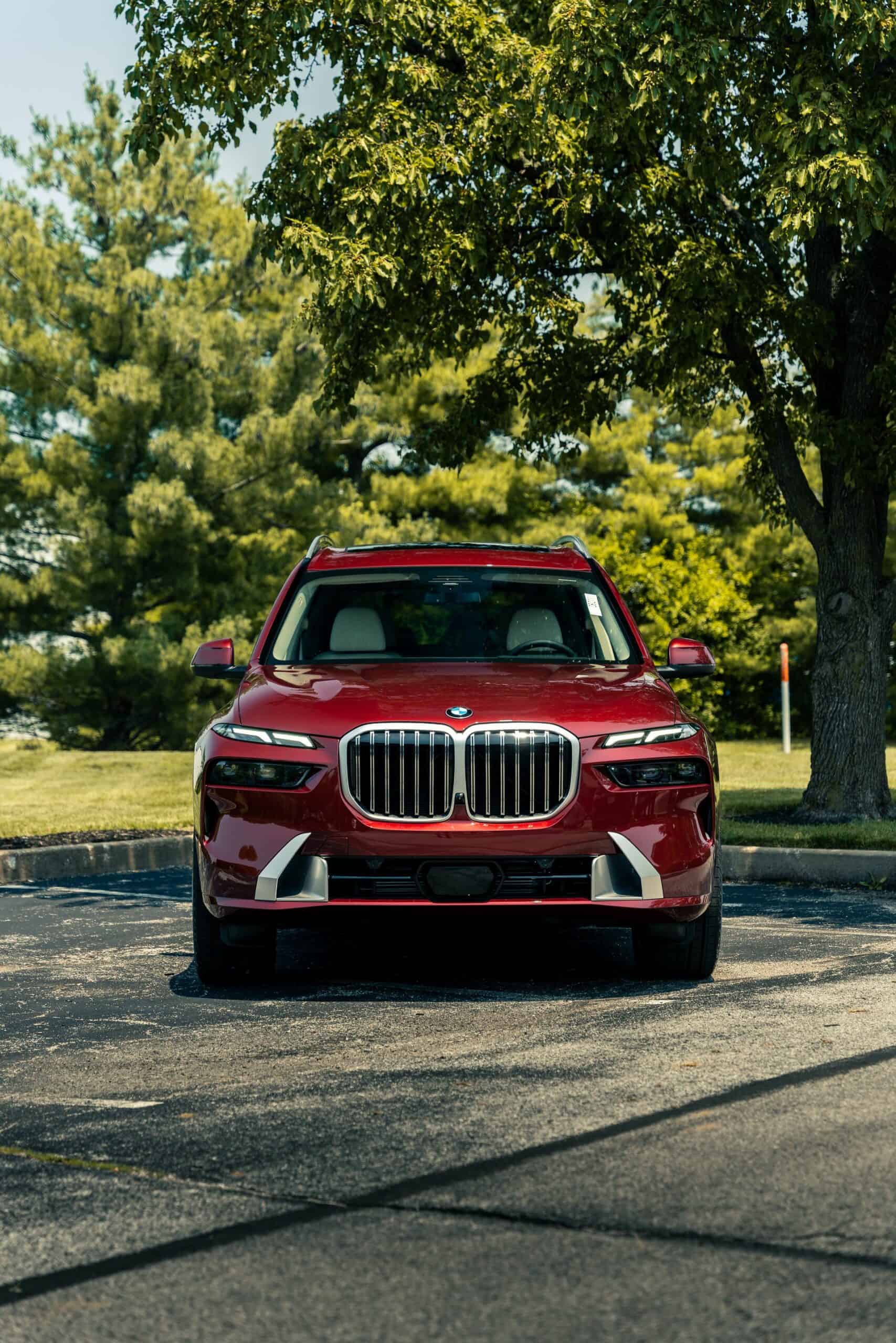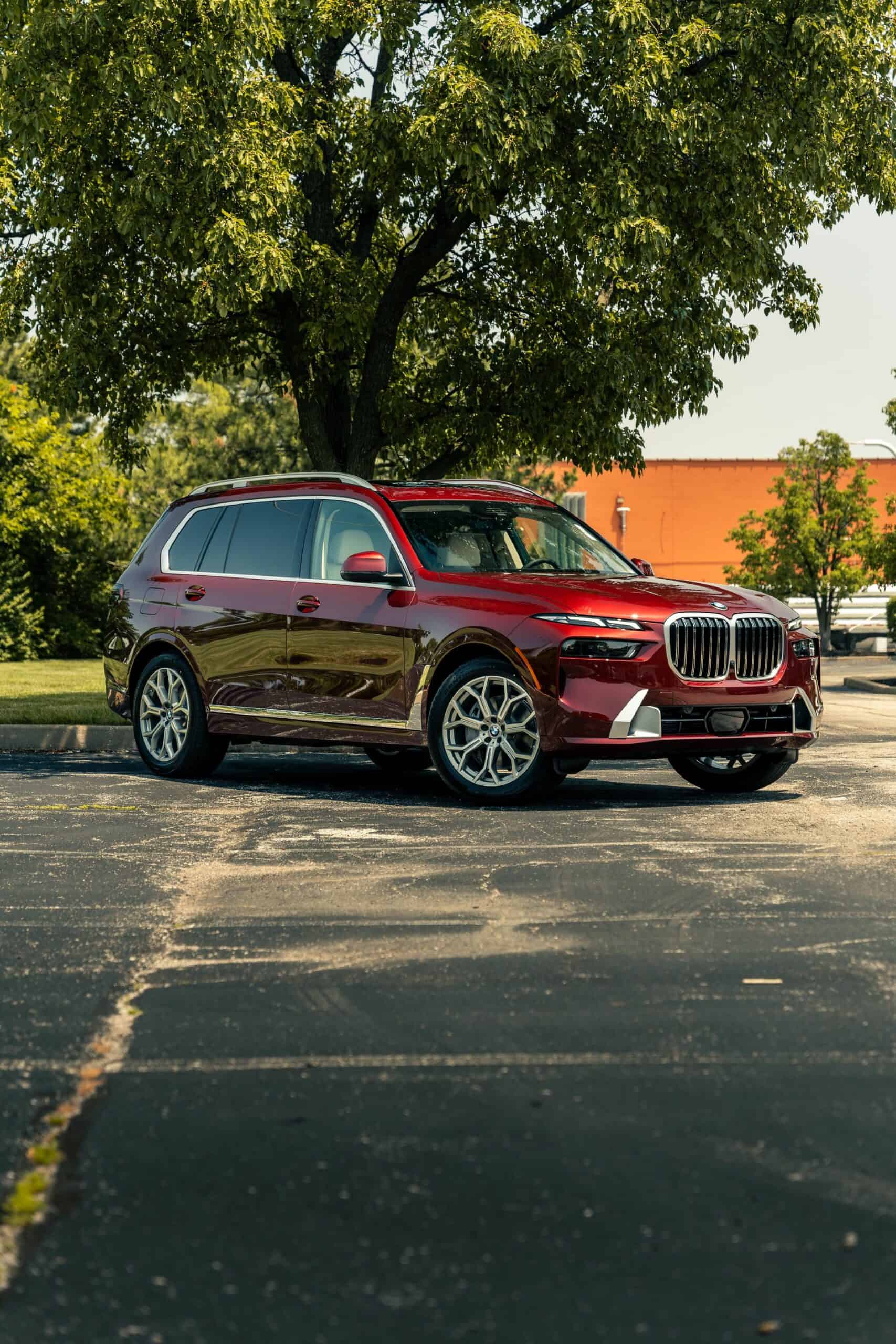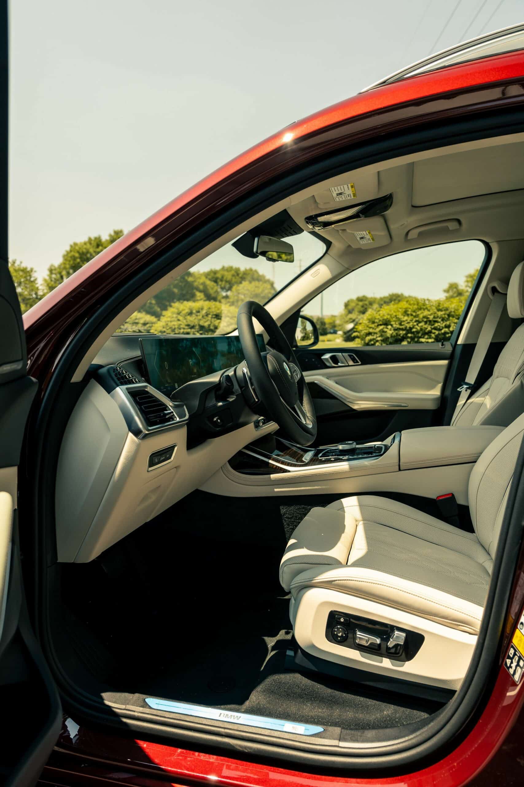 The fullsize luxury SUV showcased by Autohaus BMW St Louis is finished in Aventurin Red Metallic, an attractive no-cost paint option. The stately X7 rides on 21-inch wheels with a Y-spoke design but you can go bigger with a 22-inch set available for an extra $1,300 or a 23-inch set priced at $2,600. Since this xDrive40i doesn’t have the M Sport Package, it keeps the traditional silver and chrome exterior trim we rarely get to see these days on new BMWs.