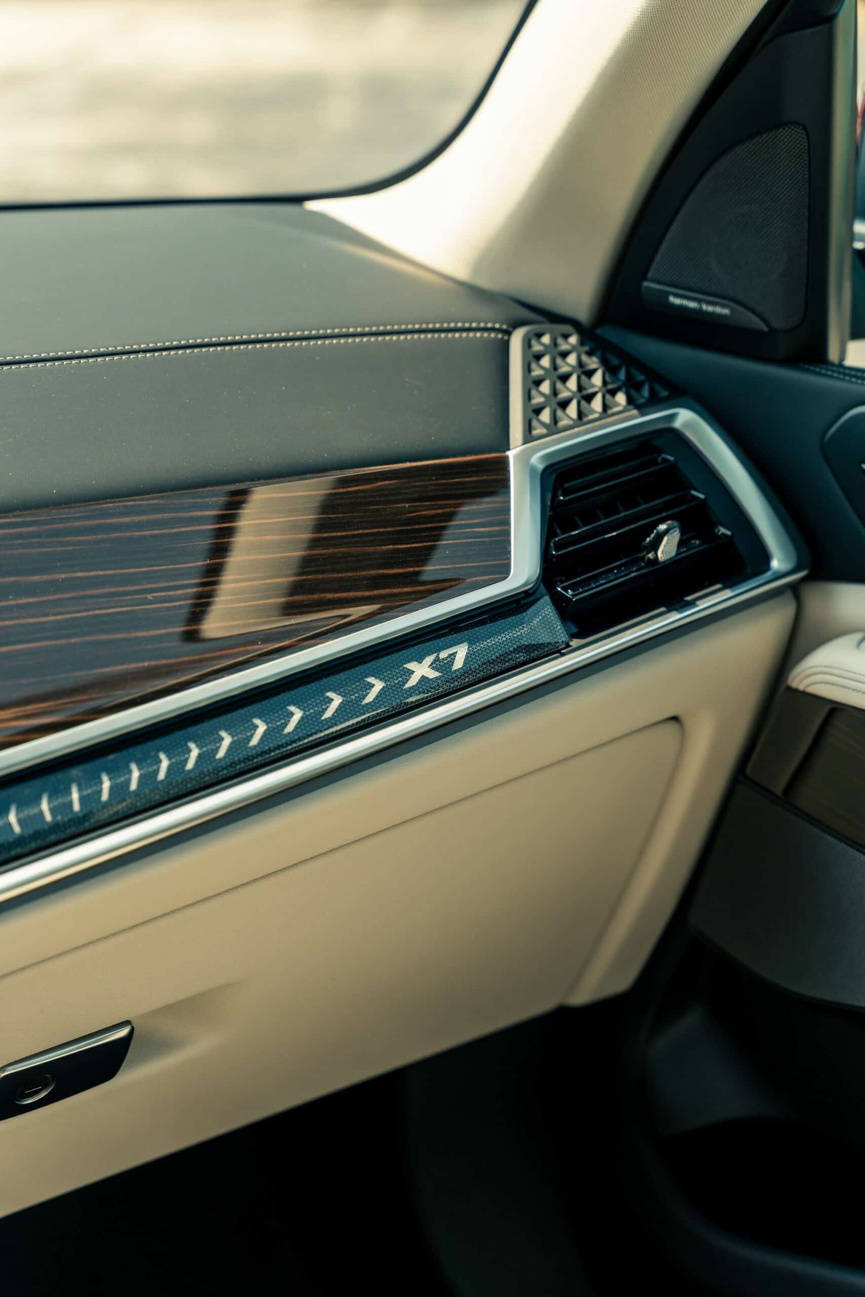 We’d argue the luxobarge’s interior is just as posh courtesy of its Extended Merino Leather in Ivory White and Fineline Stripe Brown High Gloss Wood trim. The facelift introduced a little over a year ago brought some major changes inside, chief of which is the iDrive 8 with a 12.3-inch driver’s display and a 14.9-inch touchscreen for the infotainment. The latter has forced BMW to make the central air vents slimmer, while a small gear selector was also introduced with the LCI. In addition, the passenger side of the dashboard has an ambient light bar with an “X7” graphic on the xDrive40i and an “M” on the M60i.