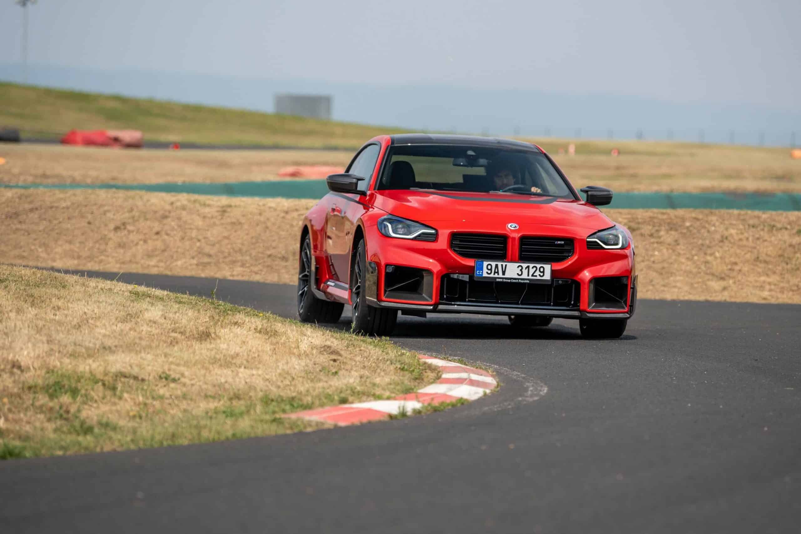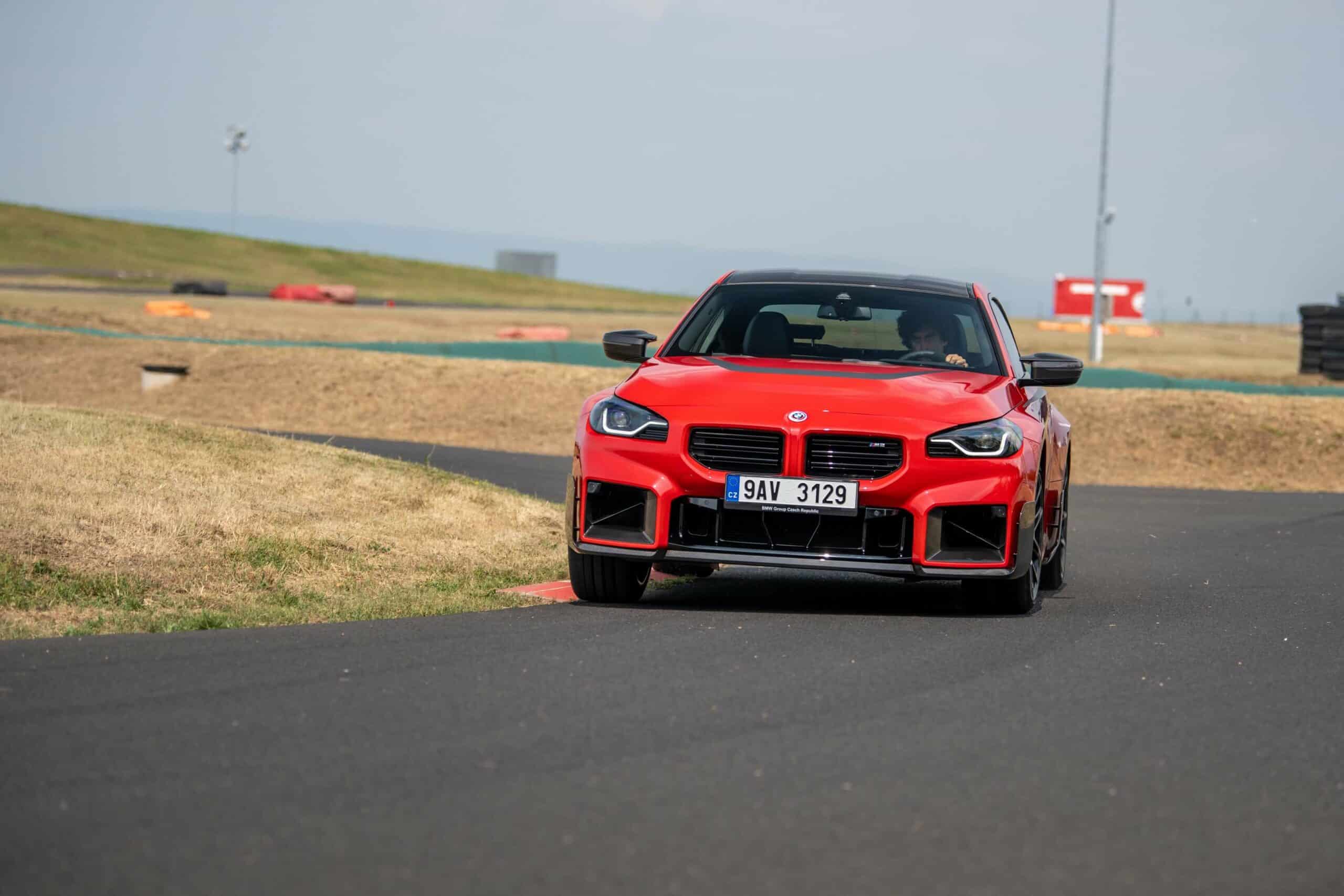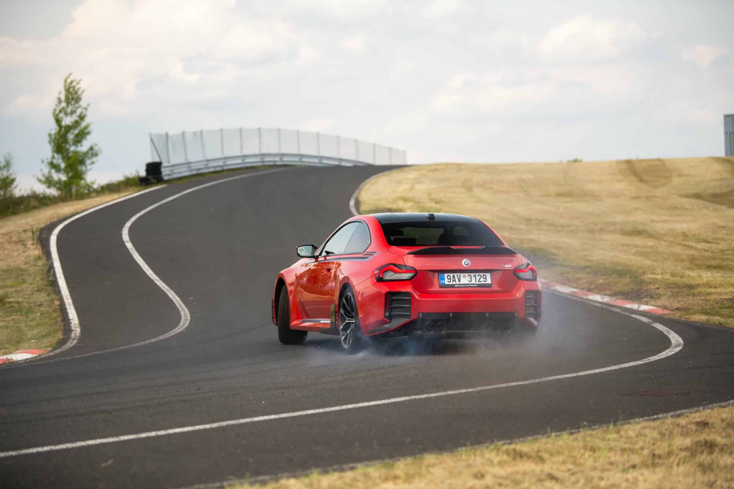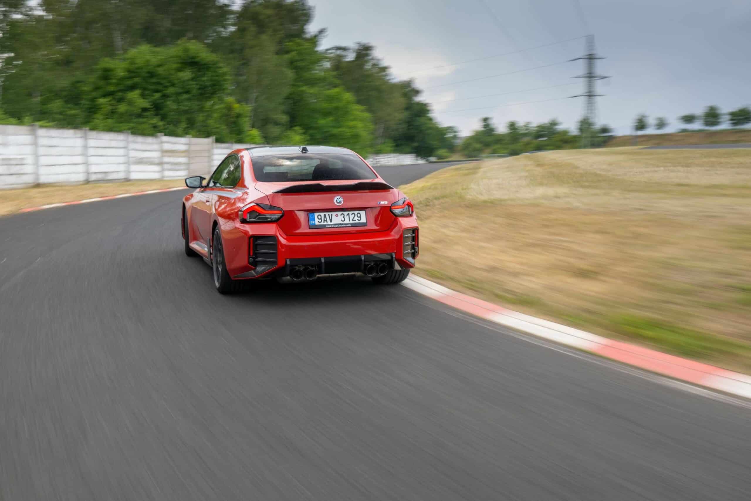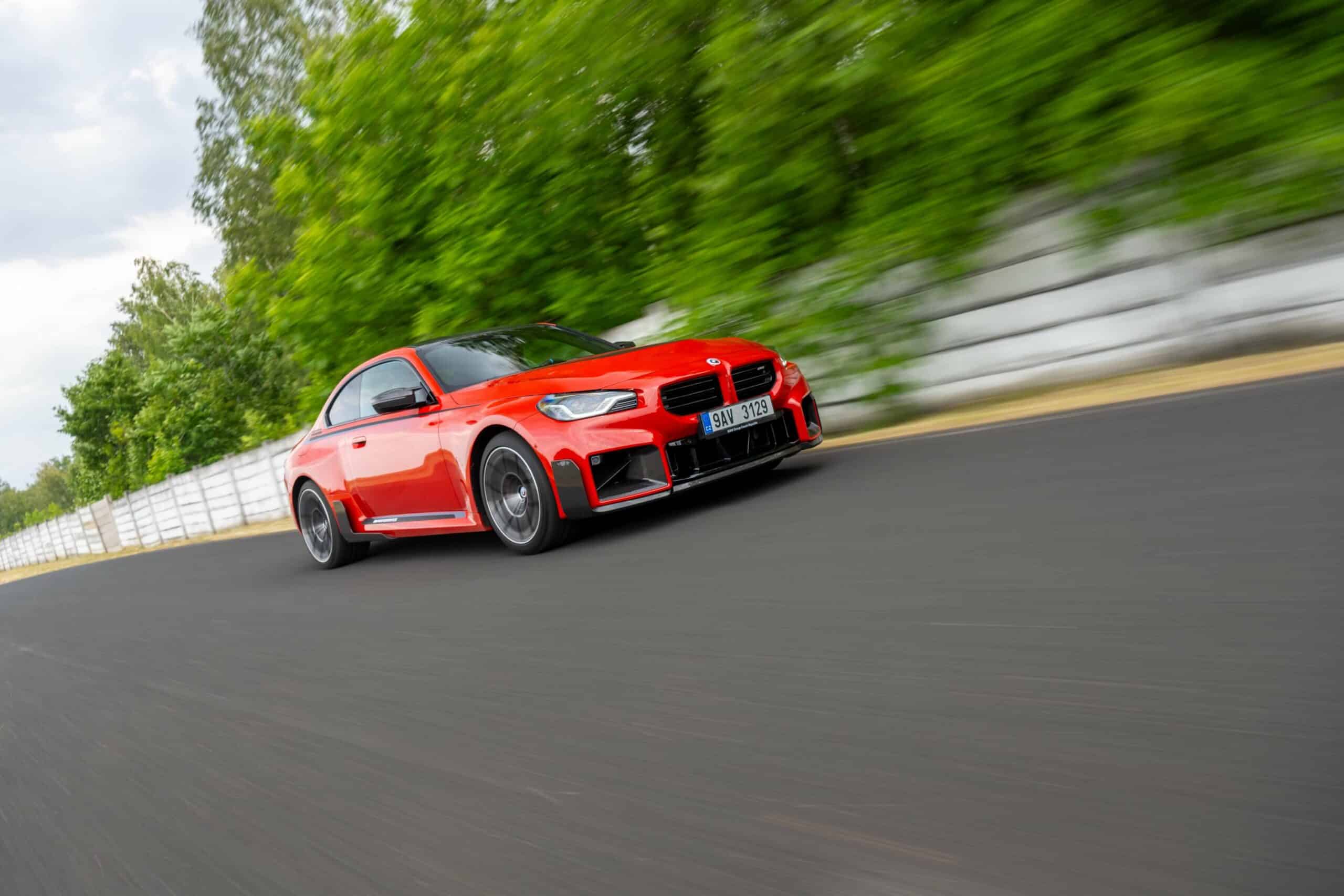 Photographed going sideways in the Czech Republic at the Autodrom Most, the new M2 is chock-full of MPP goodies. Save for the center-mounted exhaust tips and the roof spoiler, it has nearly all the other items. It boasts carbon fiber side spats along with a chunky trunk lid spoiler made from the same material. The front air intakes and spoiler lip are also from carbon fiber to complement the carbon roof and side mirror caps.
