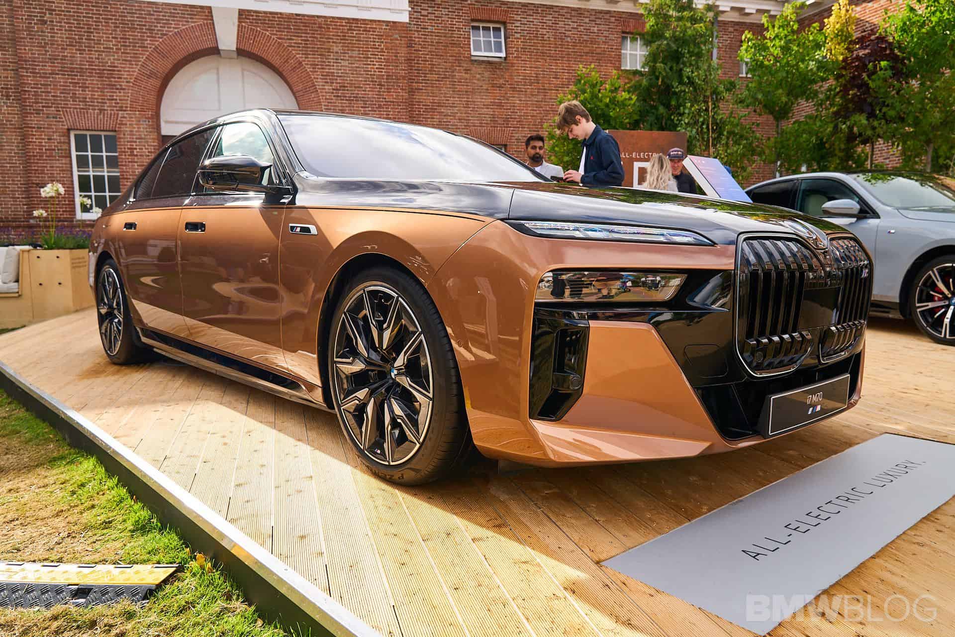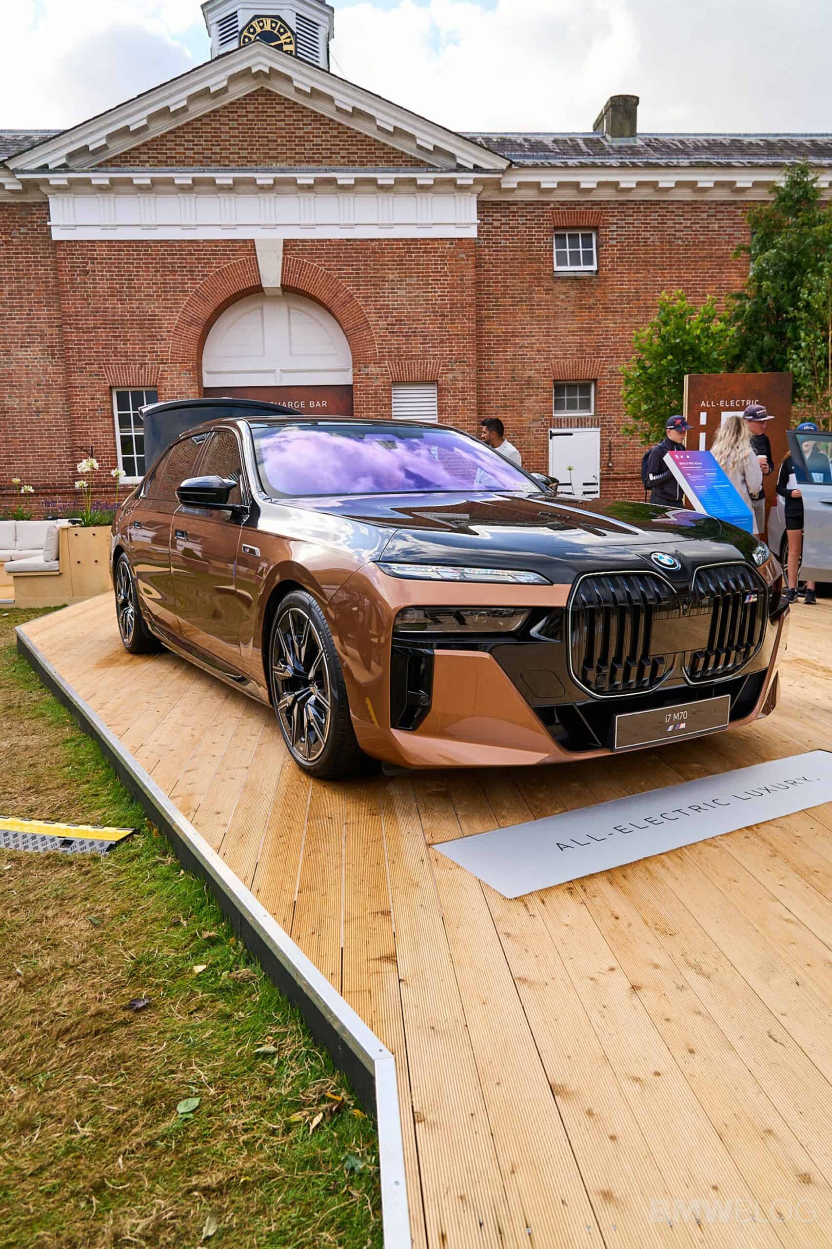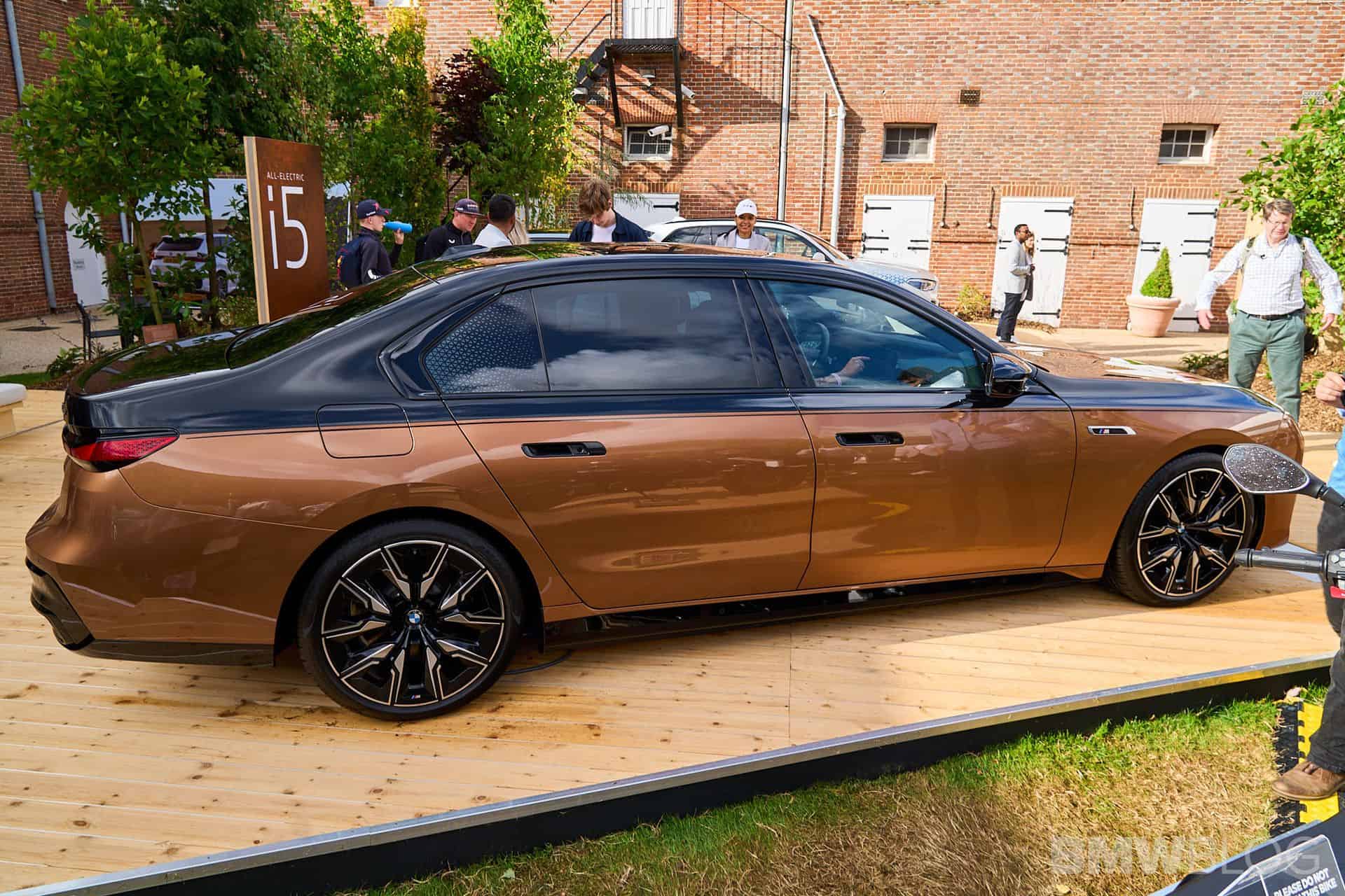 Following its world premiere earlier this year at Auto Shanghai, the BMW i7 M70 celebrated its European public debut this past weekend at the 2023 Goodwood Festival of Speed. Much like the showcar exhibited in China, the first-ever electric M Performance version of the 7 Series was displayed with a fancy two-tone paint. It combined the Individual Liquid Copper metallic color for the bottom half of the car with Sapphire Black for the upper section.