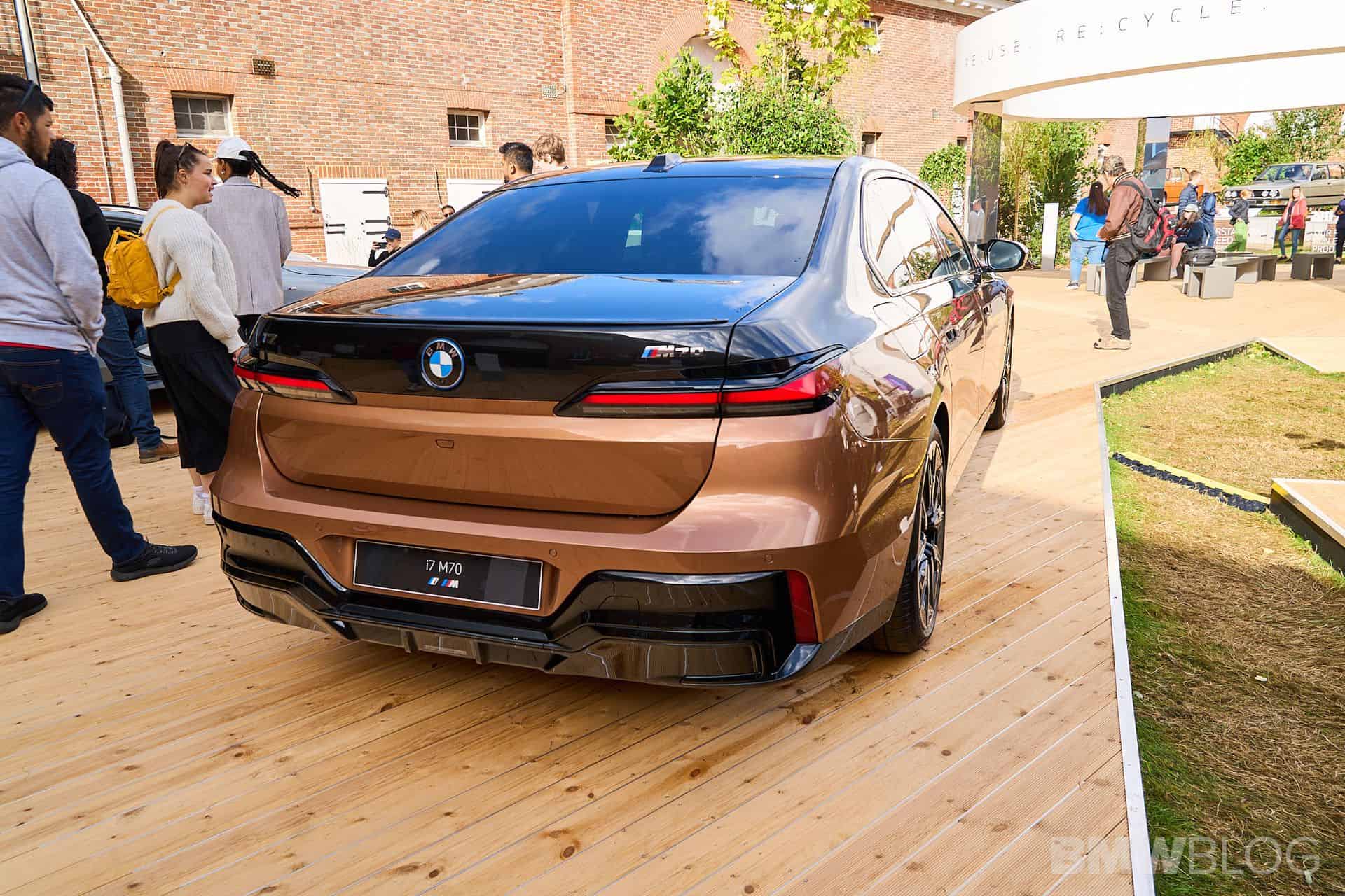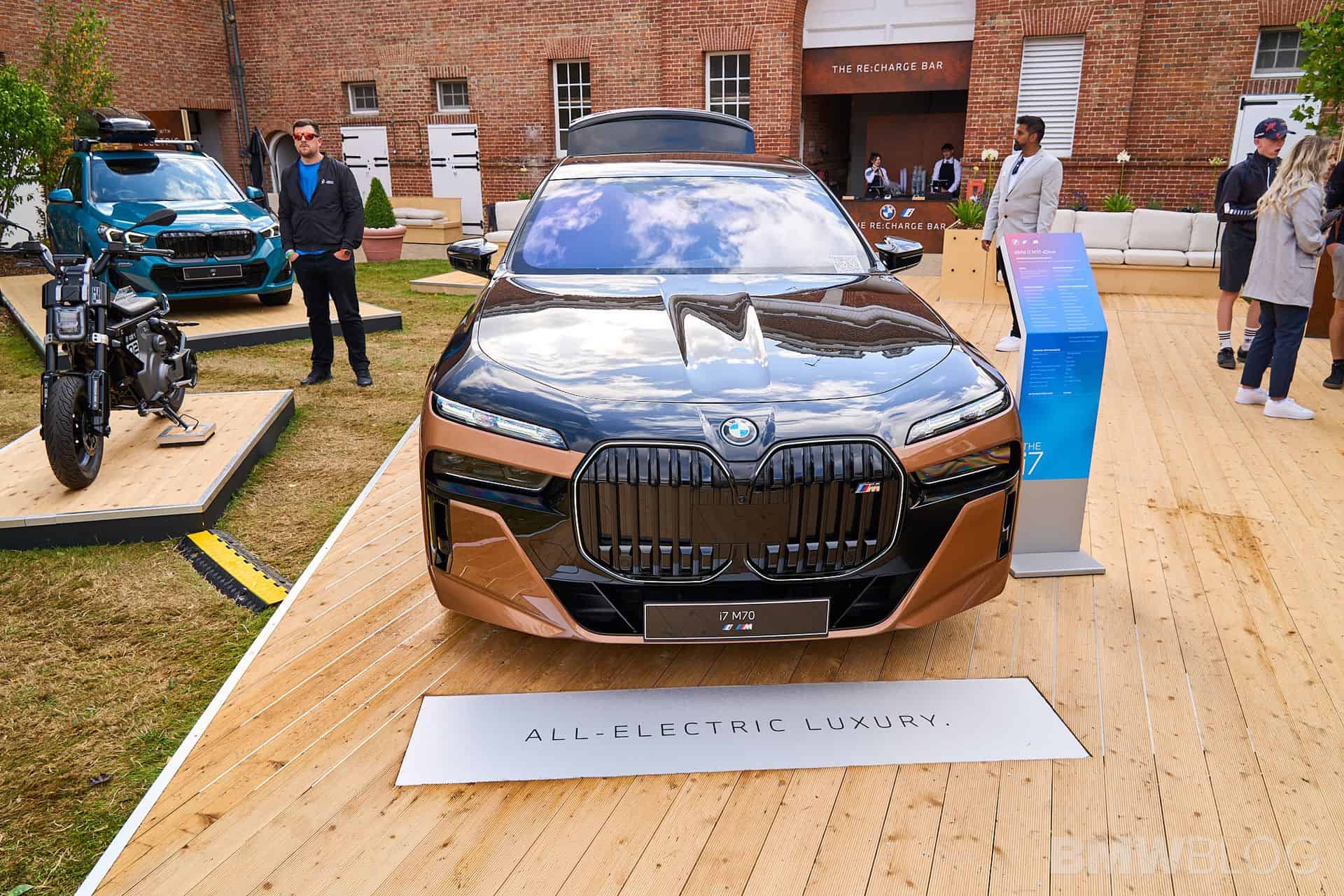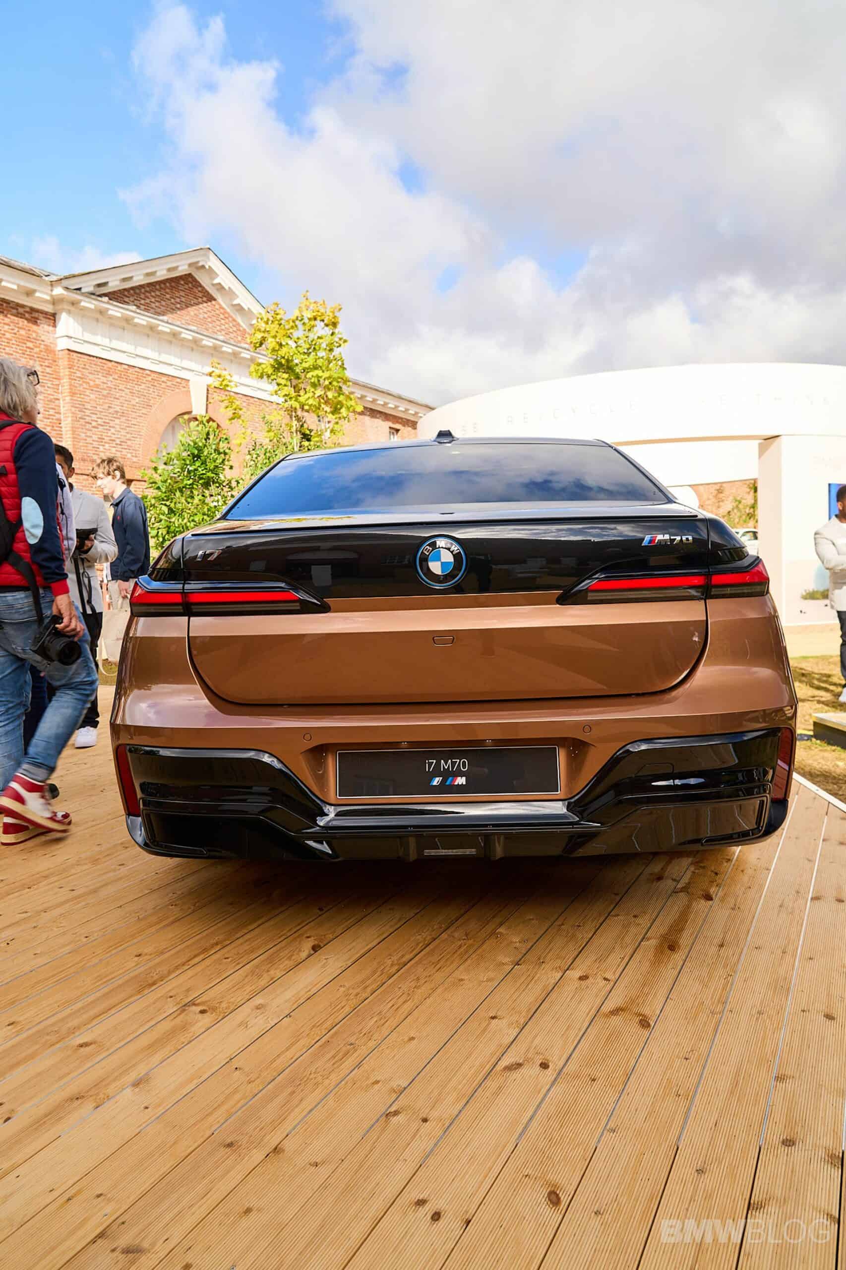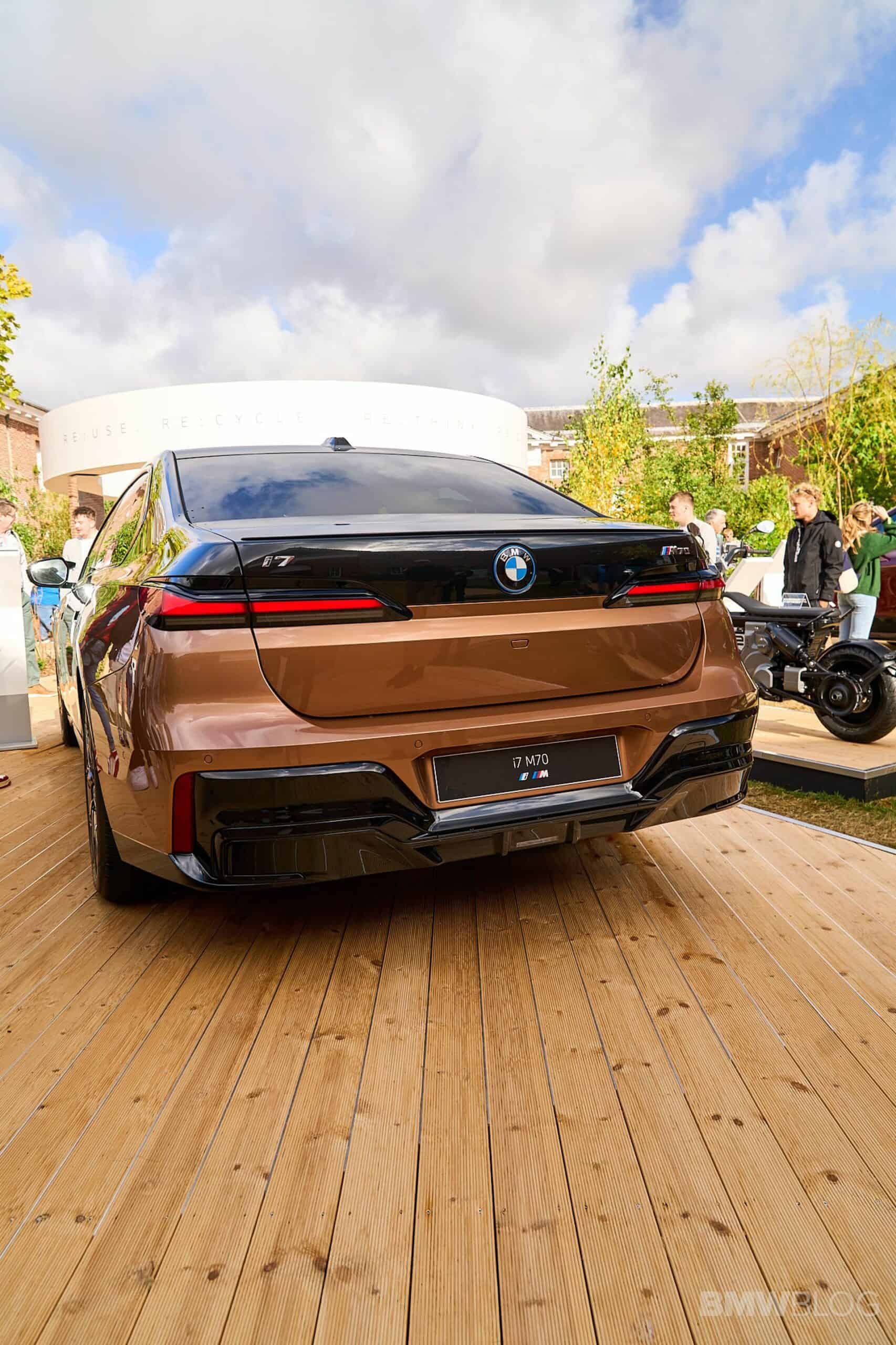 Following its world premiere earlier this year at Auto Shanghai, the BMW i7 M70 celebrated its European public debut this past weekend at the 2023 Goodwood Festival of Speed. Much like the showcar exhibited in China, the first-ever electric M Performance version of the 7 Series was displayed with a fancy two-tone paint. It combined the Individual Liquid Copper metallic color for the bottom half of the car with Sapphire Black for the upper section.