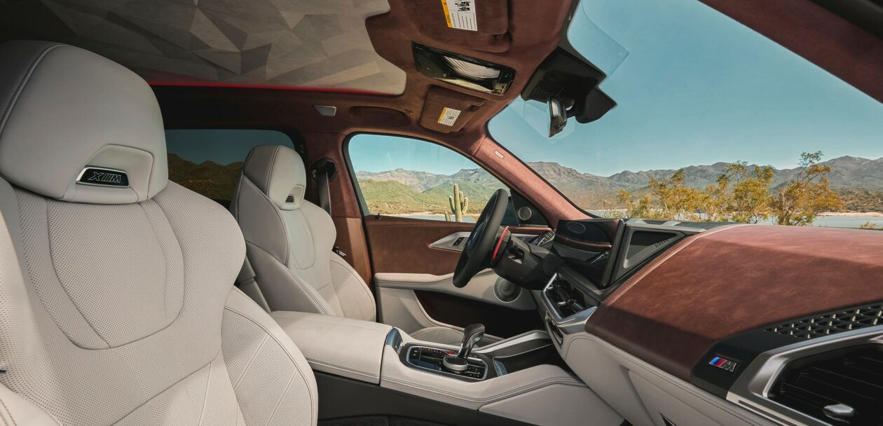Inside, the BMW XM is a classed-up X7 – not much more, and certainly nothing less. If you’re cross-shopping other BMWs in the segment, you’ll see much of the same accouterment here. New iDrive with a curved display, a thick leather-wrapped steering wheel, and luxurious leather upholstery everywhere you look. The XM adds unique touches like a moonroof-less headliner with a completely bespoke design. Overall, the cabin feels rich, even if it isn’t entirely unique. I will say that the Full Merino Leather option gives some nice touches that you won’t find elsewhere in the BMW stable, like leather and Alcantara accents that run the entire height of the door panel.