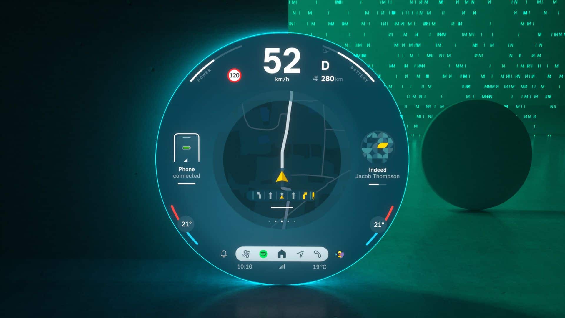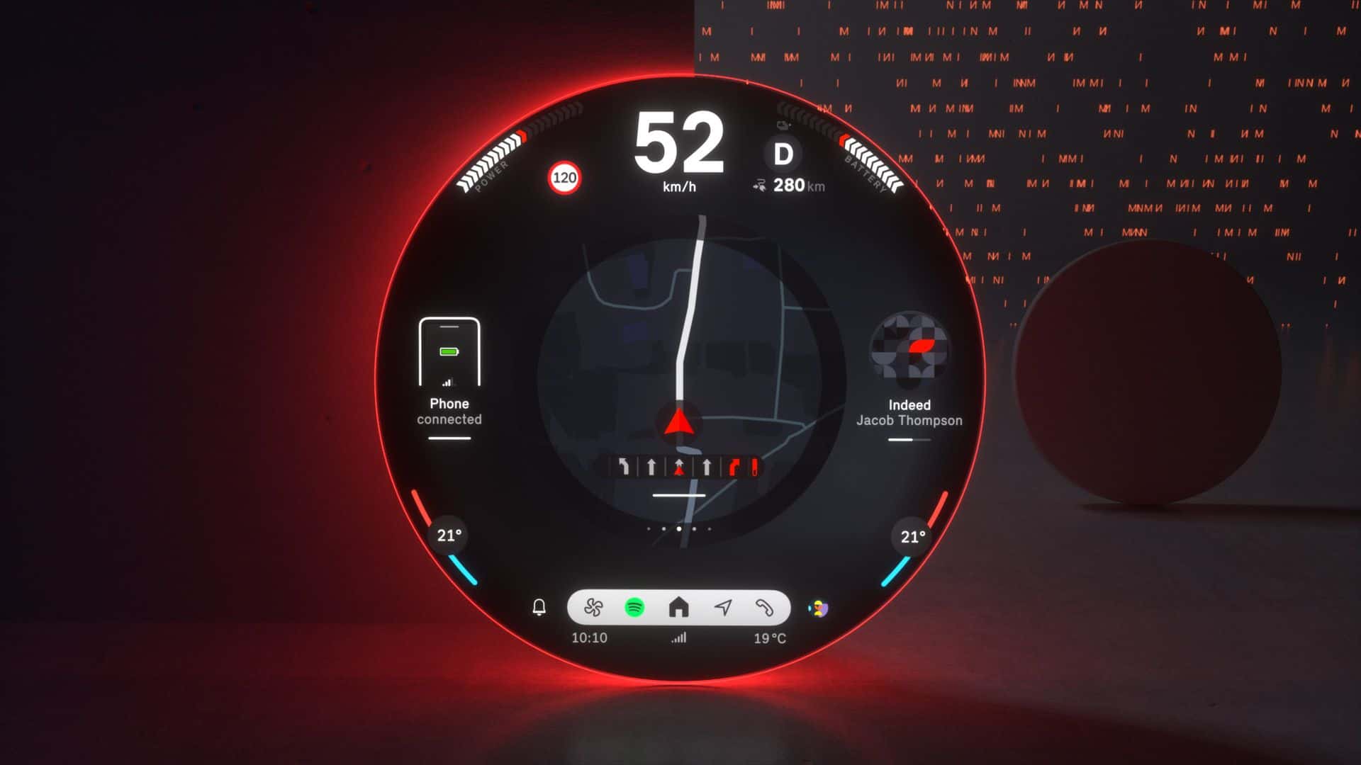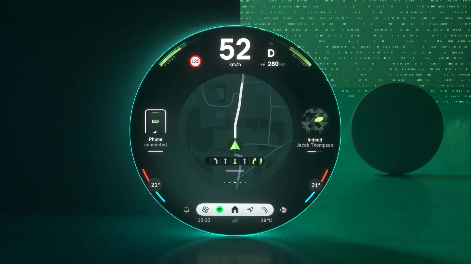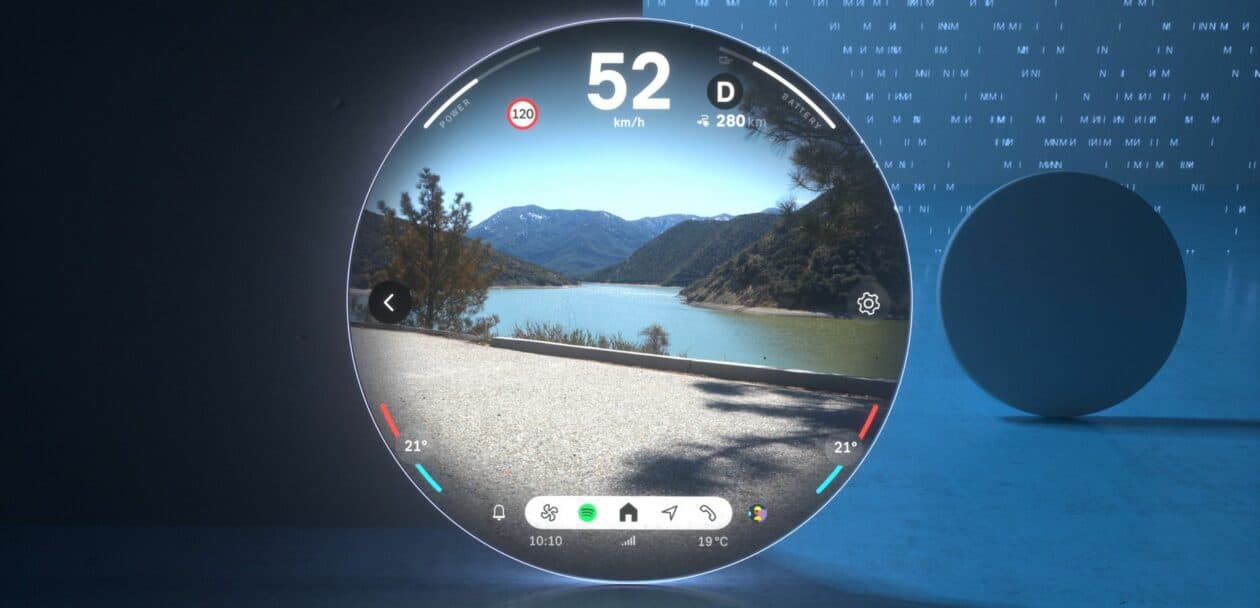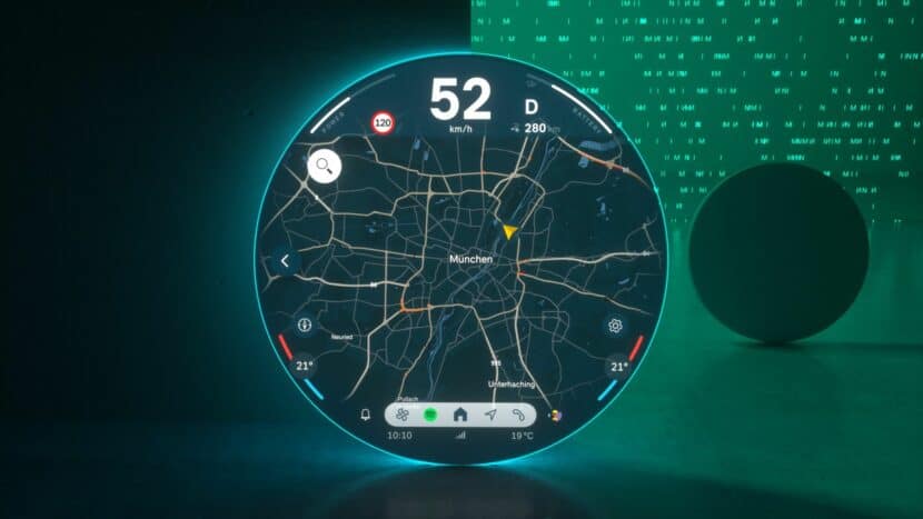 Located at the screen’s center is The start menu is ergonomically placed in the screen’s center offering a range of personalized content that can be easily selected and launched by swiping to the side. A fixed status bar is placed in the lower section of the screen is the fixed status bar with menu items such as “Navigation,” “Media,” “Telephony,” “All Apps,” and, situationally, “Home” for direct access.