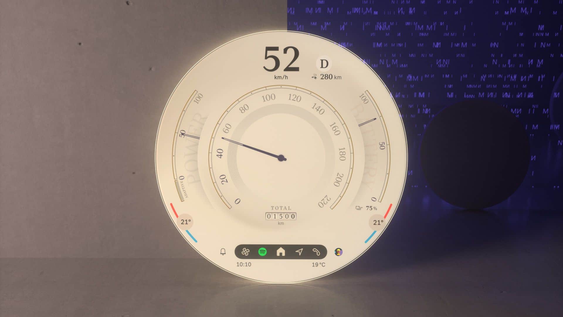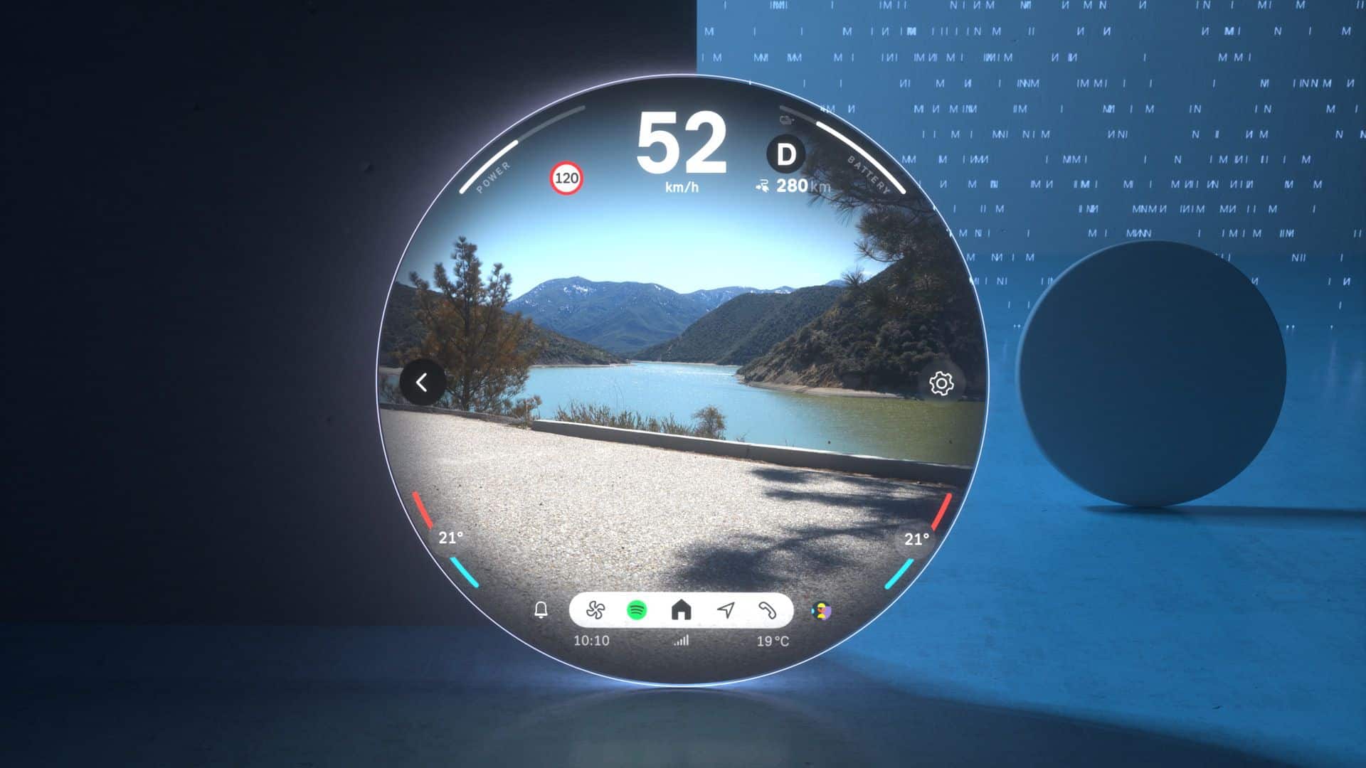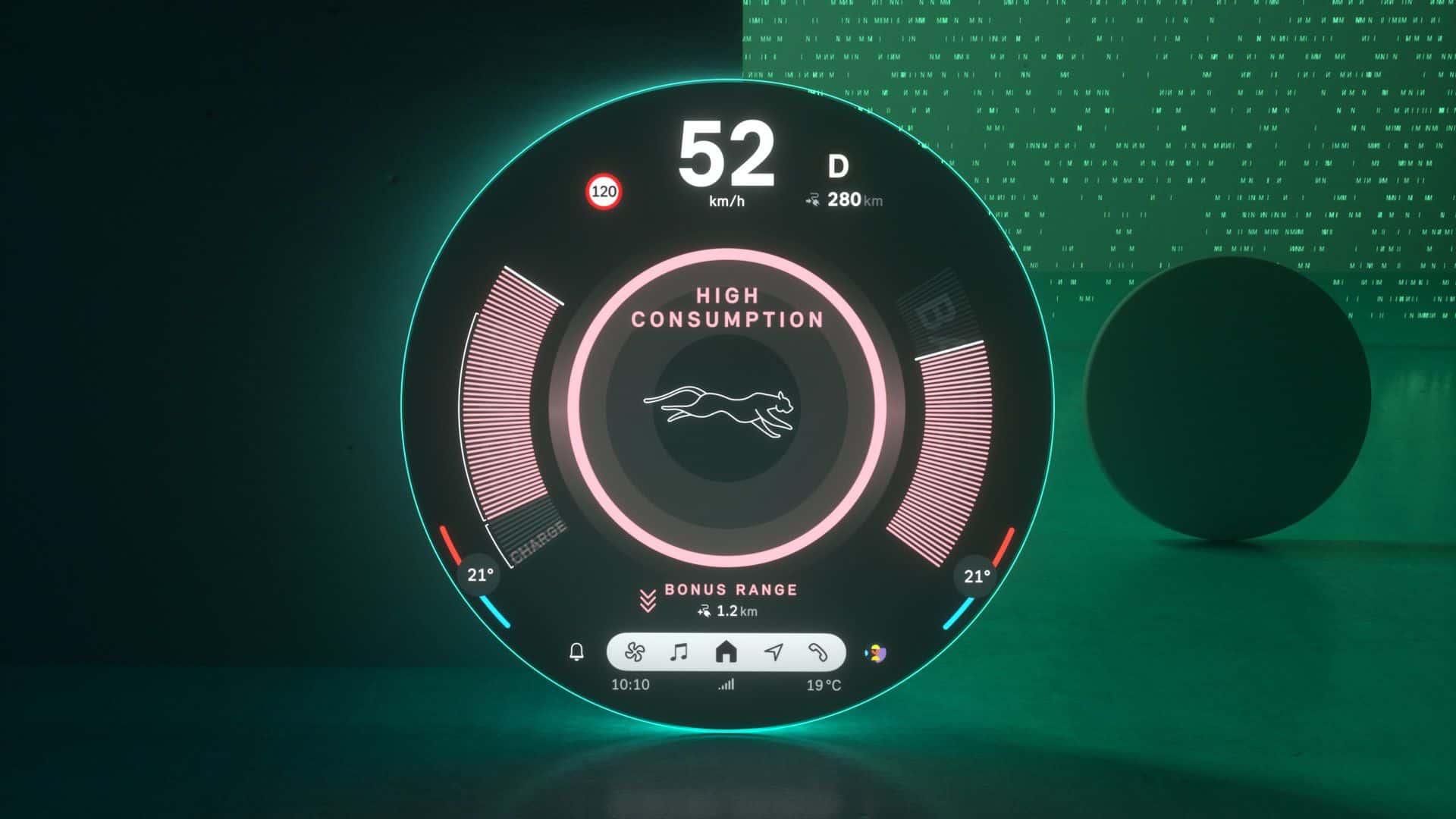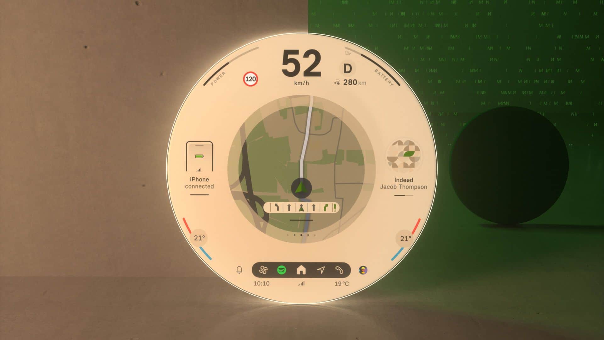 Located at the screen’s center is The start menu is ergonomically placed in the screen’s center offering a range of personalized content that can be easily selected and launched by swiping to the side. A fixed status bar is placed in the lower section of the screen is the fixed status bar with menu items such as “Navigation,” “Media,” “Telephony,” “All Apps,” and, situationally, “Home” for direct access.