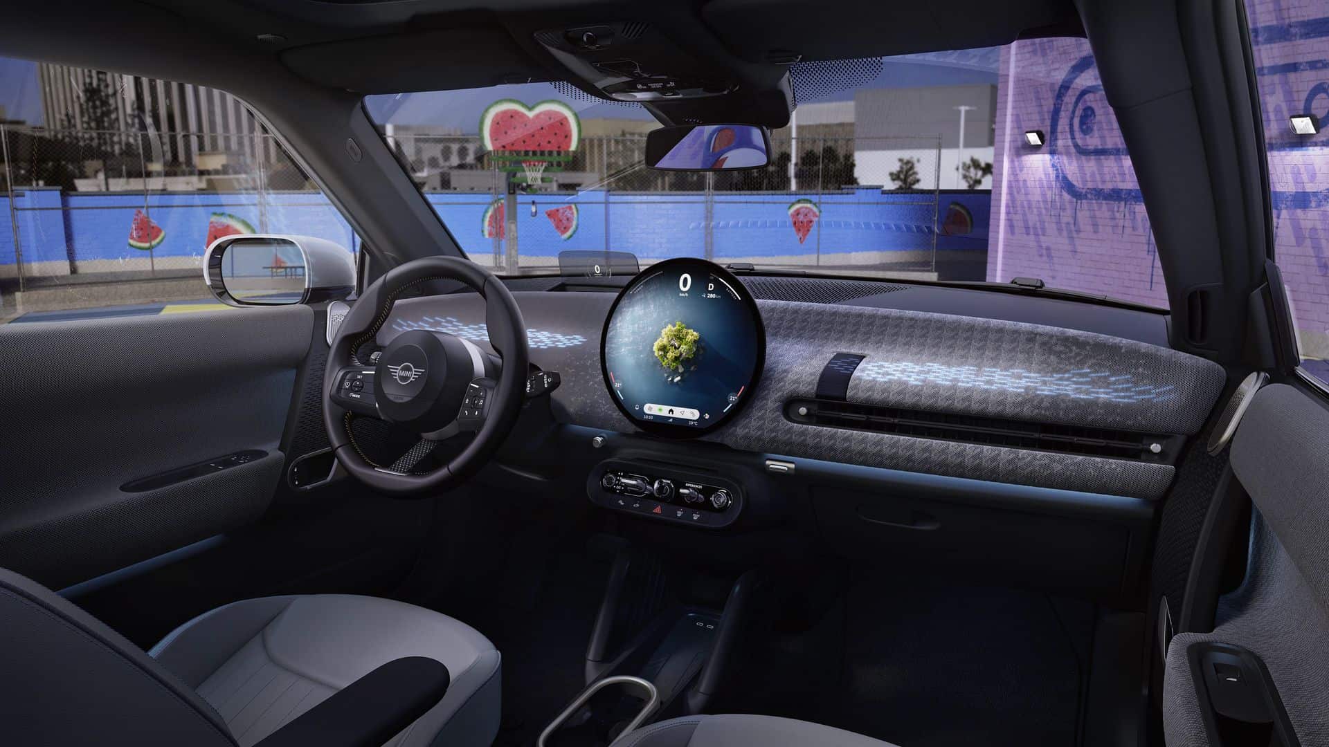 MINI says the position of the OLED display in the center of the dash will make it easier for both the driver and the front passenger to use. Much like BMW’s iDrive 9, the new MINI Operating System 9 will run on the Android Open Source Project (AOSP) software stack but obviously specifically adapted to better fit the needs of the British brand. Interestingly, customers will be able to optionally order a light projector mounted at the back of the big display that will discreetly illuminate the entire dashboard.