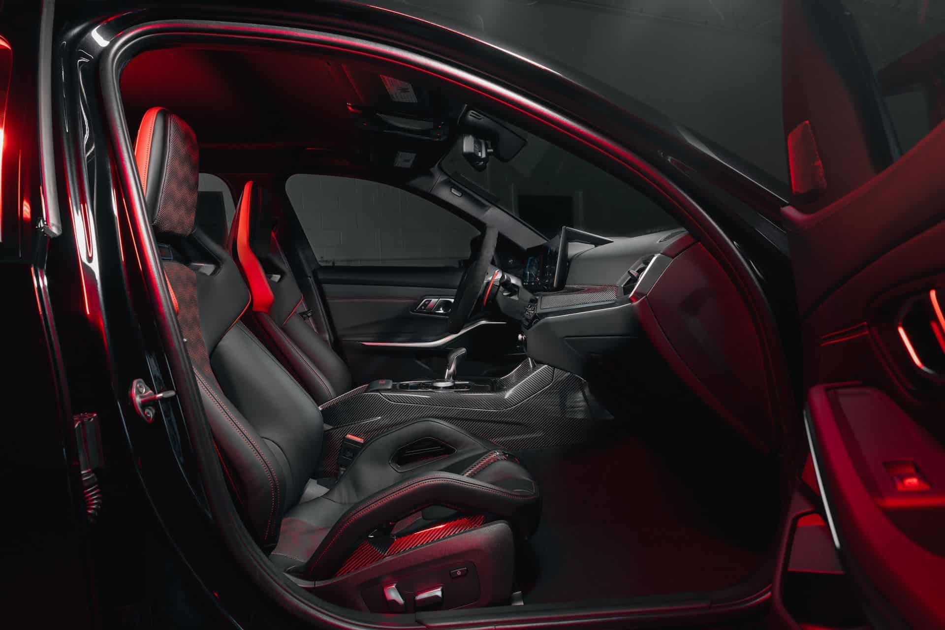 As captivating as its exterior, the interior of the 2024 BMW M3 CS leaves a lasting impression. Inside, you’ll be greeted by carbon bucket seats donning a striking two-tone color combination, complemented by a sleek carbon fiber center console. An interesting tidbit to note is the absence of cup holders, mirroring the characteristic of the M4 CSL. The most significant upgrades compared to the CSL model are the inclusion of iDrive 8 and a generously-sized curved display.