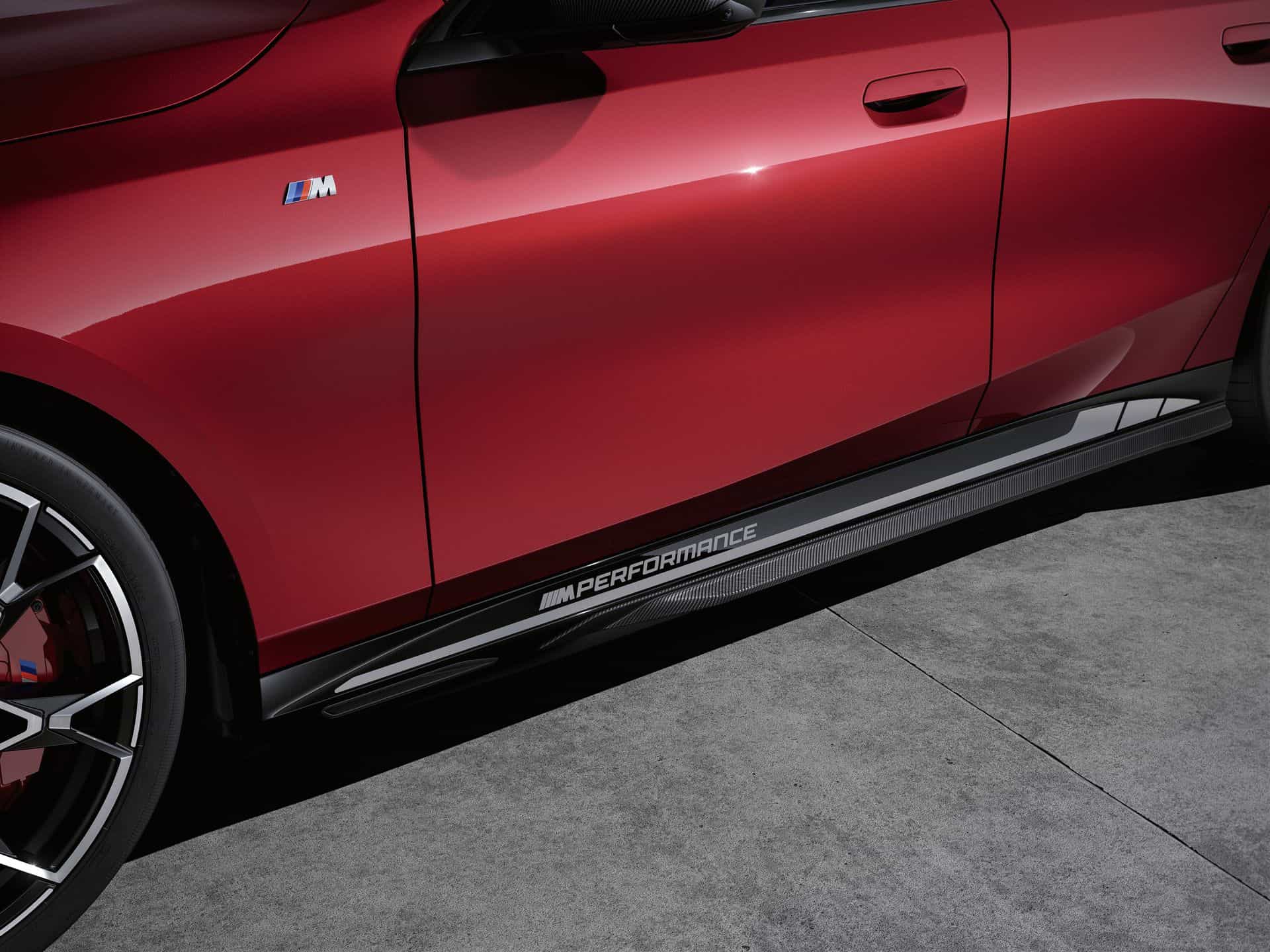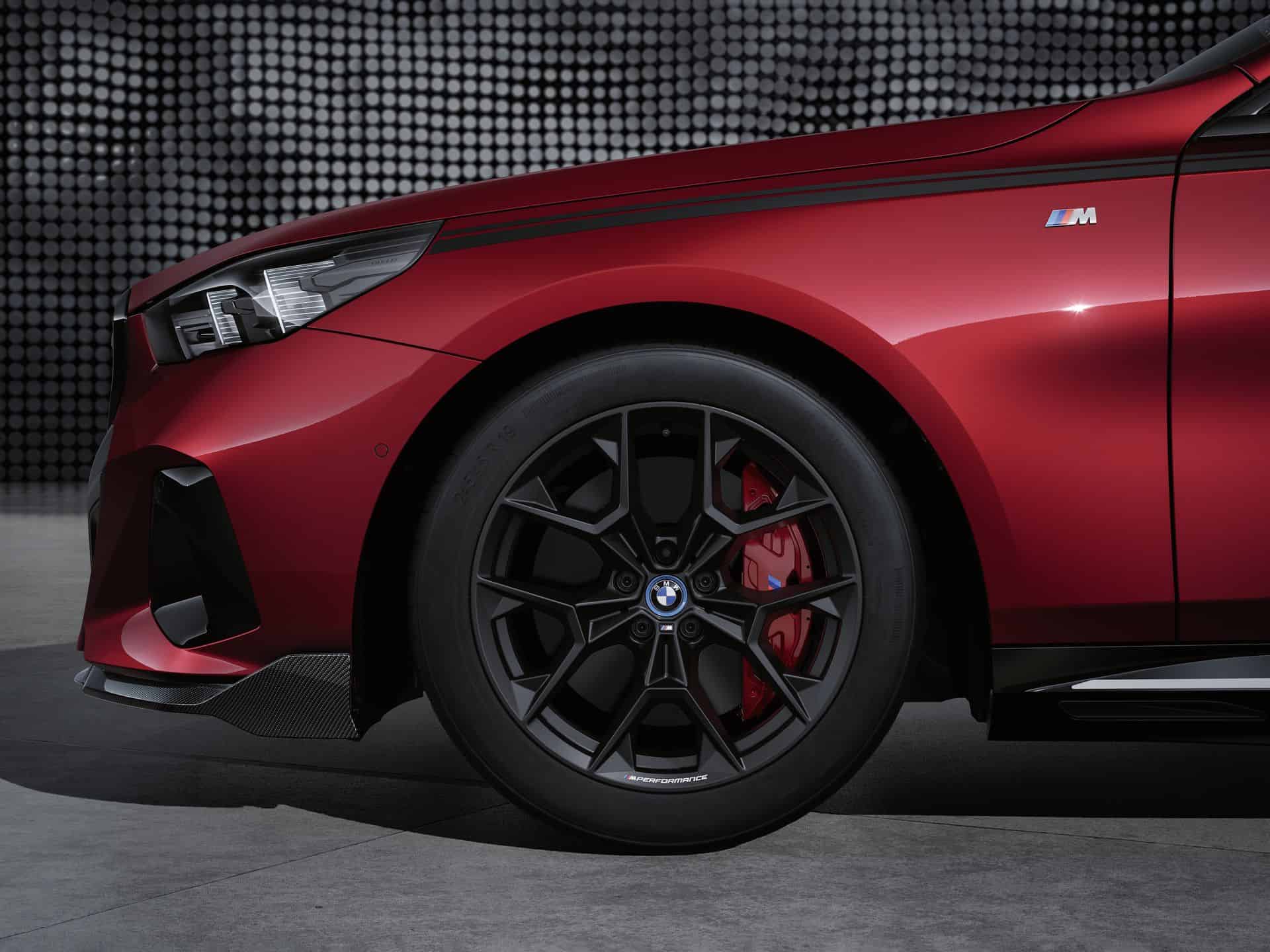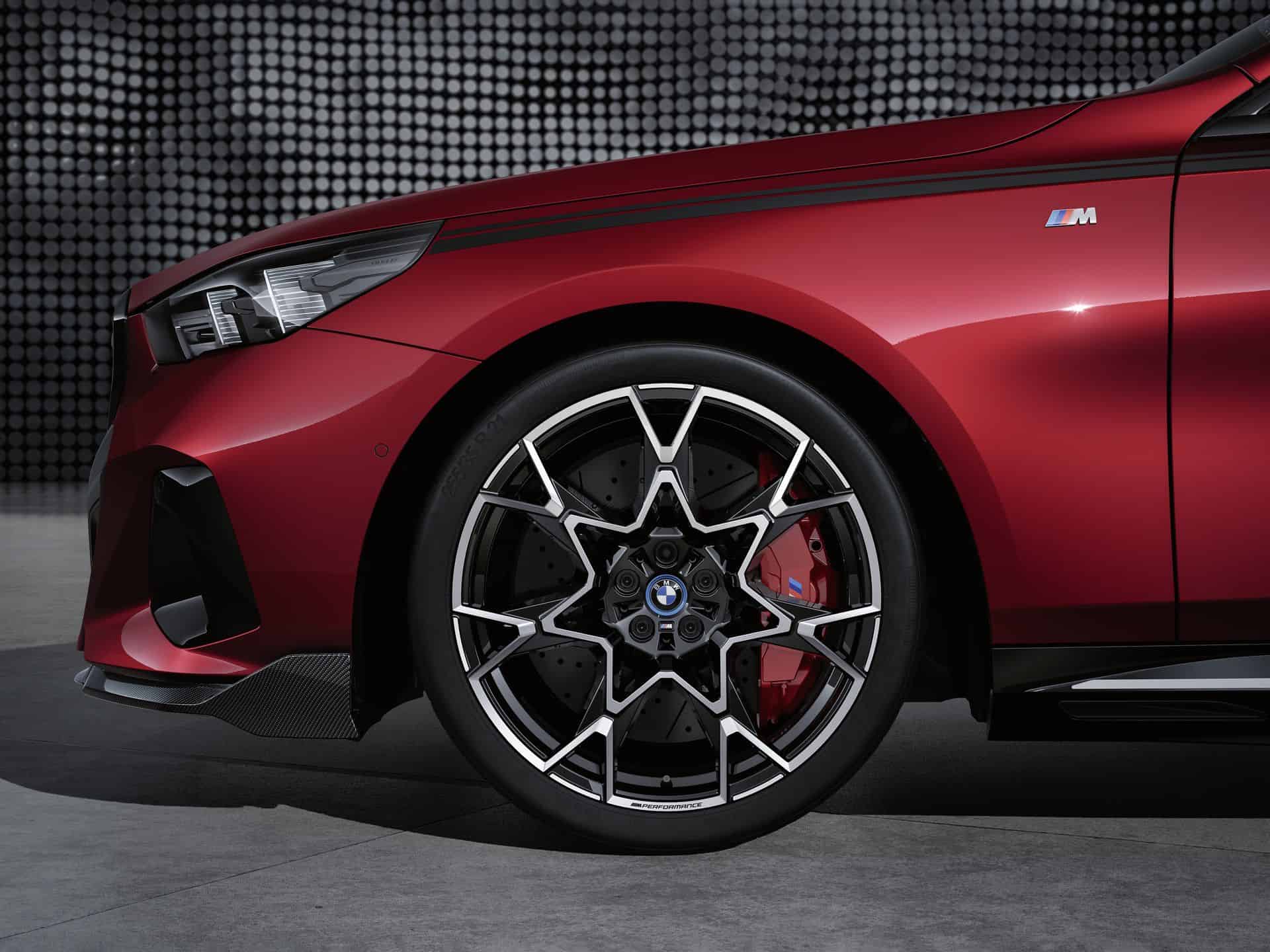 New wheels are also in the M Performance Parts catalog. You can choose from 19 and 21-inch wheel sets for a sporty and distinctive look. The 21-inch M Performance Cross-spoke wheels come in Jet Black gloss or Frozen Midnight Grey for all drive types. Matte black 19-inch Y-Spoke wheels are also available for summer and winter, except for the i5 M60 xDrive model. Naturally, you can also order M Performance 20-inch brakes with red-painted calipers.