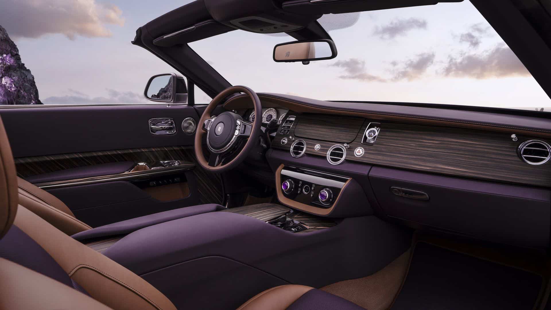 Living up to its name, the Amethyst Droptail incorporates rare amethyst gems in the rotary dials as well as at the base of the Spirit of Ecstasy figurine. Other high-end details vary from woven leather floor mats to a one-of-a-kind, handmade Vacheron Constantin timepiece. Then there’s the removable hardtop, which benefits from an electrochromic glass to go from opaque (with a purple tint) to transparent at the touch of a button. To obtain the perfect tint, no fewer than 60 glass samples were necessary.