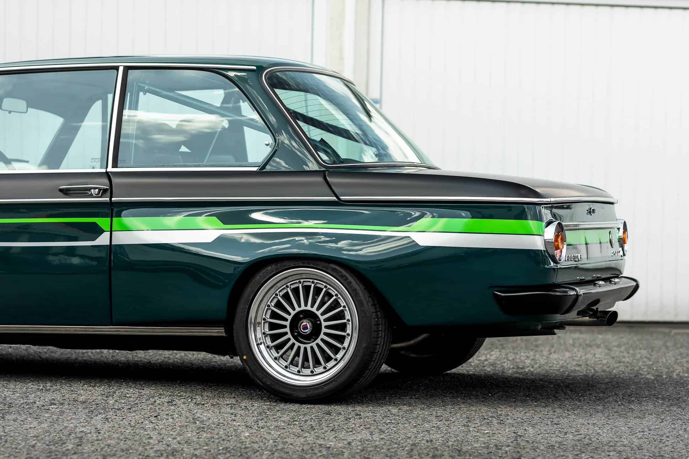 Period-correct decorative stripes and decals add to the nostalgia, and those bright green accents continue inside where there are Scheel seats for the driver and front passenger. In the rear, Manhart mounted a Clubsport roll bar but the bench is still there.