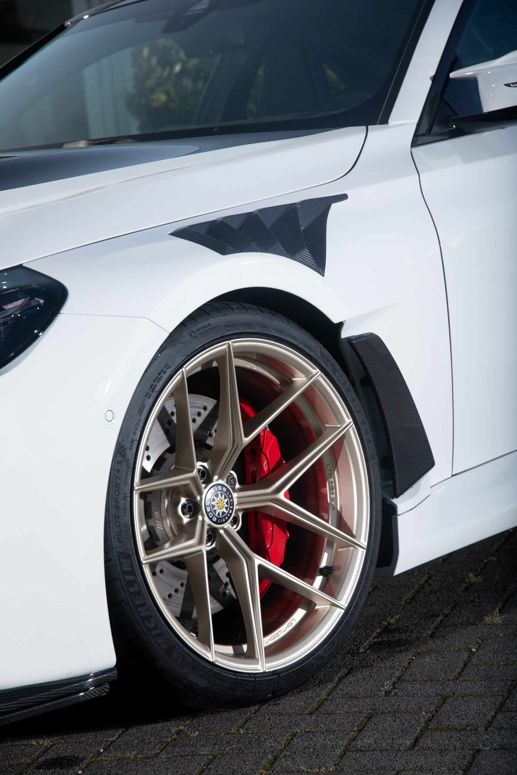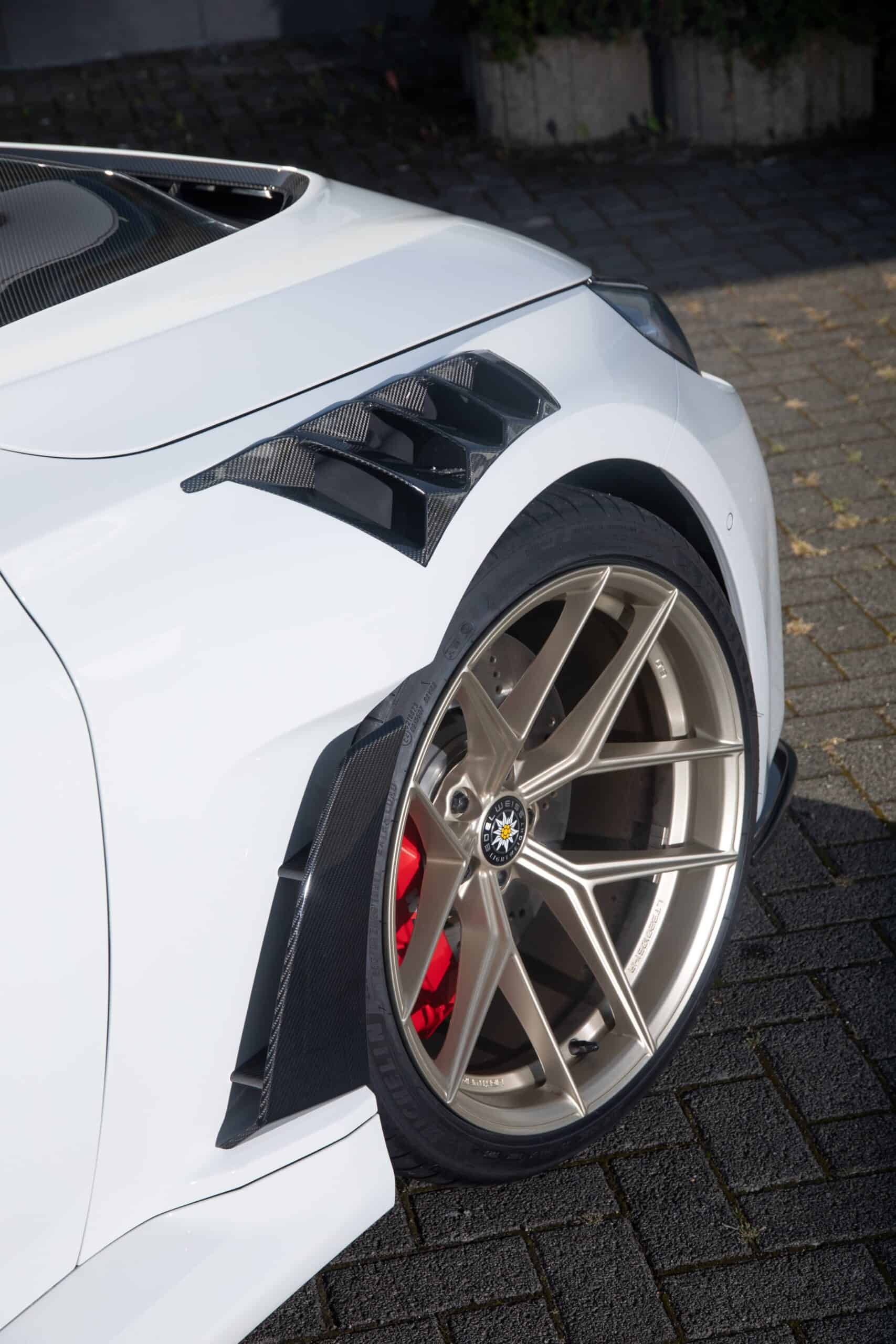Rounding off the changes are the custom grille, diffuser, and underfloor – all of which are made from carbon fiber – and the one-piece Edelweiss wheels measuring 20 inches at the front and 21 inches at the rear. The new shoes have a champaign-like color to contrast the body and come wrapped in Michelin Pilot Sport 4S tires 285/30 R20 front and 305/25 R21 rear rubber. At an additional cost, the German tuner can also fit the G87 with a Road & Track suspension developed by Öhlins.