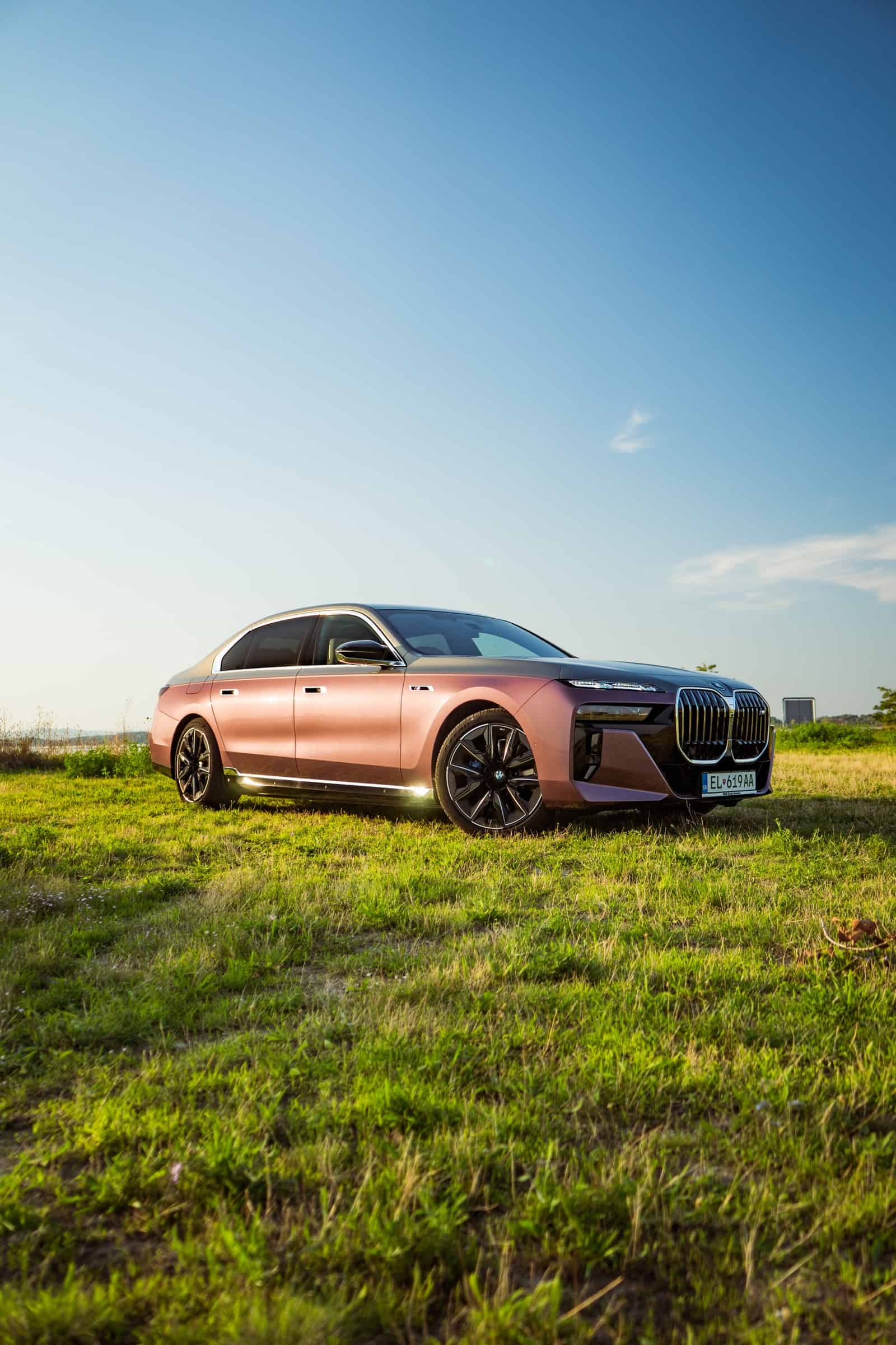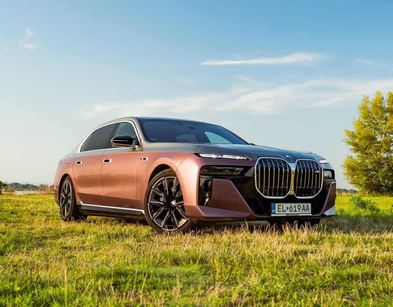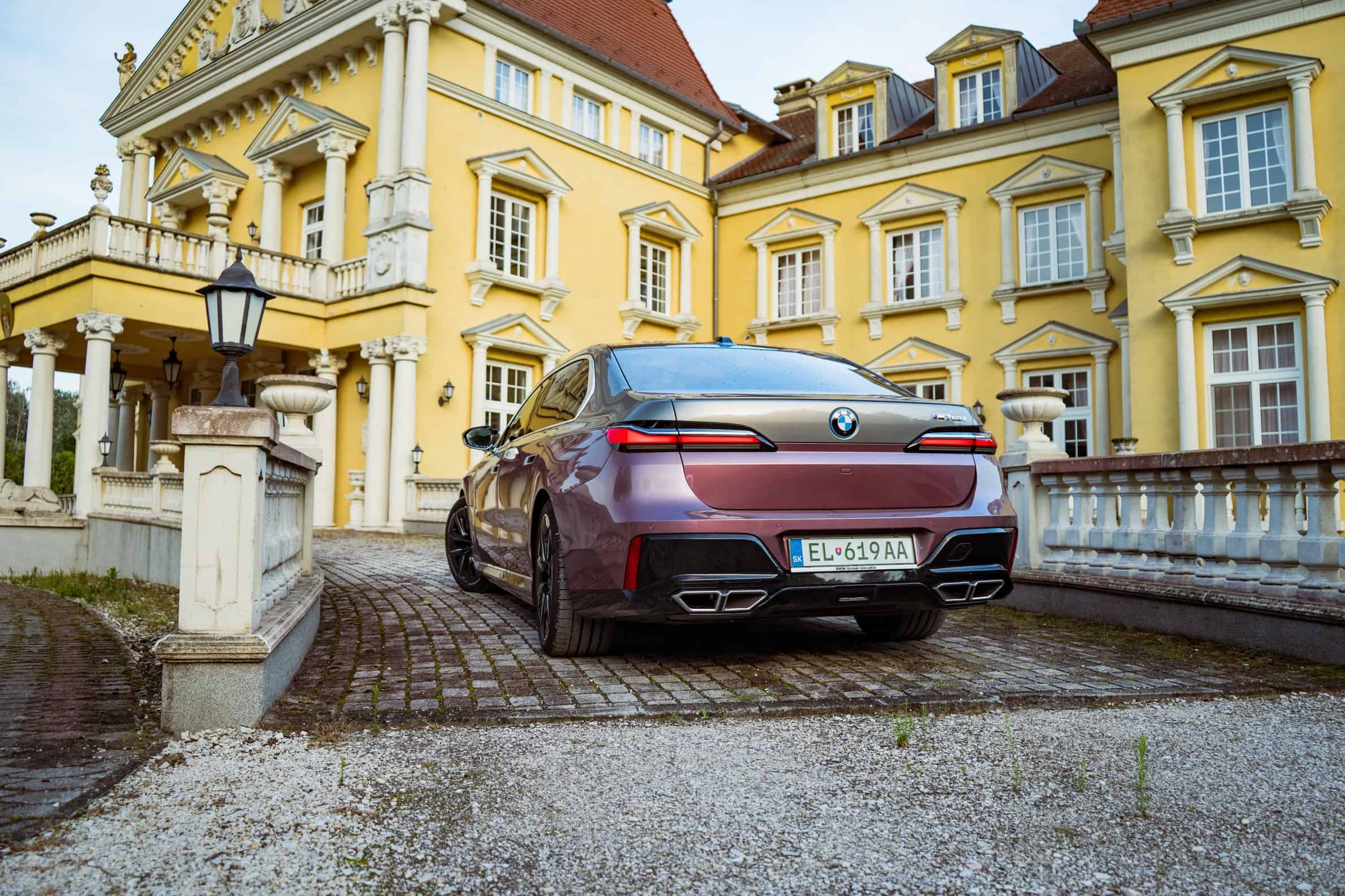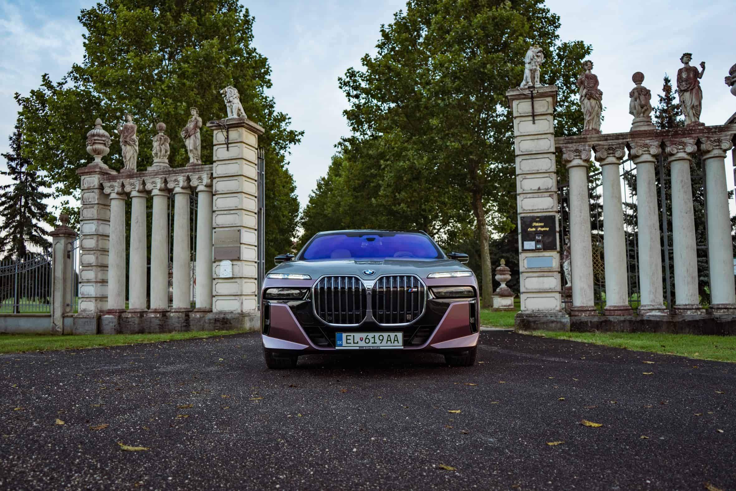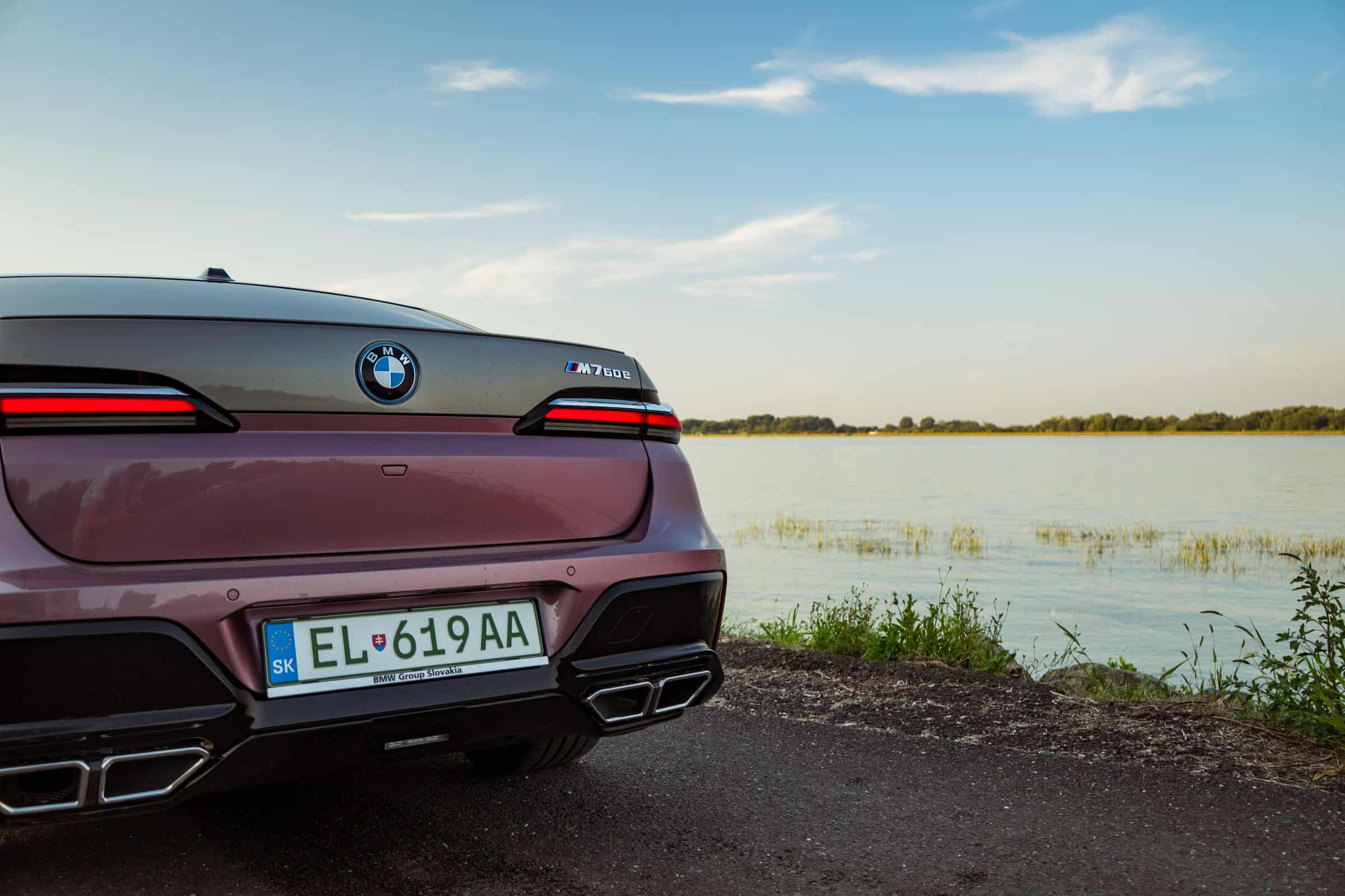 BMW Slovakia had the opportunity to shoot this two-tone M760e as well as the 2024 X5 M Competition finished in Wildberry we talked about the other day. Aside from the fancy paint job, the stately sedan also has the larger 21-inch wheels (909 M style) with a two-tone finish. Being an M Performance 7er, it flaunts an M badge above the charging port on the front fender and another one on the kidney grille. In addition, it can be visually distinguished by its quad exhaust system.