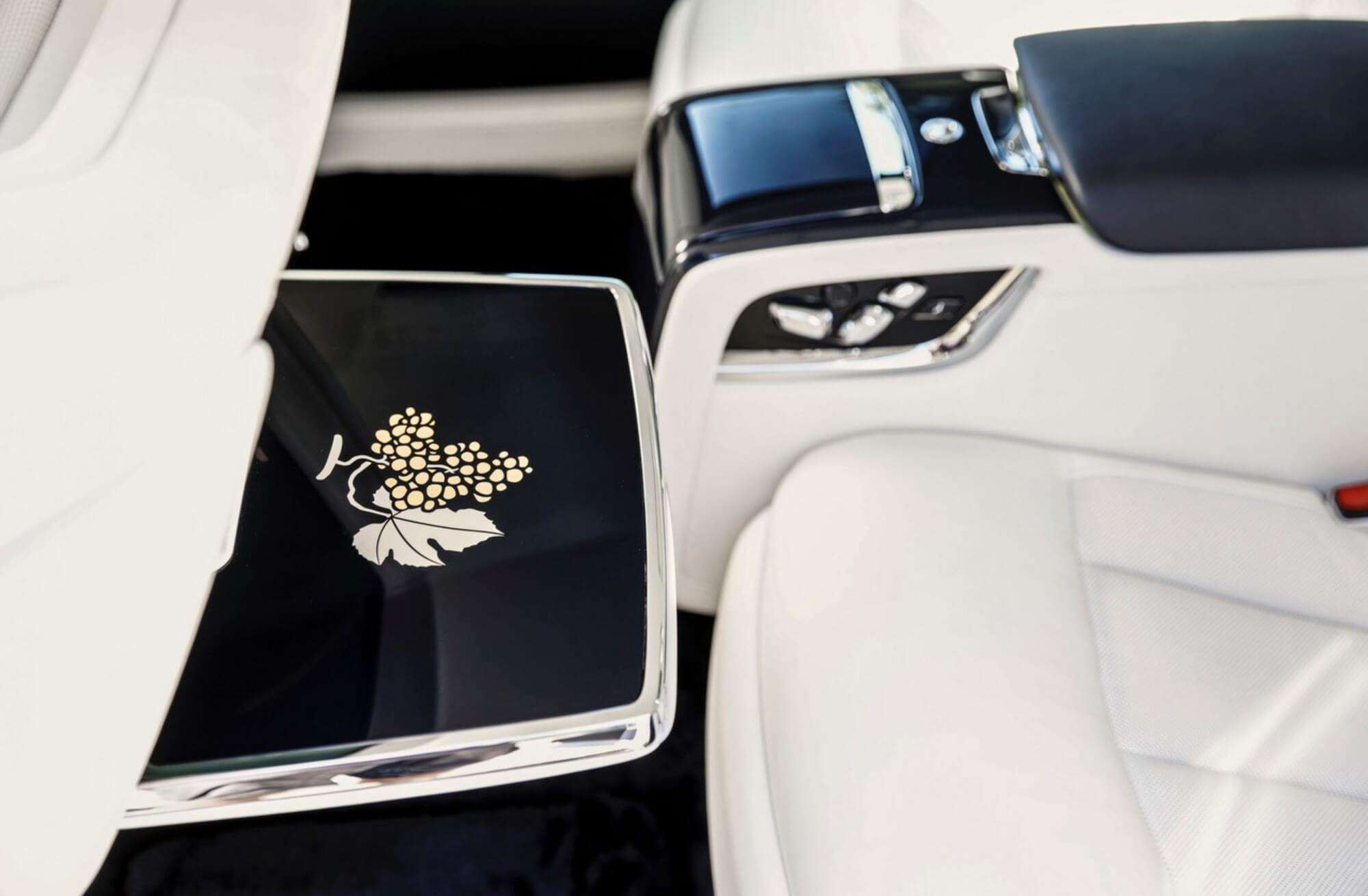 Finished in Grace White and Navy Blue leather with Jasmine accents, the exquisite cabin has no fewer than 9,215 stitches in each of the rear doors. They’re adorned with grape-branch embroidery and are joined by a supplementary grape motif taking the shape of a stainless steel and gold plating inlay on the picnic tables.