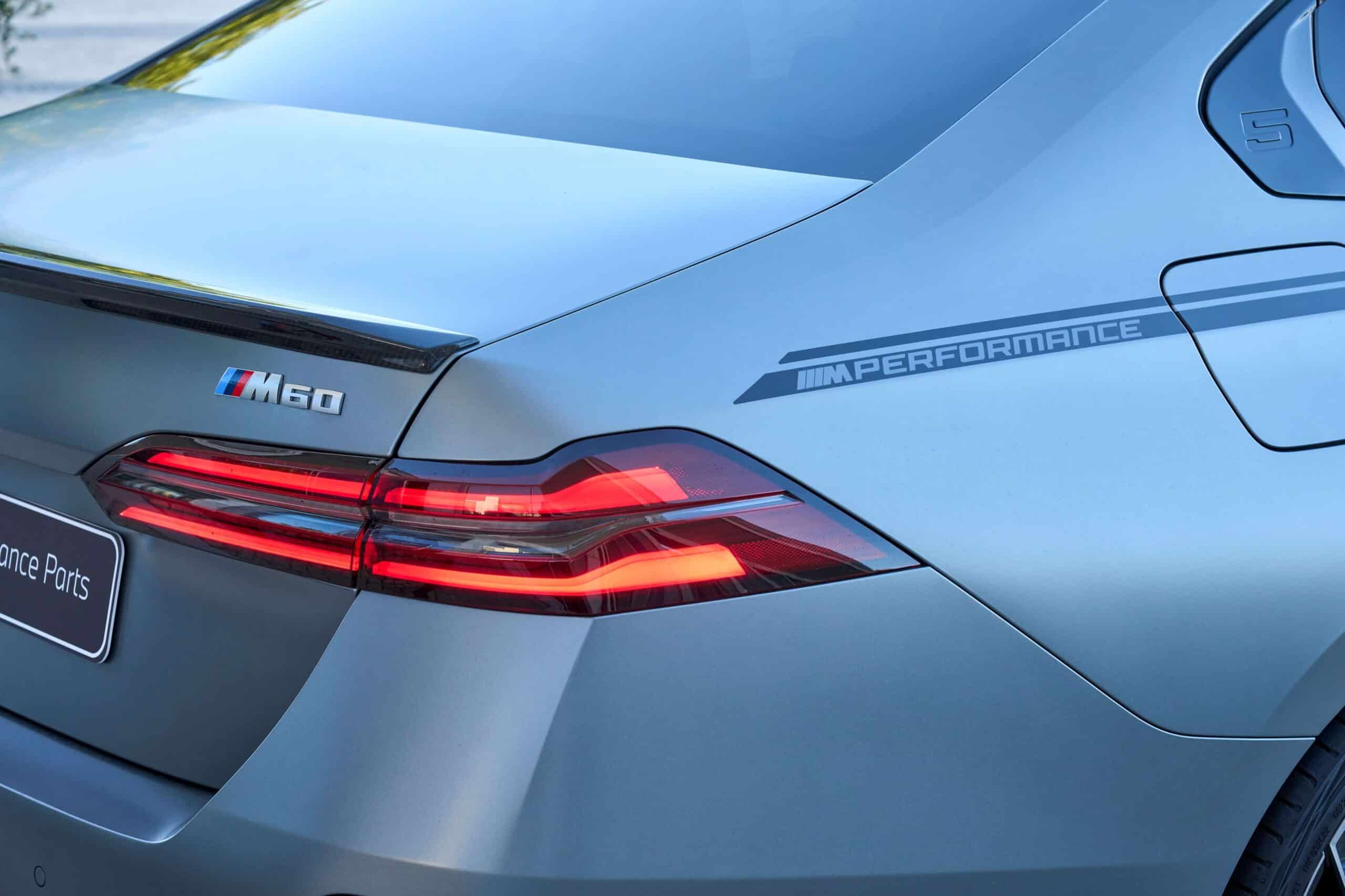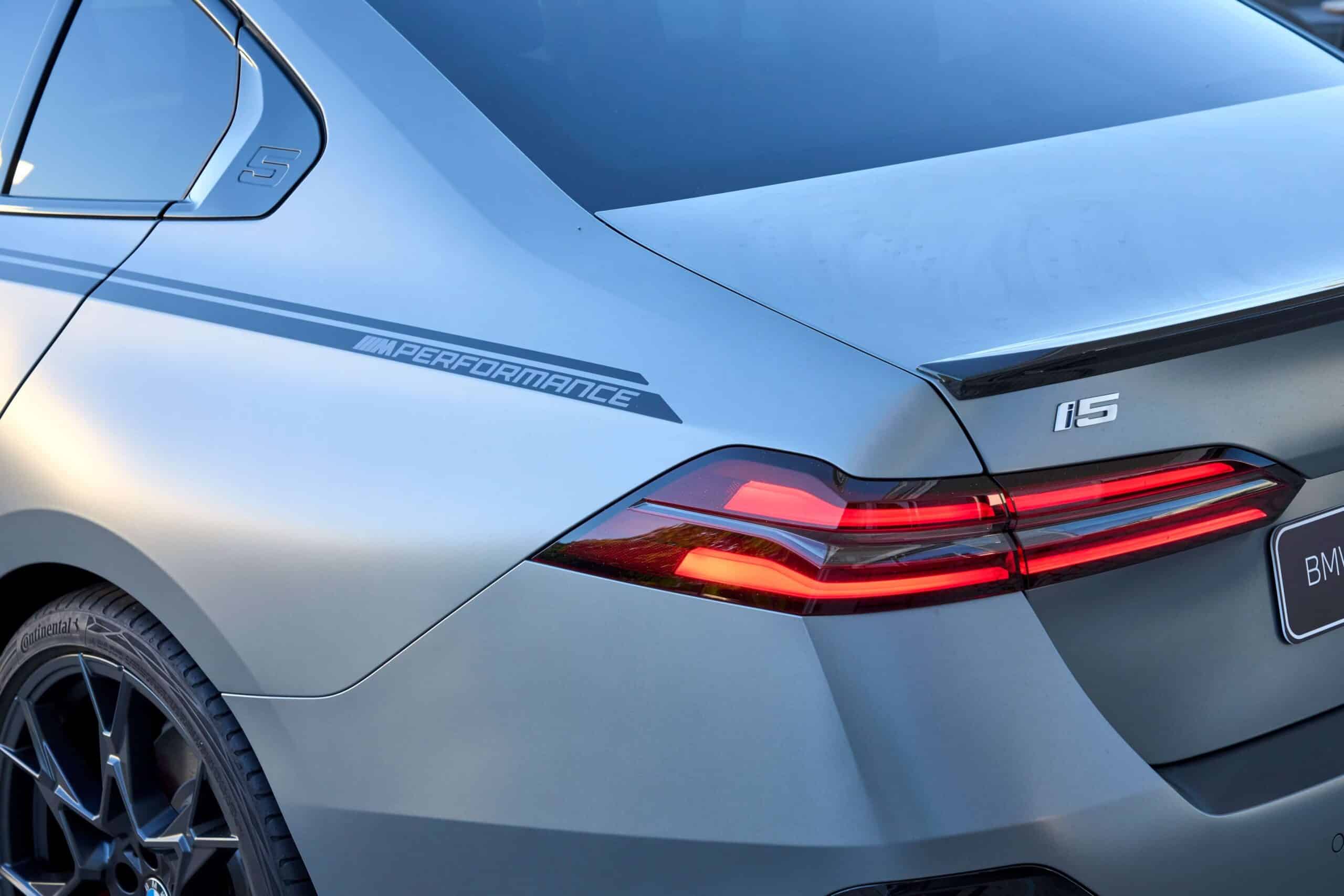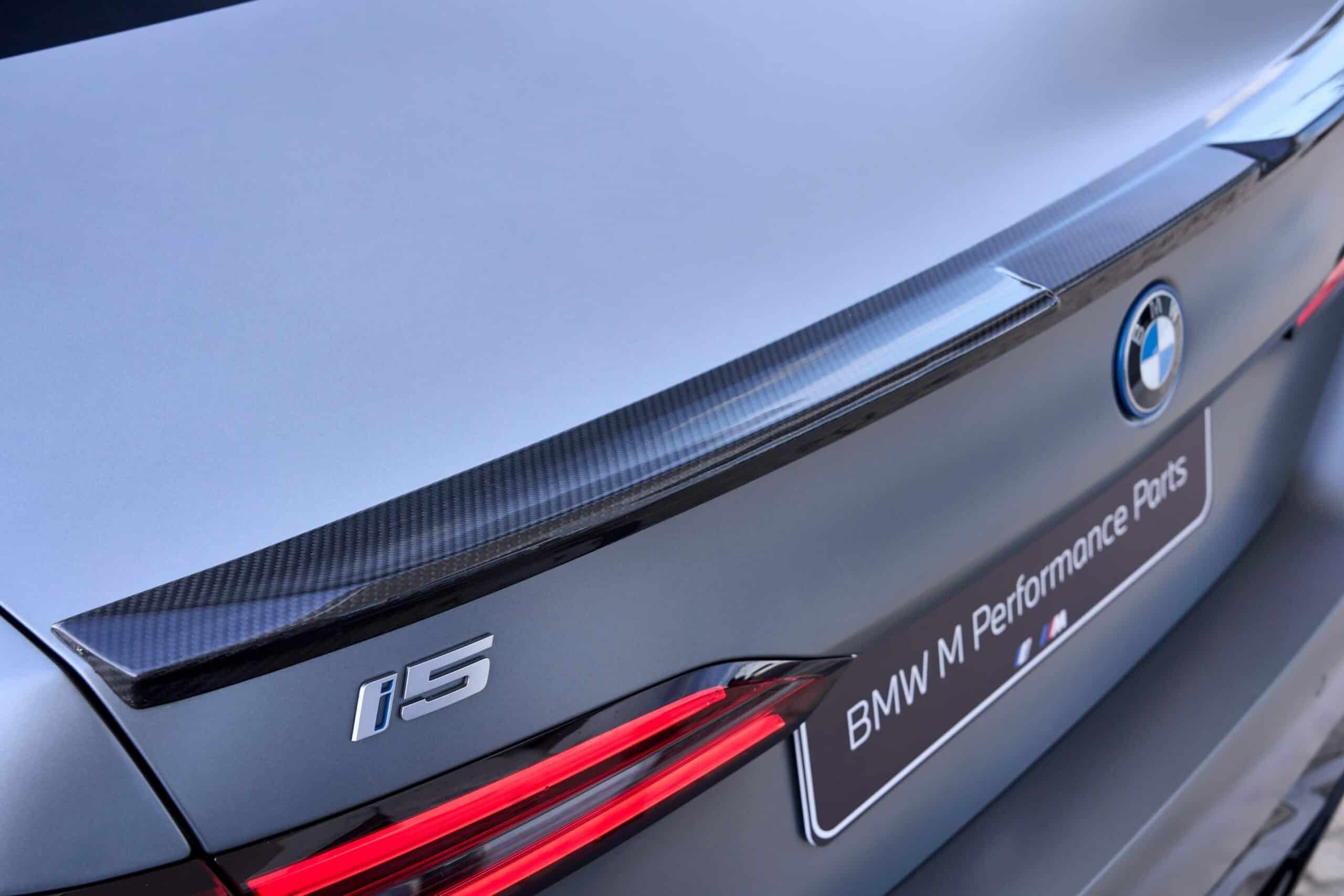 From the wheels with M-branded valve caps to the carbon fiber shark fin antenna, this 2023 BMW i5 M60 is filled to the brim with goodies from the MPP catalog. It looks as though windshield and rear glass stickers are still a thing in 2023, and this sporty electric sedan goes the extra mile with body decals on the sides of the car.