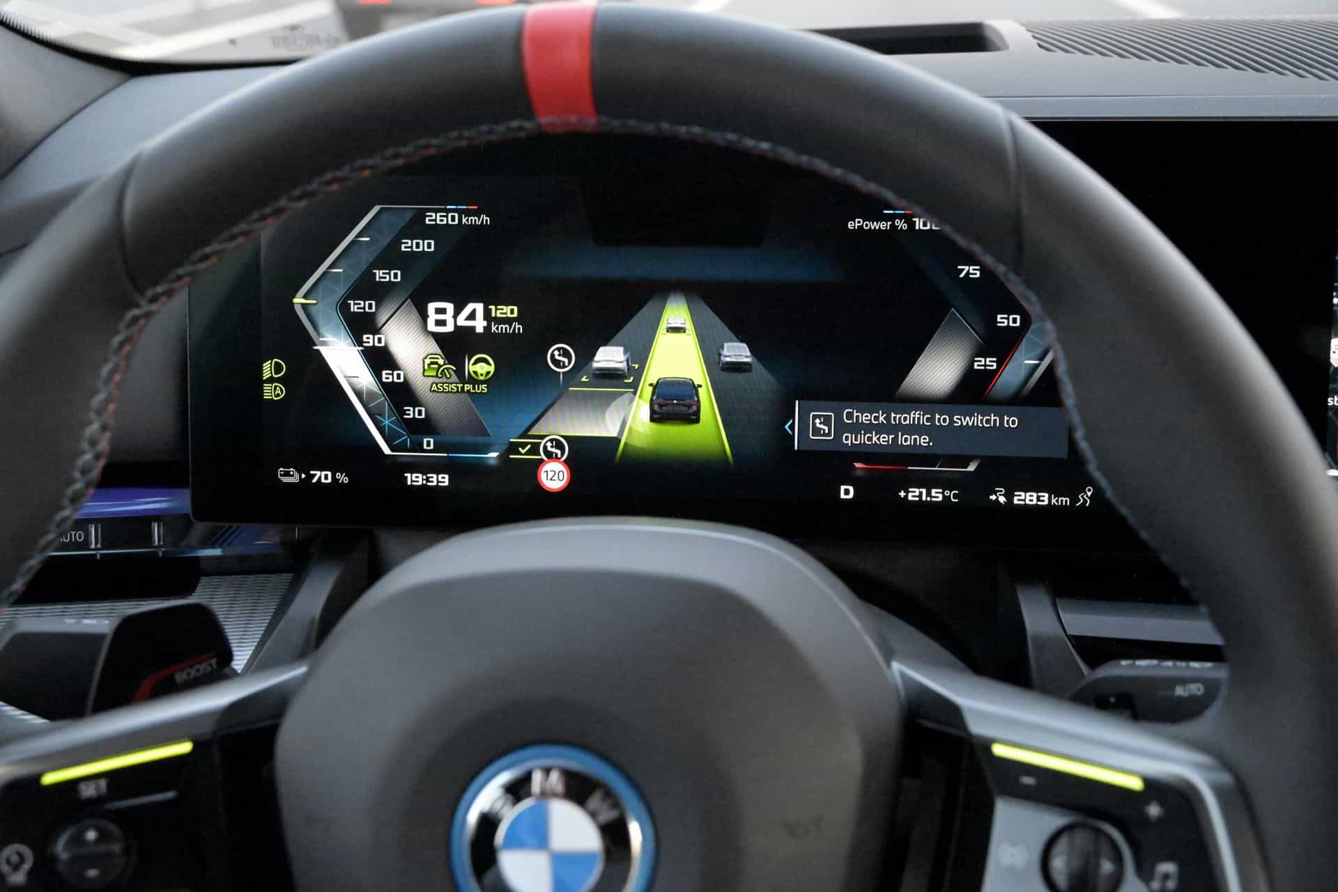 In terms of advanced driver assistance systems (ADAS), the BMW i5 models boast an impressive array, with 40 driver assistance systems, 20 sensors, and an 8-megapixel camera, complemented by a full-range radar capable of detecting objects up to 300 meters away. Every i5 comes equipped with Automatic Park Assistant and Backup Assistant for automated maneuvering in reverse. The standout feature is actually the Automatic Lane Change. Essentially, it’s a simpler way to change lanes by turning your head to the left or right. It might be a gimmick, but after I tested it for a while, I came to like it.