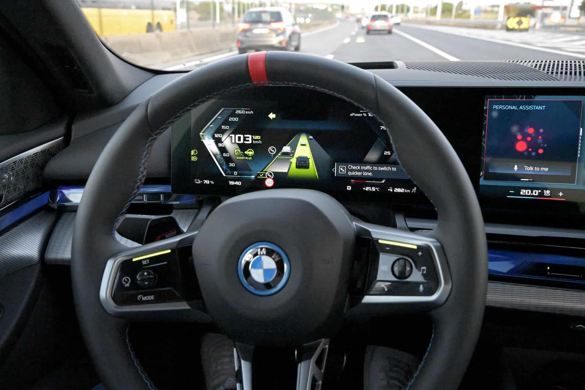From the get-go, it’s abundantly clear that the BMW i5 M60 is a true powerhouse. With its 590 horsepower, the electric sedan’s acceleration is exceptionally smooth and gradual. Yet, a mere tap on the accelerator pedal unleashes a surge of power, even more so when using the Boost Mode (83 extra horsepower for 10 seconds). Despite its weight, which surpasses that of the i4 M50 at 2305 kg (5081 lbs) according to DIN standards, the springs are impressive. While it may not reach the 650-horsepower mark of the latest BMW i7 M70, it’s almost as quick, clocking in at 3.5 seconds for the 0 to 60 mph sprint compared to the i7’s 3.7 seconds. I clocked 3.61 seconds on the GPS RaceBox.
