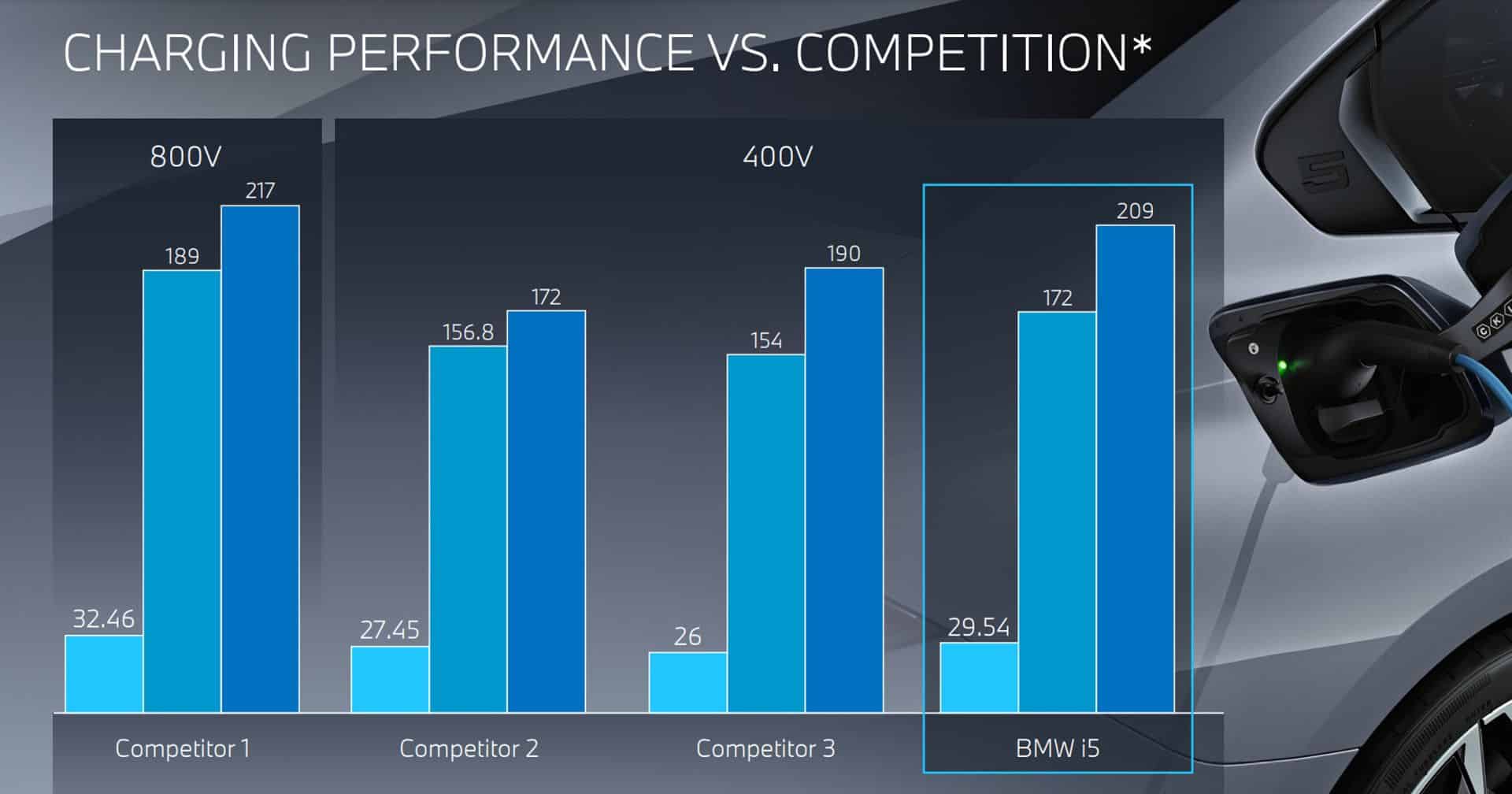Interestingly, roughly that same 10 percent separates the BMW i5 from other EVs that use 400-volt charging. In 10 minutes, rivals restored 27.45 and 26 kWh, while the i5 brought in 29.54. BMW measured average charging performance to be 156.8 and 154 kW in competitors – the i5 managed 172 kW. Max charging capped out at 172 kW and 190 kW for others, while the i5 dominated with 209 kW.