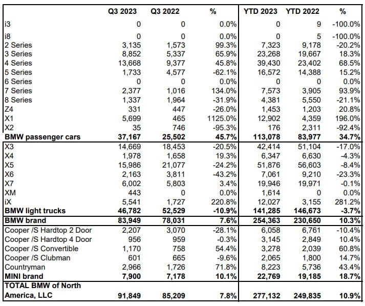 In related news, the adjacent table shows what worked in Q3 2023 and what didn’t. Deliveries of the X1 jumped by 1,125% compared to Q3 2022, fueled by the launch of the new generation. The fully electric iX also enjoyed a huge boost in sales as demand rose by 220.8% over the same quarter of last year. BMW’s flagship car, the 7 Series, went up by 134% thanks to the all-new model and its electric i7 sibling. The 2 Series, 3 Series, 4 Series, X4, and X7 also saw a spike in demand.