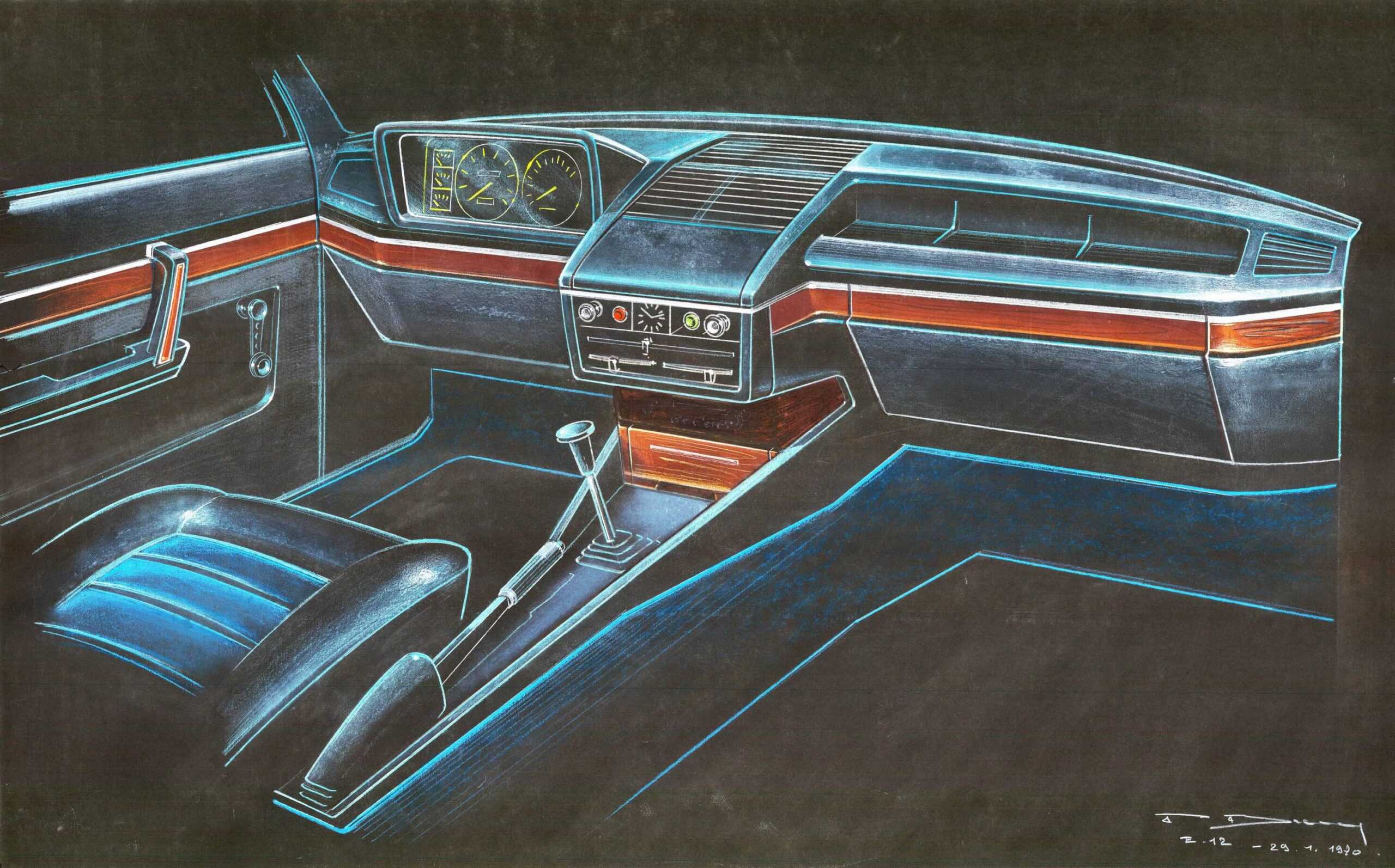 One of those 10 large panels we mentioned earlier contains sketches of the 7 Series E23 with hidden headlights that make the luxury sedan look absolutely amazing. The design was penned in 1973 or 1974 but production of the original 7er didn’t start until 1977.