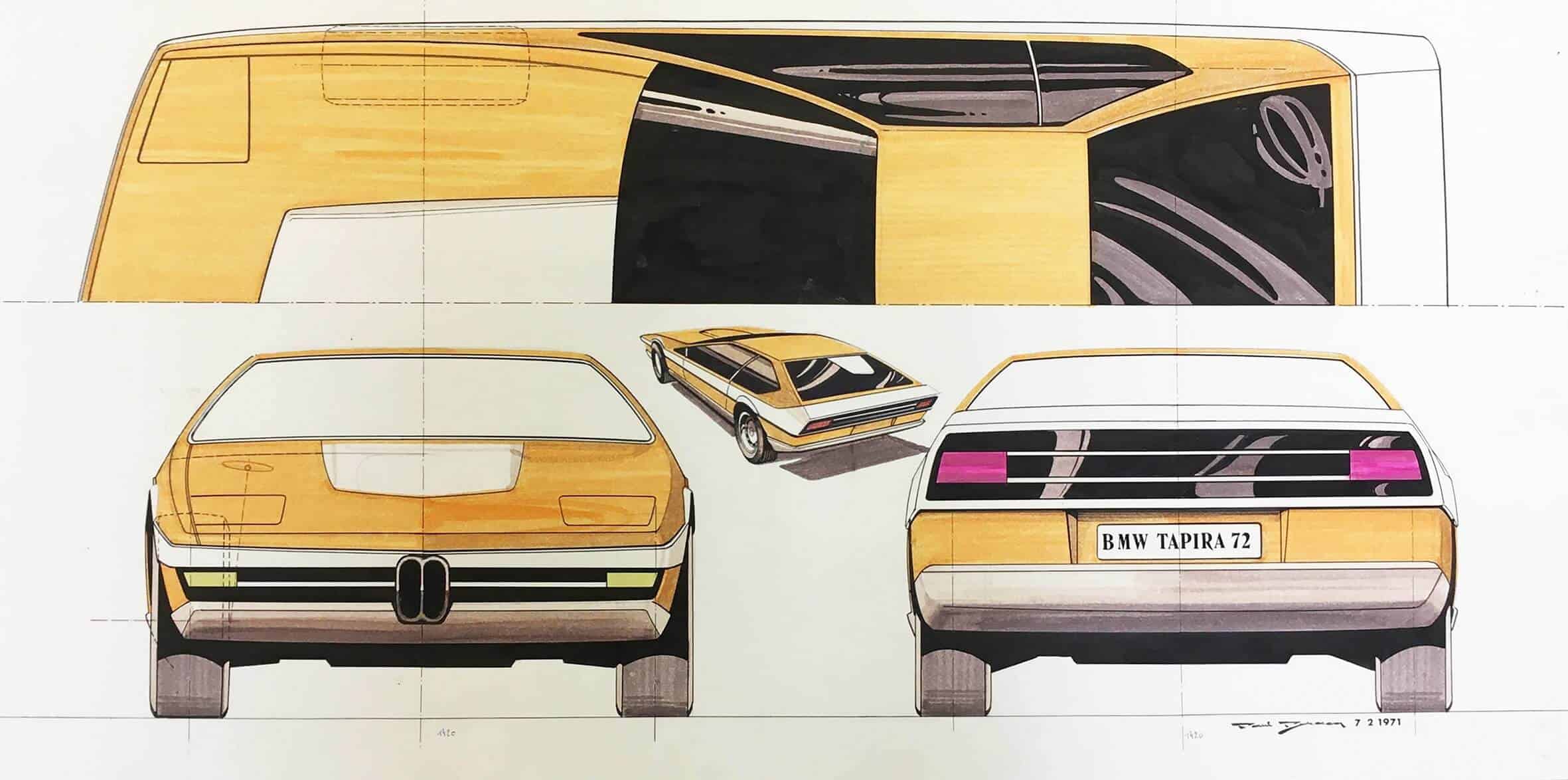In addition, attendees can check out the lesser-known 1971 Tapira, which went on to become the Turbo a year later. Another sketch depicts the facelifted 02 Series launched in 1971. Then there’s the BMW 1600 TI / E19 Roadster, a two-seater roadster based on the 1600 TI designed by French company Brissonneau & Lotz. BMW commissioned the design in 1967, and in the same year, Paul Bracq arrived at B&L to lead this project.