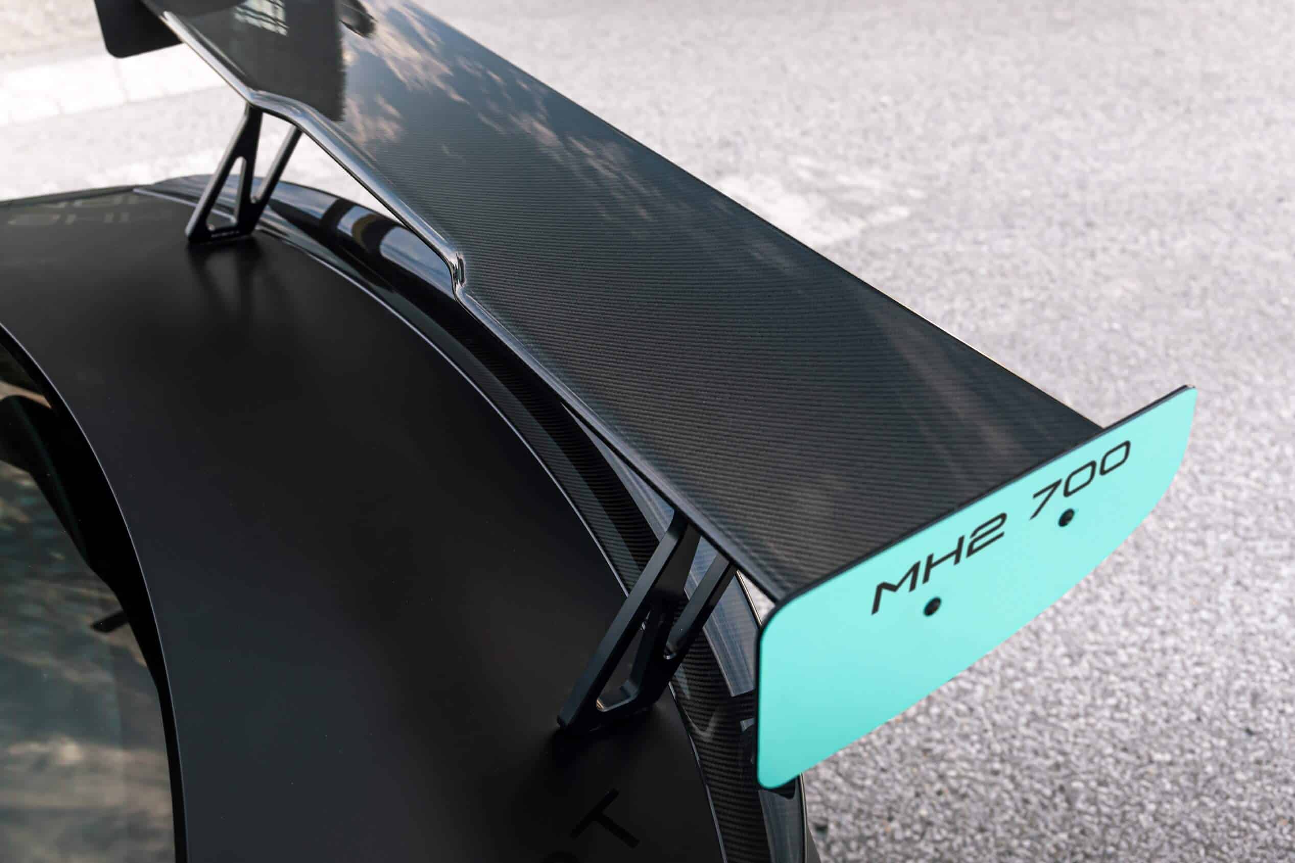 This sinister-looking sports coupe has mint green contrasting accents and Manhart MH2 700 written all over the car as well as on the end plates of the look-at-me rear wing. It rides on the tuner’s own 20-inch Concave One wheels with 265/25 ZR20 front and 295/25 ZR20 rear tires and there’s also a KW coilover suspension. For more visual drama, there’s a prominent hood bulge and plenty of carbon fiber accents.