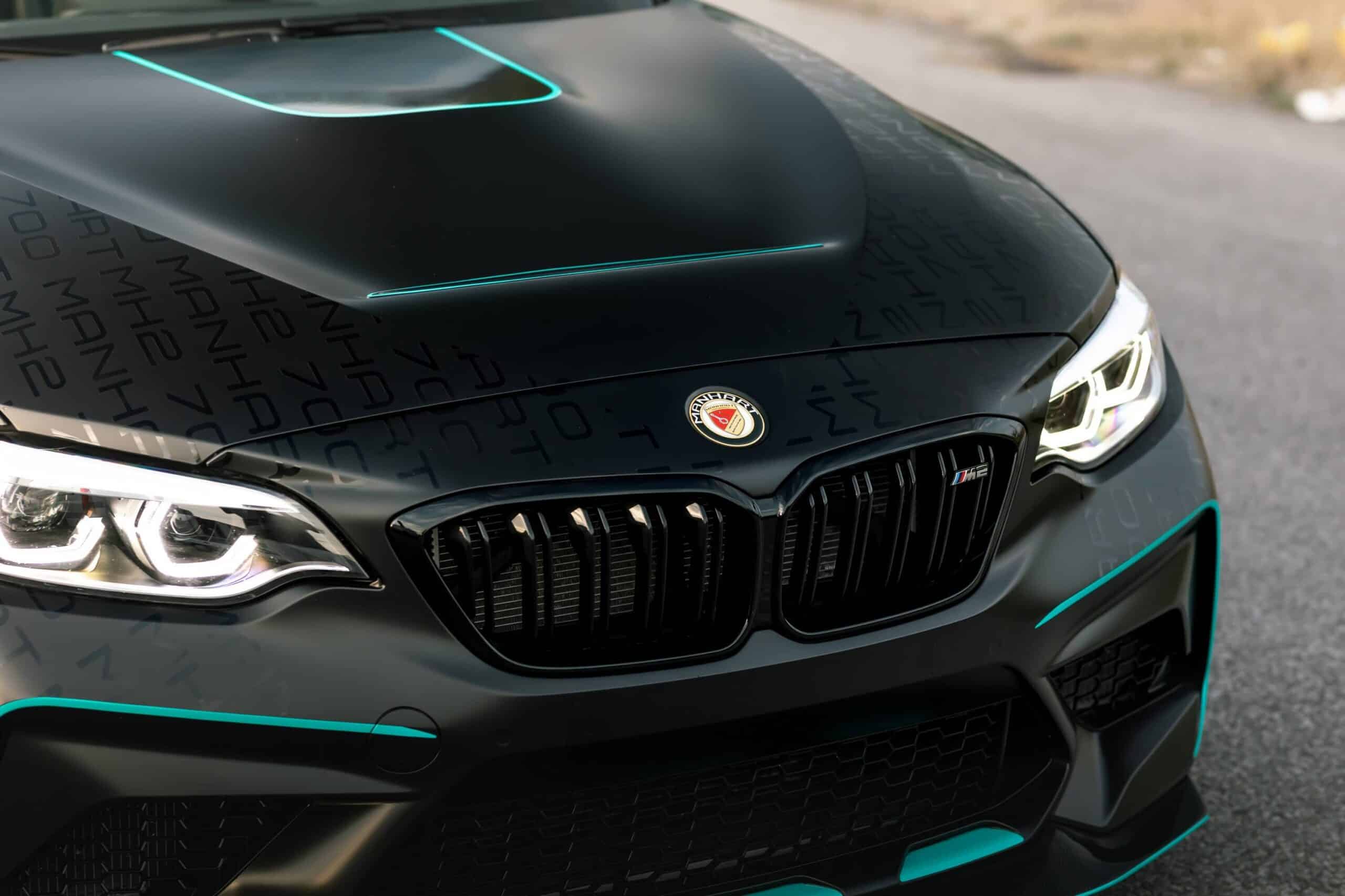 Yes, this previous-generation M2 is a hardcore two-seater that has had its twin-turbo 3.0-liter engine dialed to an absurd 715 horsepower. The inline-six S55 delivers a mountain-moving 815 Newton-meters (601 pound-feet) of torque following several hardware changes. The aftermarket specialist installed upgraded turbos, a custom intercooler, a carbon intake, and aluminum charge pipes. In addition, there’s now a stainless-steel exhaust with valve control and quad 100-mm tips with a matte black finish.