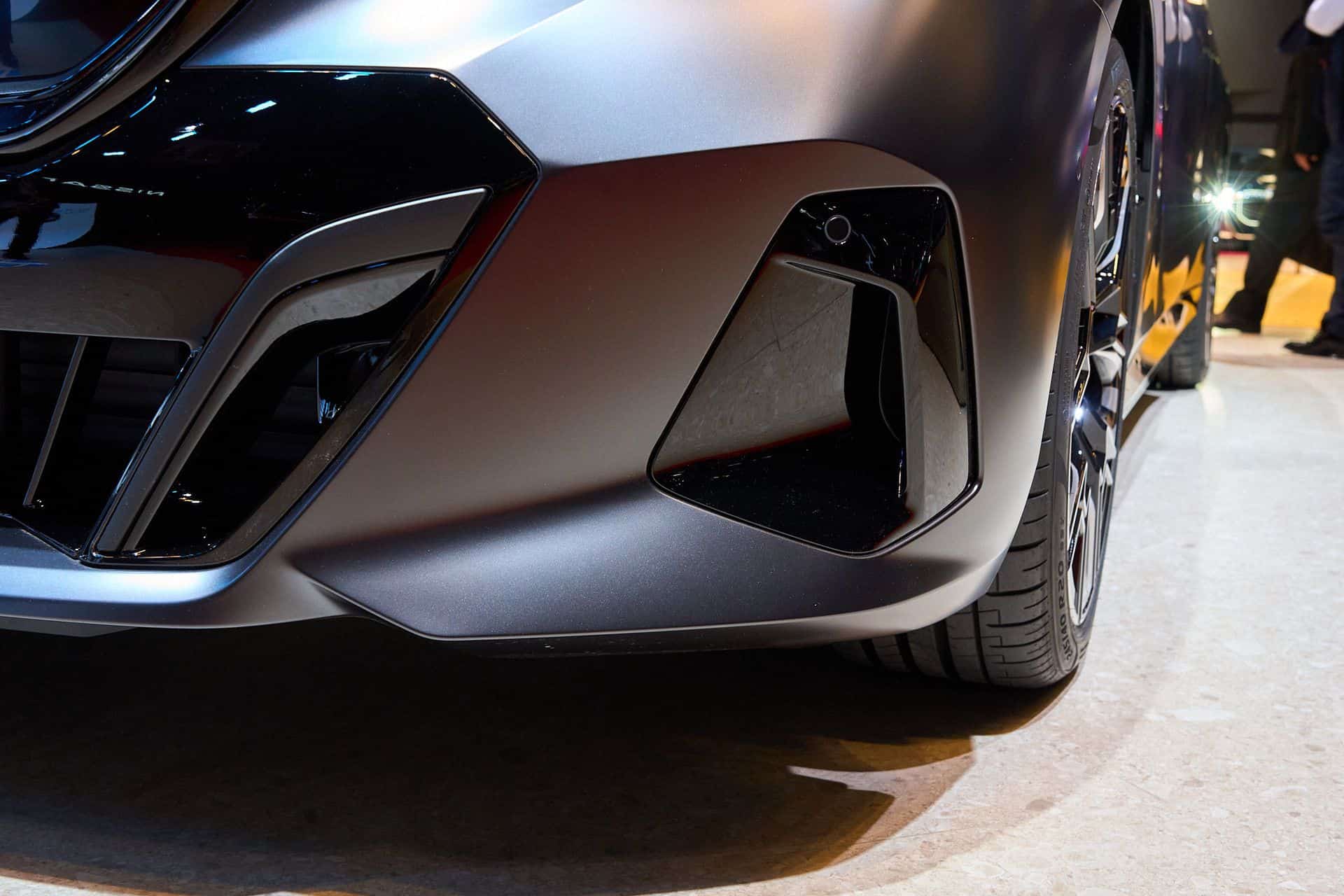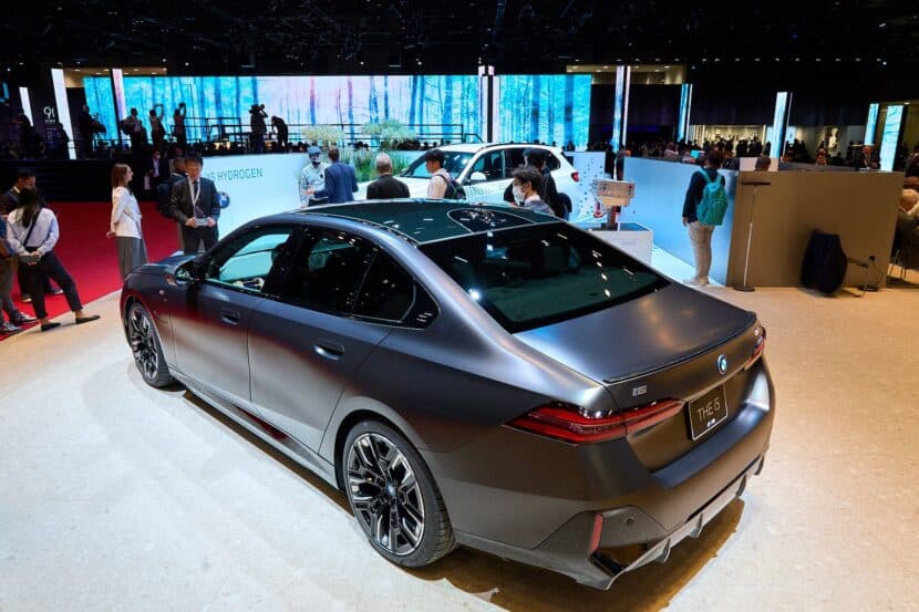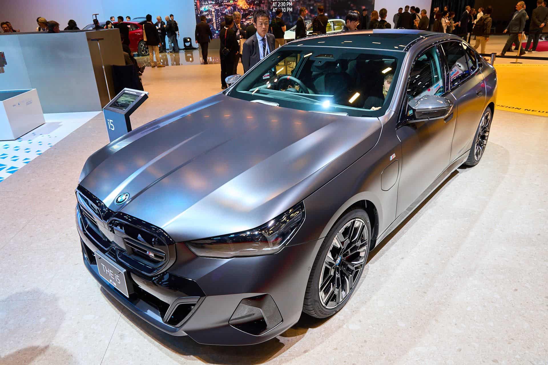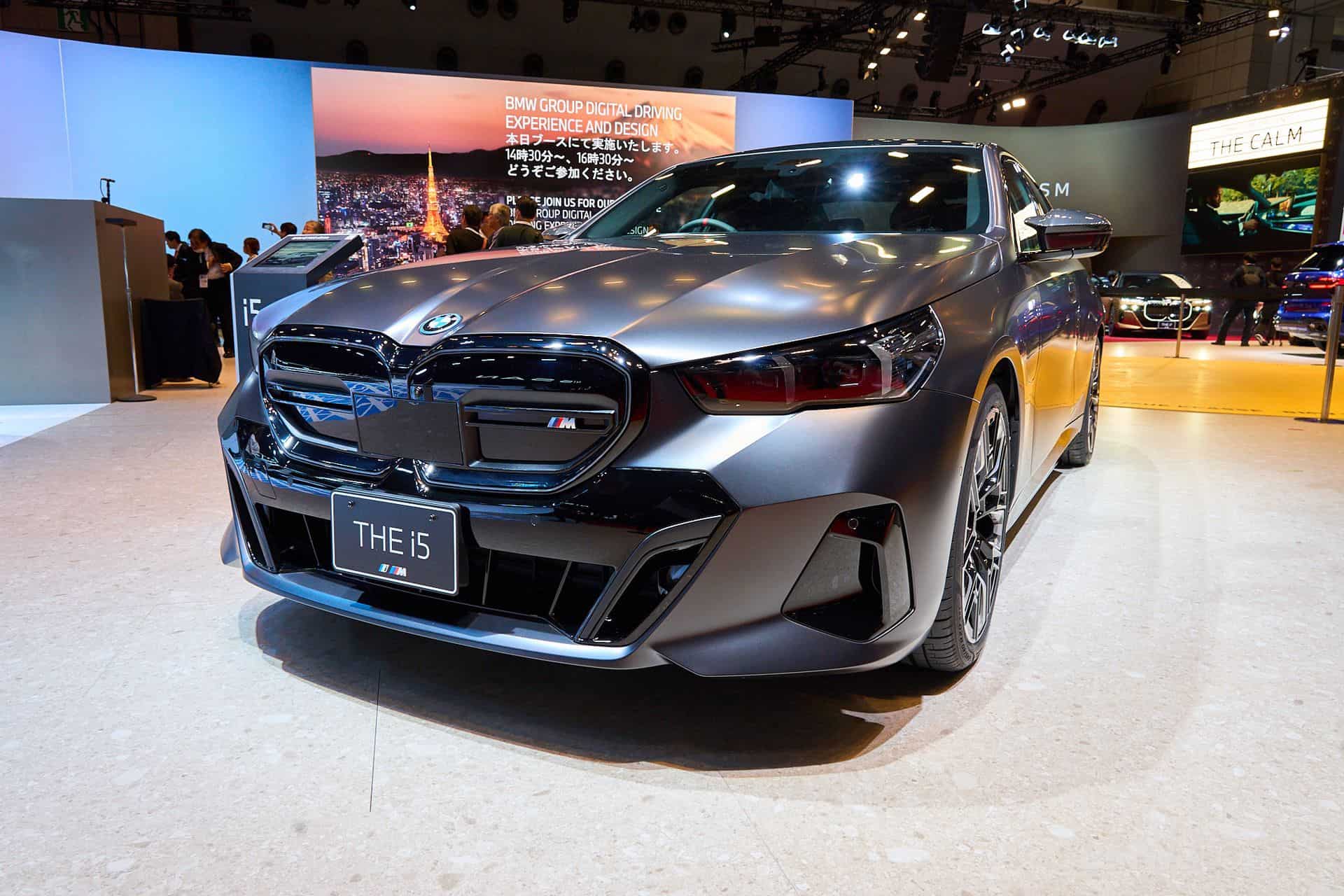 With the i5 M60, BMW wants you to forget all about the gasoline-fueled M550i and its brawny twin-turbo 4.4-liter V8 engine and opt instead for the purely electric M Performance version. The new 5 Series has arrived at the 2023 Japan Mobility Show with matte paint, dual motors, and plenty of carbon fiber goodies. It’s dressed to impress in Pure Frozen Grey from the Individual catalog and has the optional Shadowline headlights with darkened lenses for a meaner look.