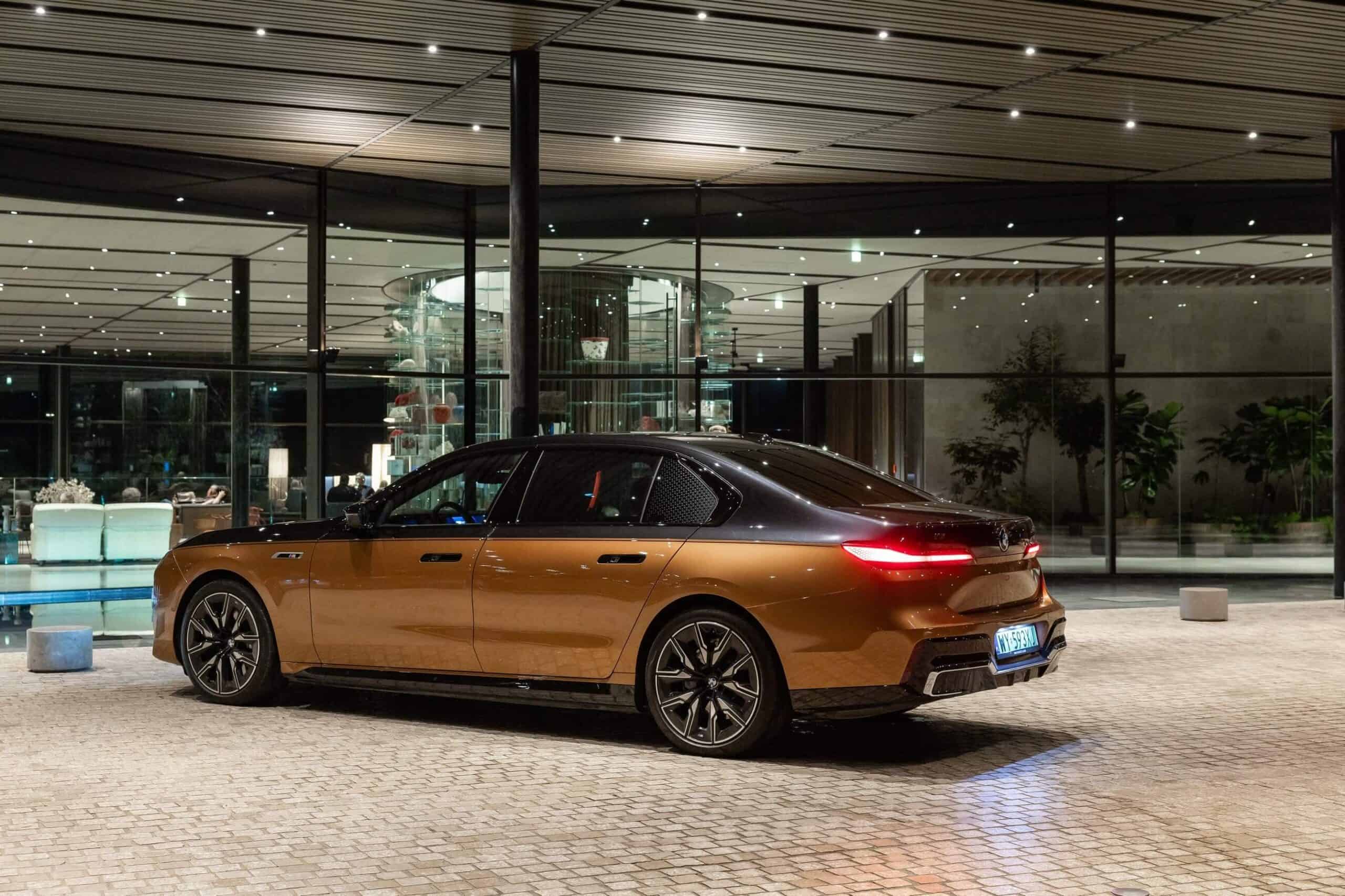 The i7 M70 is among the most expensive BMWs money can buy, right up there with the XM Label Red. It starts at $168,500 in the United States but what you’re seeing here is not a standard car. With the G70 generation, the 7 Series is finally available with a two-tone paint as a regular production model rather than a limited-run special edition. This is perhaps the most striking combo you can have, Liquid Copper with Sapphire Black, all for a cool $12,000.