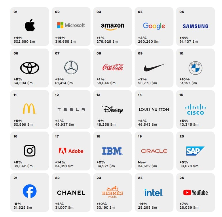 Neither MINI nor Rolls-Royce made it to the top 100. Interbrand notes Nespresso is this year’s only new entrant (#98) and Apple is the only company to reach half a trillion dollars in brand value. The combined values of the 100 companies listed increased by 5.7% compared to last year, reaching $3.3 trillion. However, the growth slowed down considering in 2022, the total value jumped by 16% over 2021.