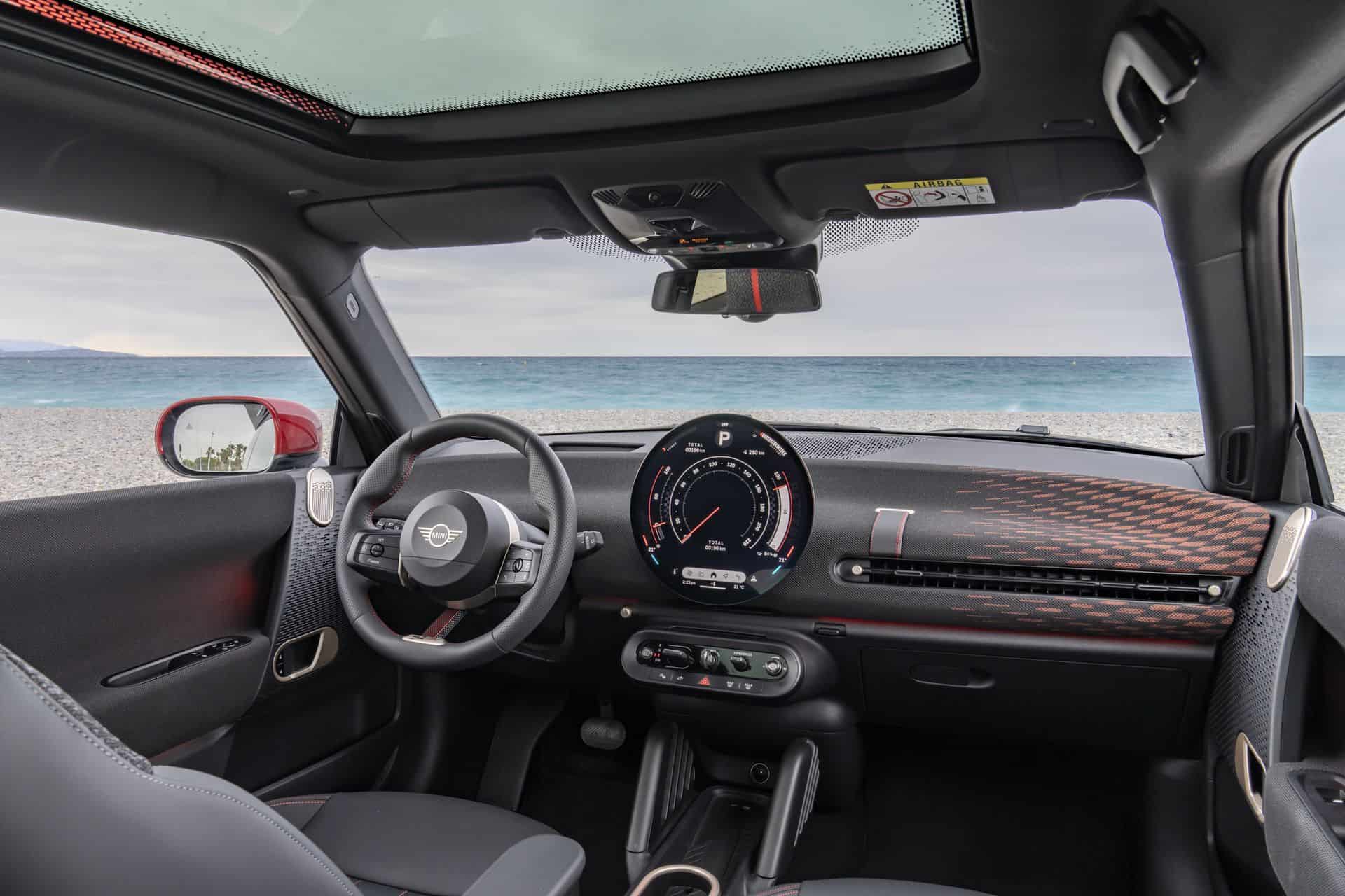 Step inside the MINI Cooper SE in John Cooper Works Trim, and you’ll find a racing-inspired interior. The JCW seats, featuring synthetic leather with red stitching and multi-colored knitted material, deliver a distinctive look. The black and red color concept extends to the door and dashboard, with the passenger side adorned with a distinctive JCW-specific pattern resembling a chequered flag.
