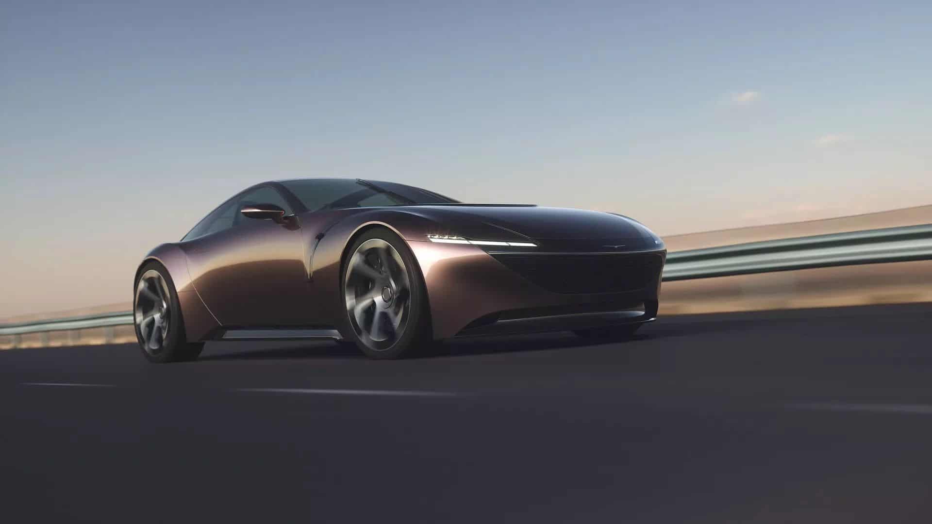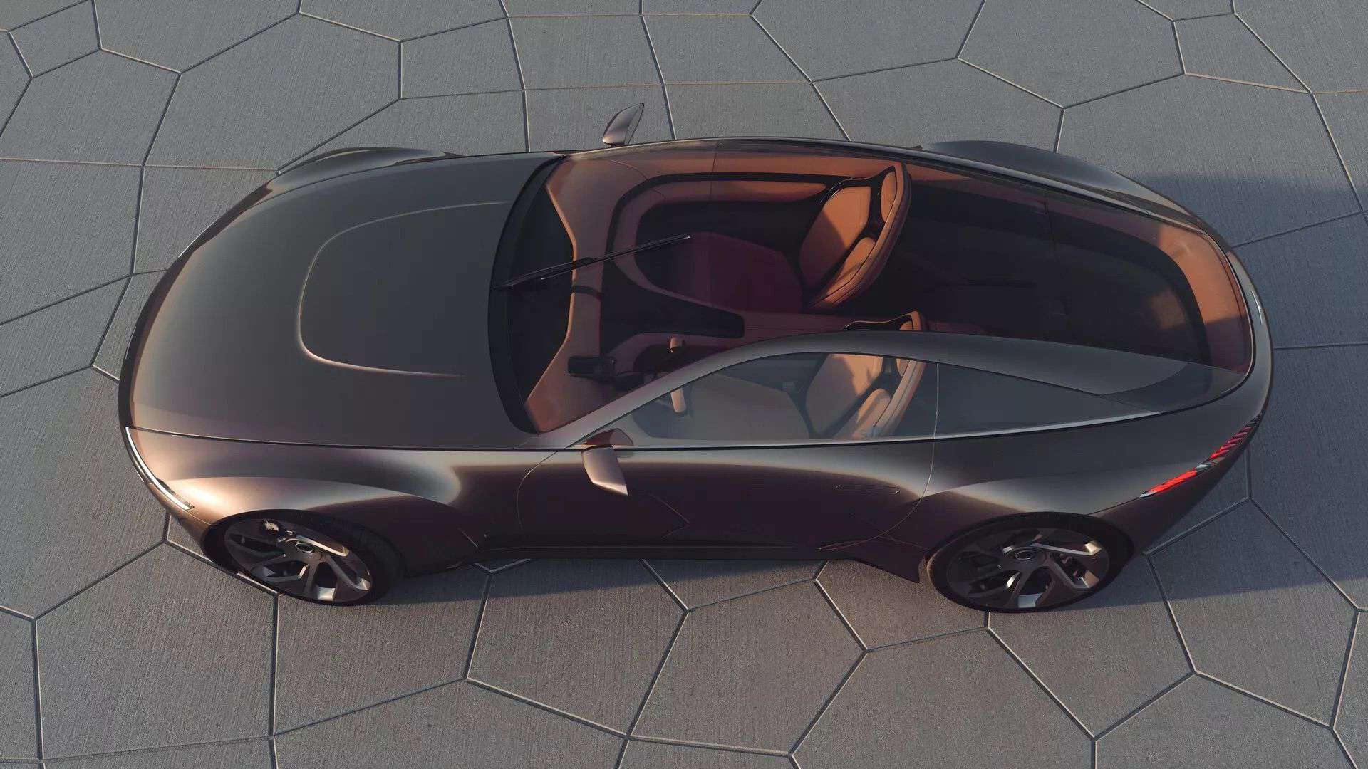 The front fascia is dominated by a large grille that integrates the headlights and sensors, creating a distinctive and aggressive expression. The side profile is characterized by a dynamic beltline that rises towards the rear, where it meets the muscular fenders and the sculpted tail lights. The roofline is low and sloping, enhancing the sporty and coupe-like silhouette. The rear end and taillights exhibit elements reminiscent of the Ferrari Roma and BMW Z8, while the front grille insert reflects subtle influences from Aston Martin’s design, echoed in the domed hood.