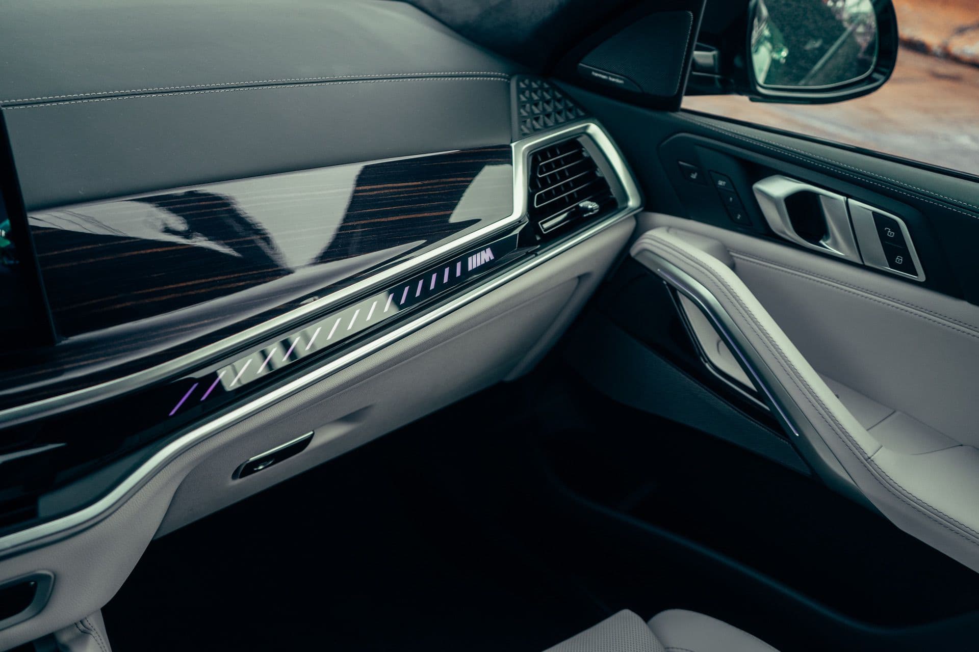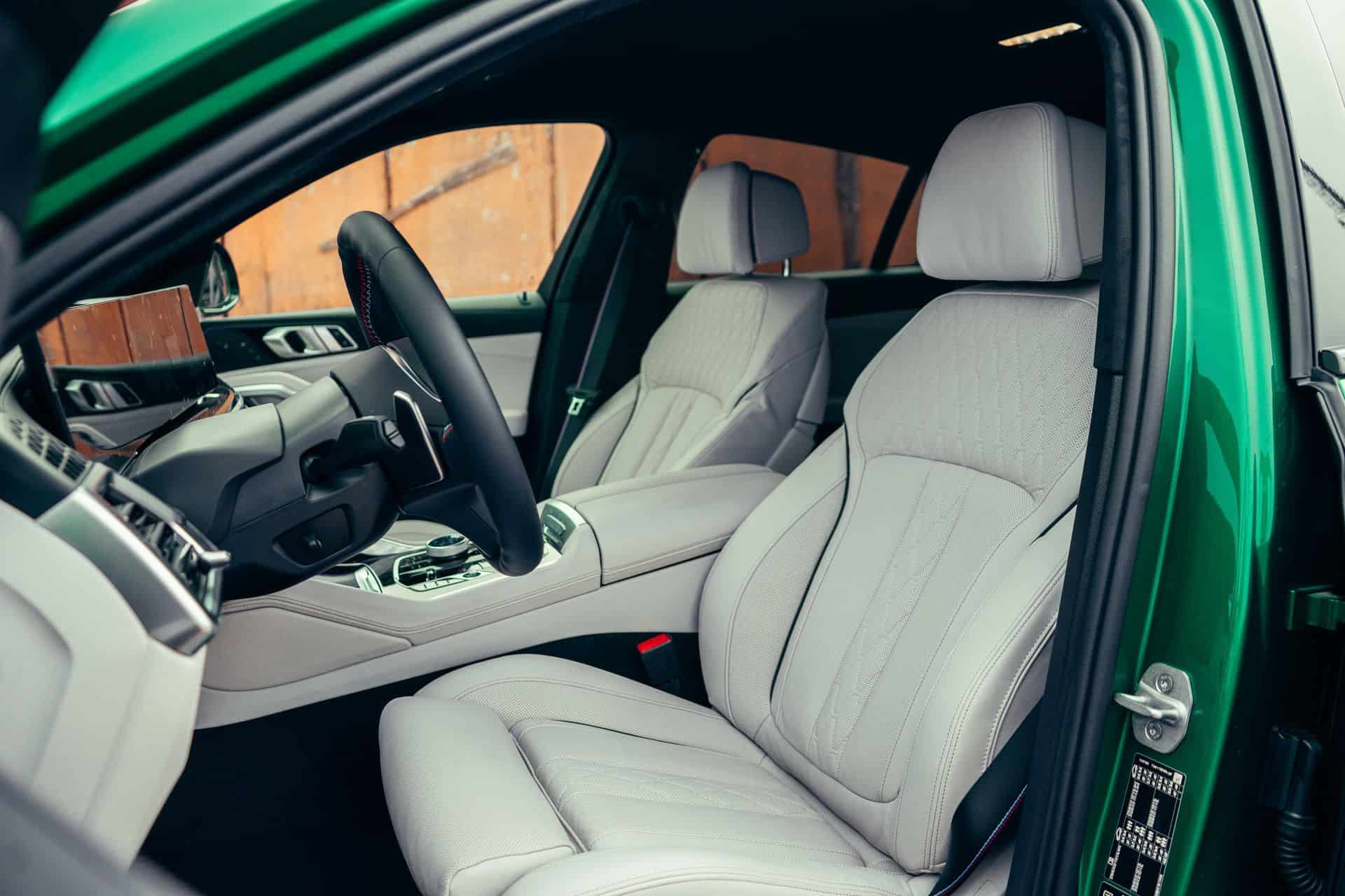 Design wise, the BMW X6 M60i received sleeker headlights adorned with arrow-shaped daytime running lights and an upgraded kidney grille that proudly showcases the iconic M logo. Taking a cue from recent M Performance models, the X6 M60i also showcases sportier-looking side mirrors, a design element previously exclusive to true M models until 2022. Adding to its already quirky presence, the X6 M60i now boasts a sleek glossy black spoiler on the tailgate, enhancing the imposing look of its rear. This effect is further accentuated by the quad exhaust tips. Also, the Isle of Man Green color works beautifully on the shape of the X6. The hue changes emphasizes the aggressive lines of the SAC, especially with the shadows adorning the sides of the car.