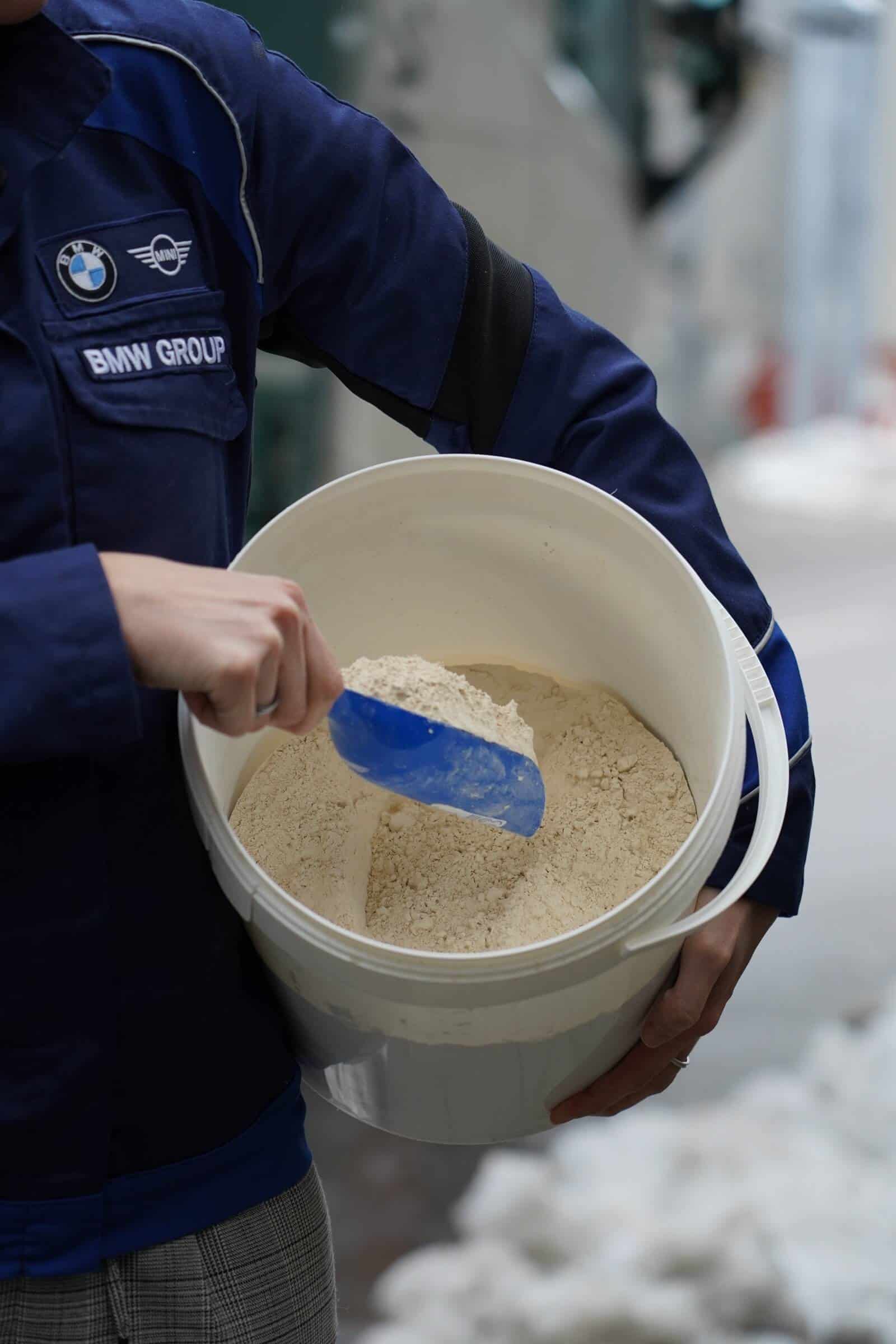 BMW procures limestone powder extracted from the Keilberg mountains near Regensburg. Weekly, three trucks transport this mineral material to the Dingolfing factory, while two trucks make the journey to the Regensburg plant. Approximately 20 kilograms (44 pounds) are utilized for each car before being recycled, primarily serving as a raw material for cement.