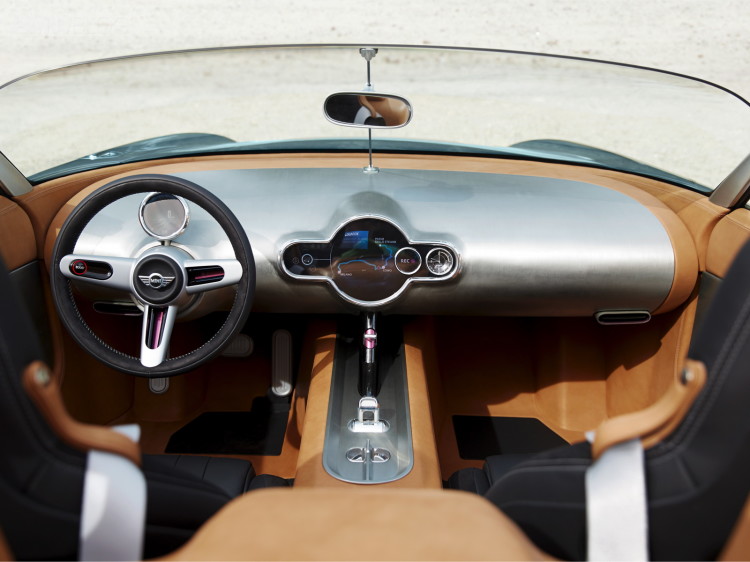 The body of the car is made of hand-crafted aluminum panels, which give it a sleek and aerodynamic shape. The front grille, the headlights and the tail lights are all LED-based, creating a modern and futuristic look. The unique interior uses a single untreated sheet of aluminum for the rounded dashboard fascia and large centrally mounted monitor that harks back to the instrument panel used on the original MINI.