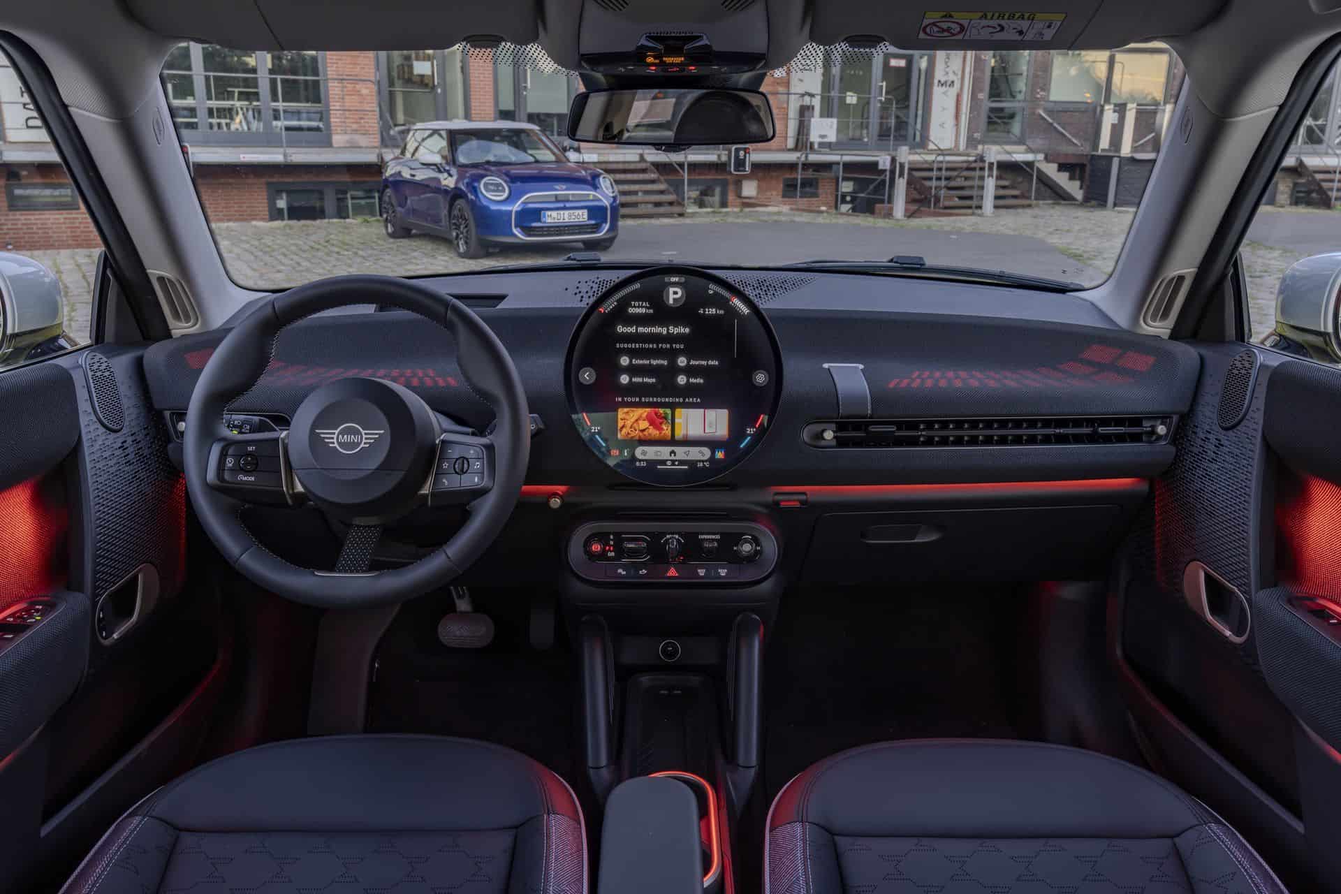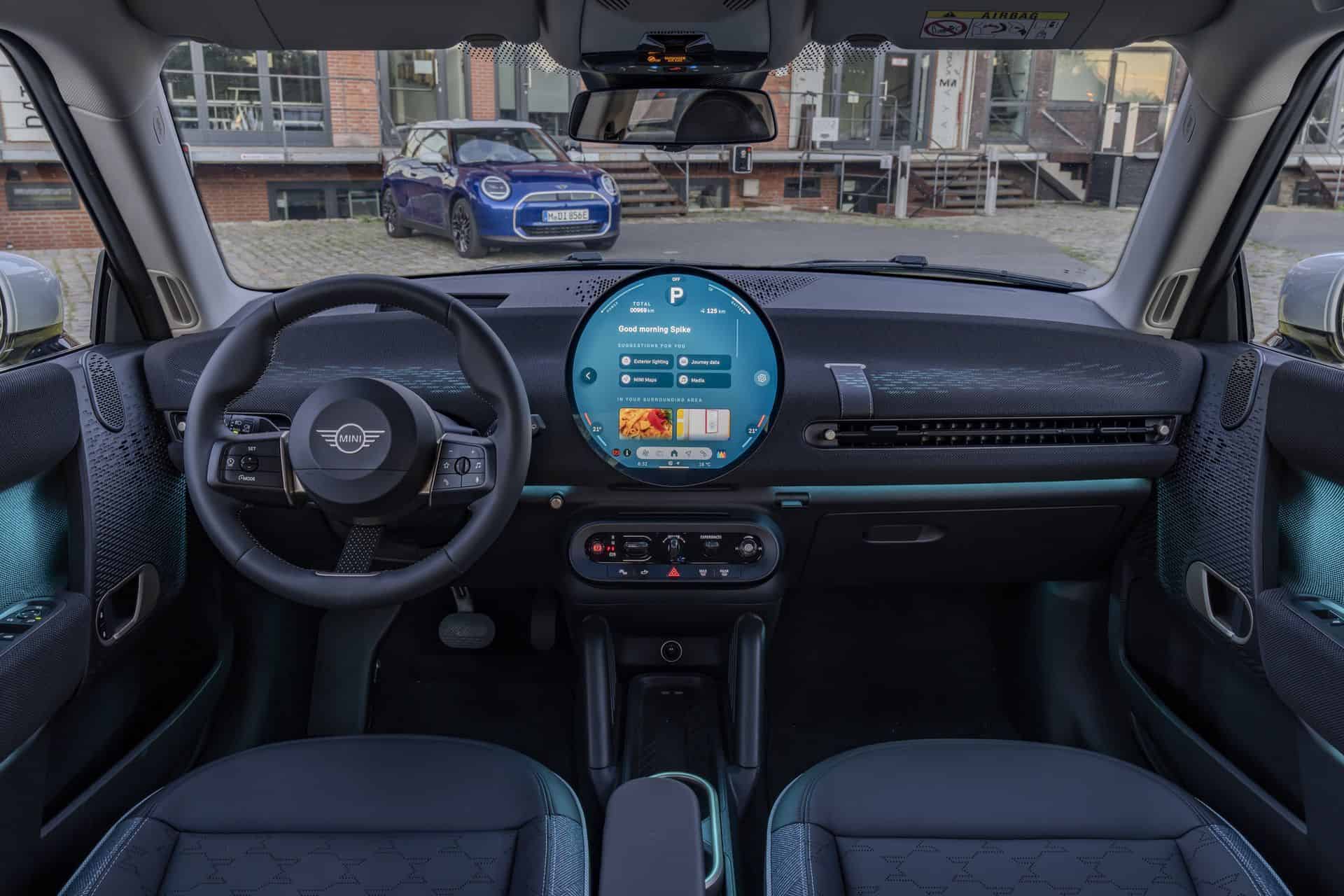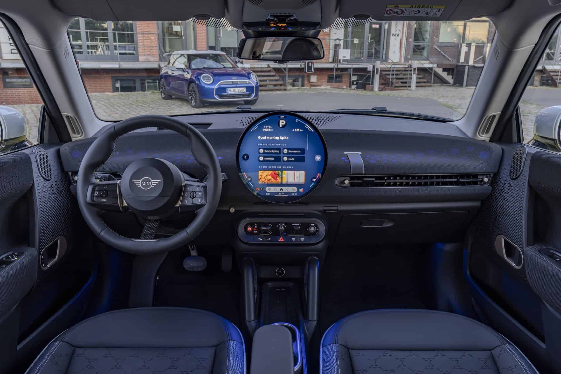 Inside, the cockpit is a testament to MINI’s commitment to style and sustainability. Surfaces are adorned with a two-tone black and blue knit material, setting a stylish backdrop for the high-quality Vescin synthetic leather seats. Available in gray or black, these seats feature a perforated houndstooth pattern, marrying comfort with a keen eye for design.