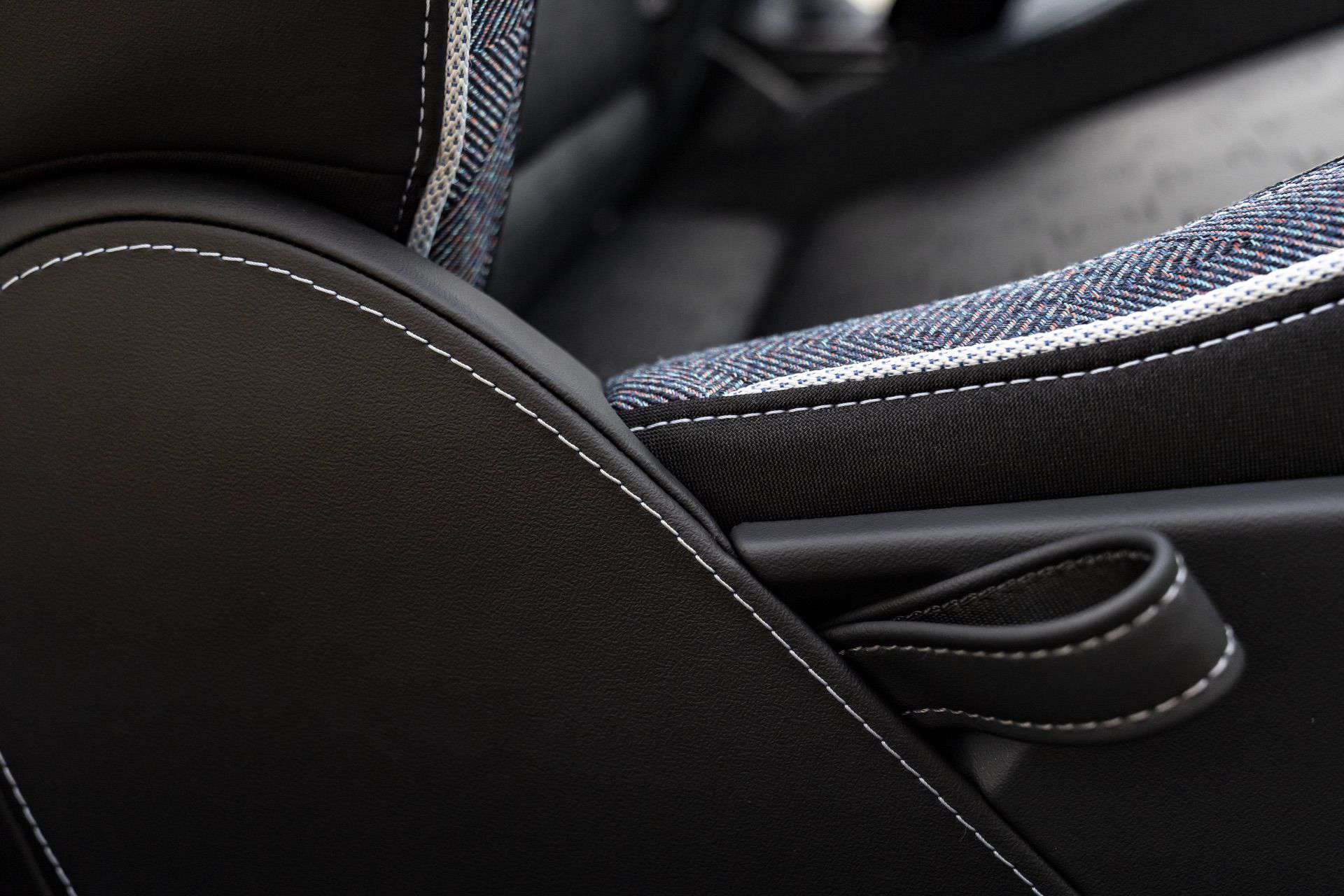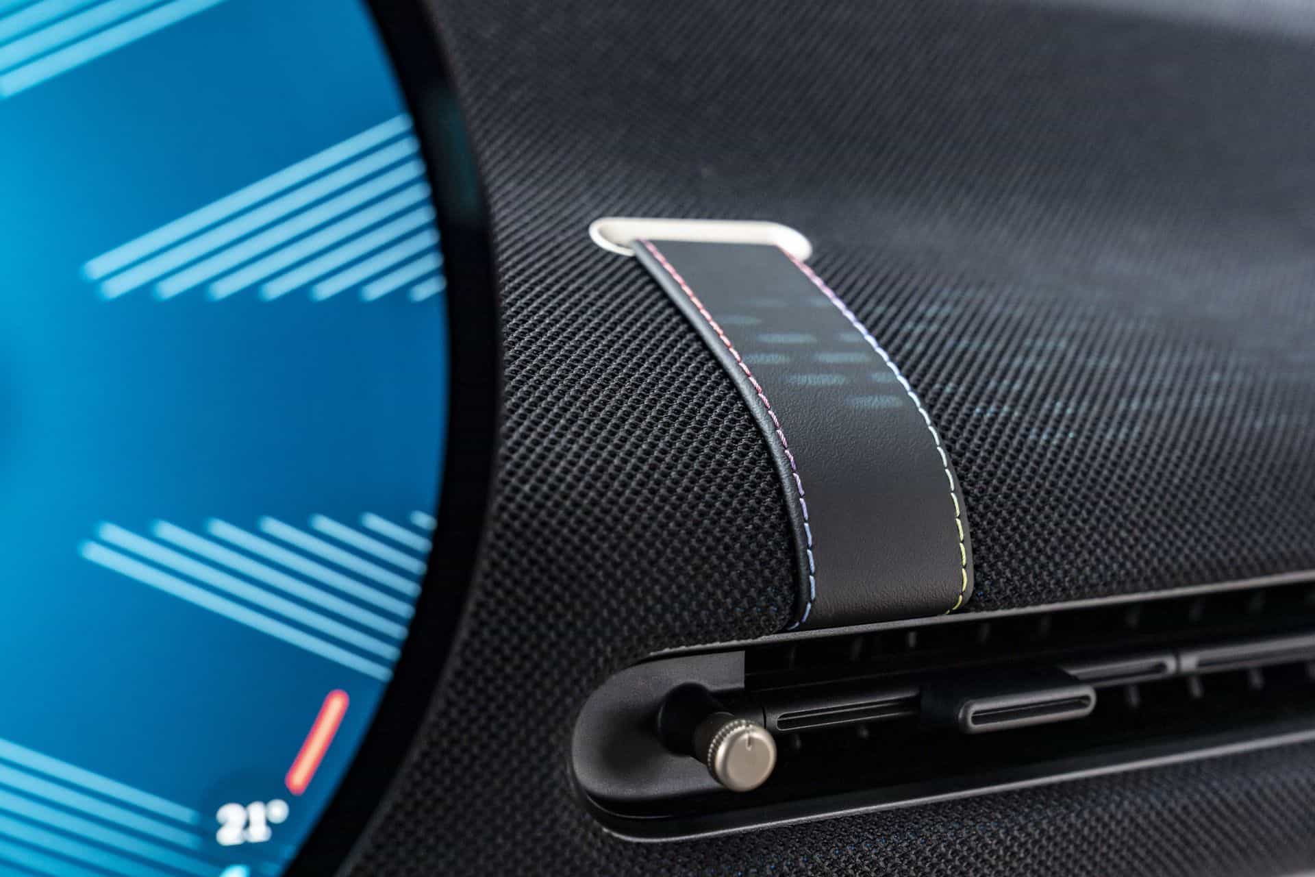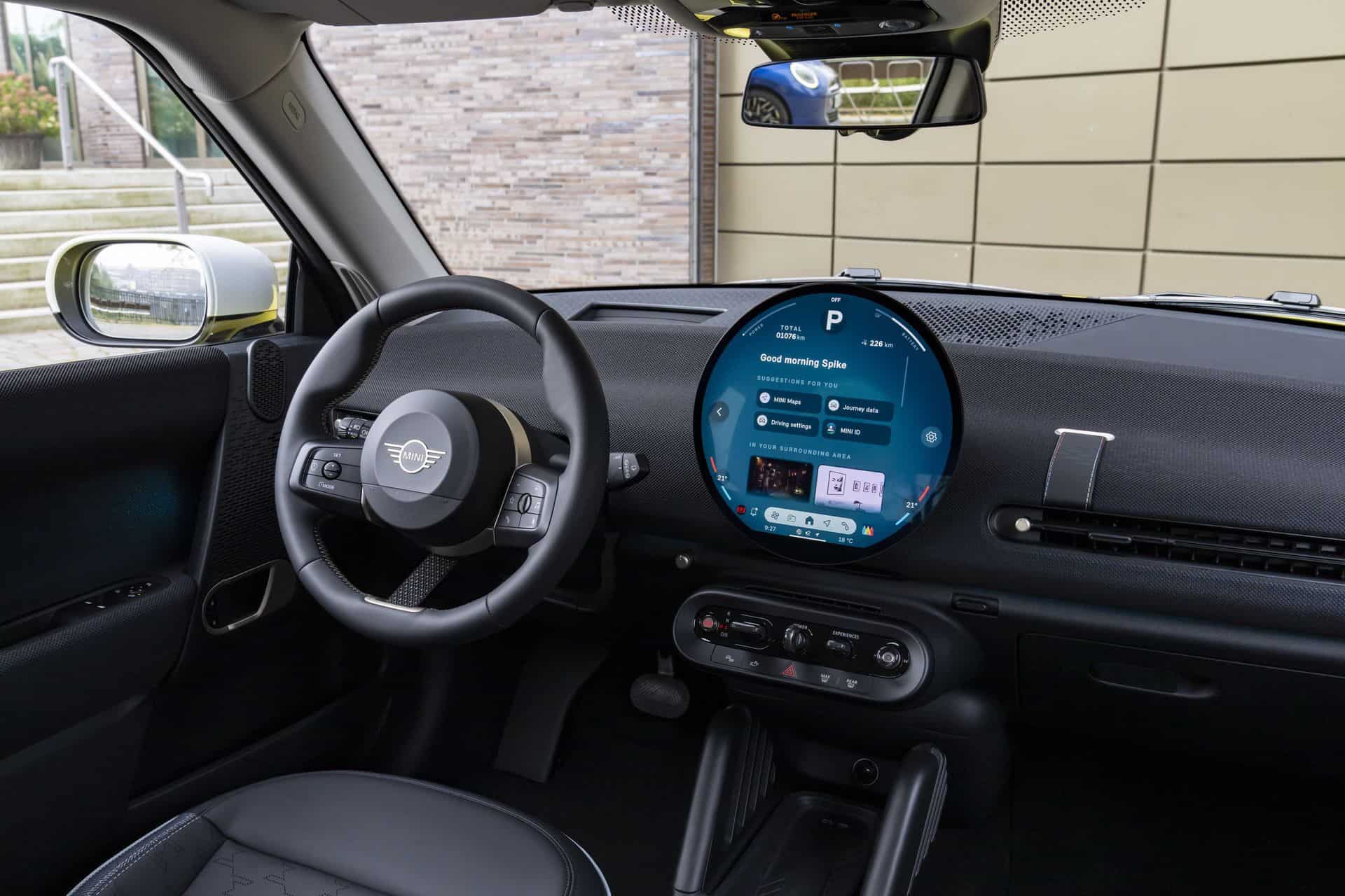 Inside, the cockpit is a testament to MINI’s commitment to style and sustainability. Surfaces are adorned with a two-tone black and blue knit material, setting a stylish backdrop for the high-quality Vescin synthetic leather seats. Available in gray or black, these seats feature a perforated houndstooth pattern, marrying comfort with a keen eye for design.